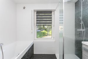 Op de eerste verdieping vind je drie ruime slaapkamers, waarvan de hoofdslaapkamer voorzien is van airconditioning voor optimaal comfort. Verder is er een apart toilet, een handige wasruimte met witgoedaansluitingen, en een luxe badkamer. De badkamer is uitgerust met een inloopdouche, ligbad, moderne wastafel met meubel, mechanische ventilatie én elektrische vloerverwarming.
