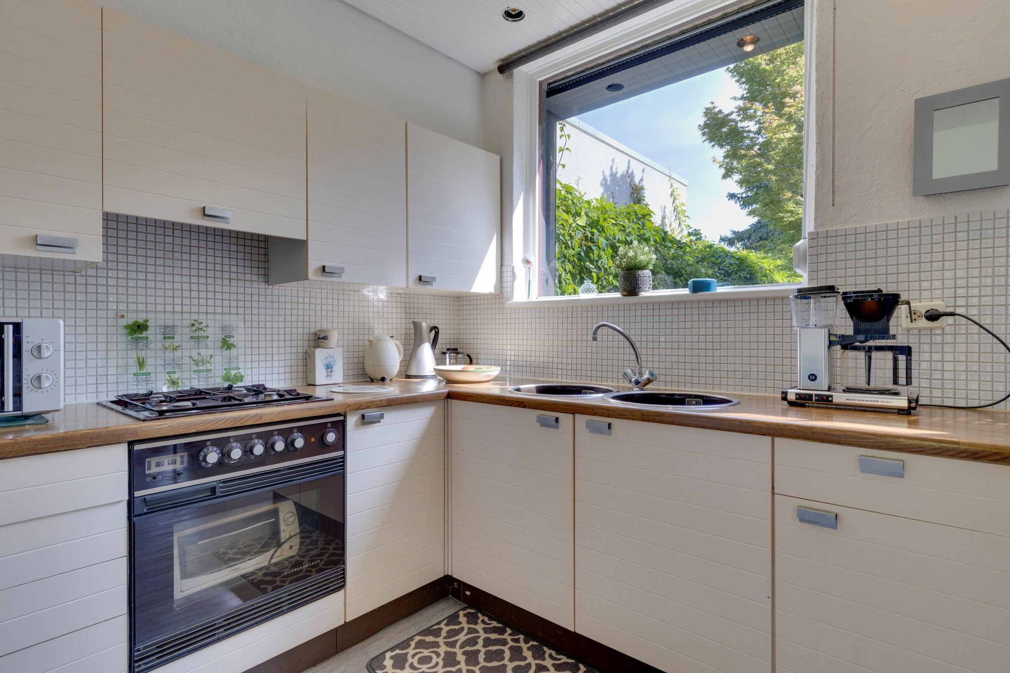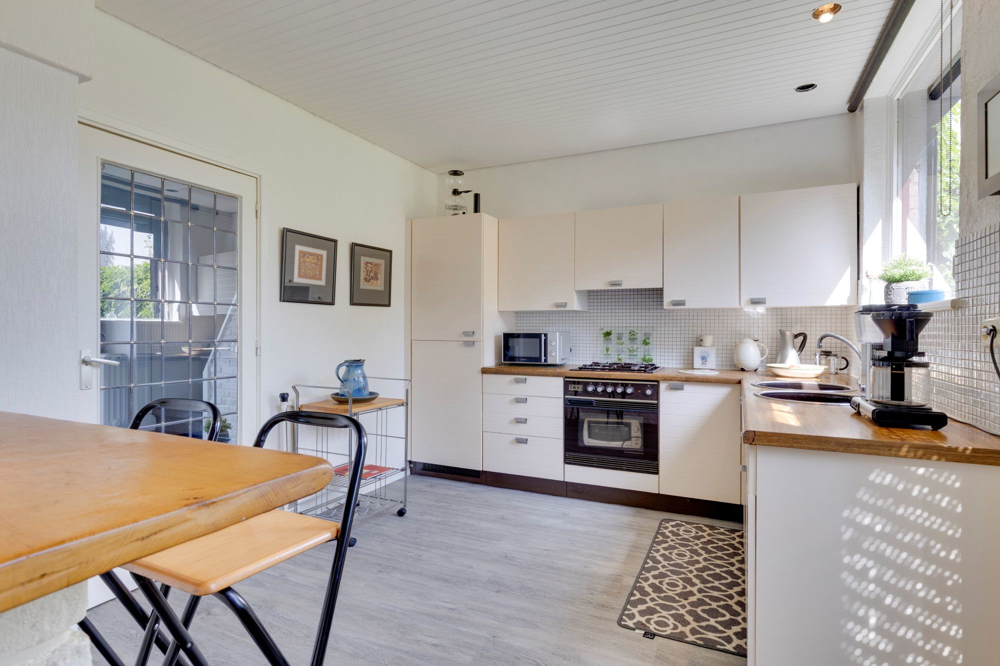 Via de hal toegang tot de ruime open keuken (v.v. laminaatvloer) in hoekopstelling v.v. 4-pits gaskookplaat, koelkast, vriezer, wasemkap en dubbele wastafel.