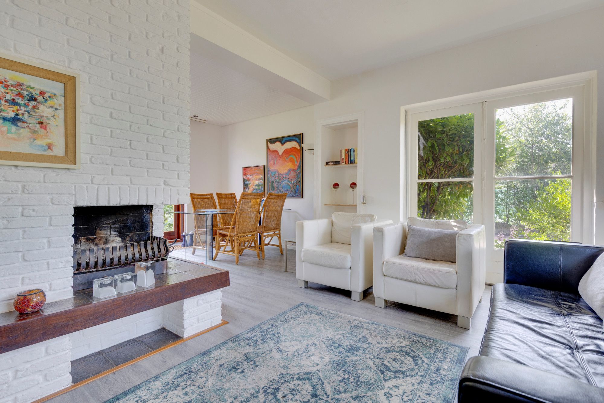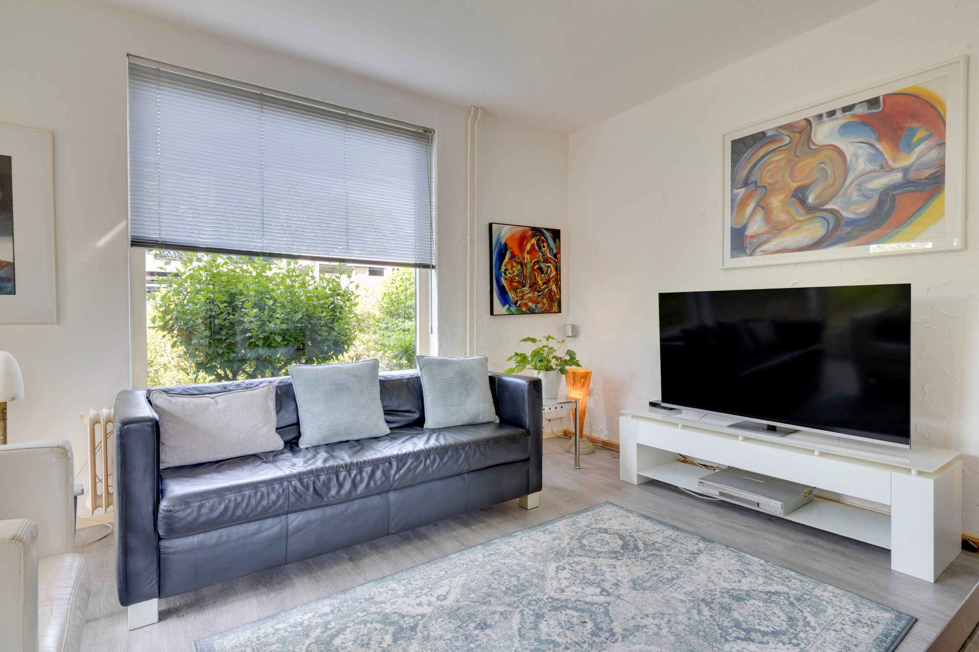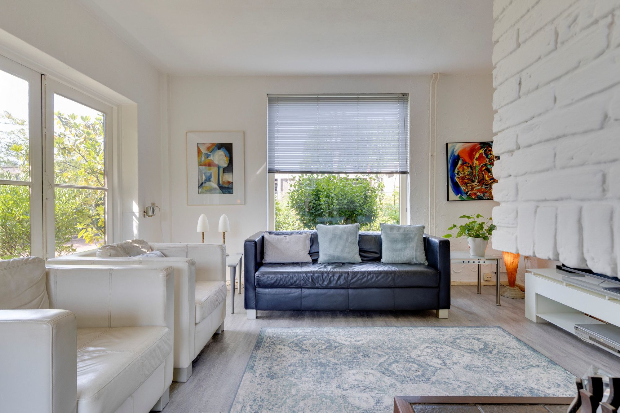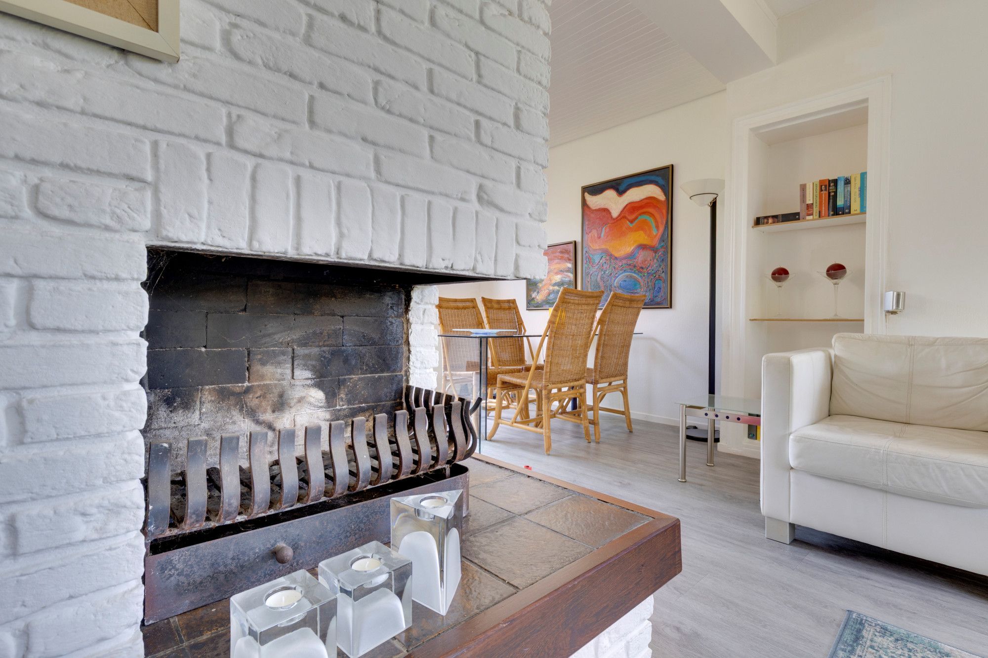 Ruime L-woonkamer v.v. laminaatvloer, open haardpartij, schuifpui naar het achtergelegen terras en openslaande deuren naar zij-tuin.