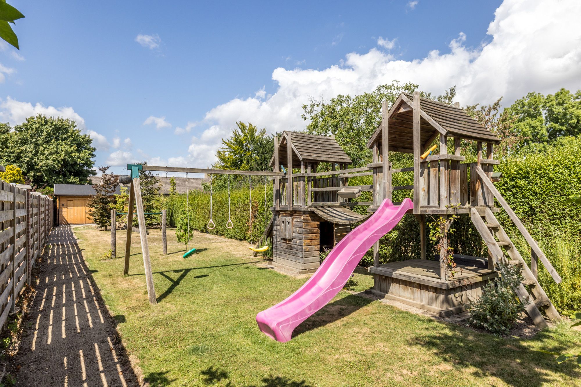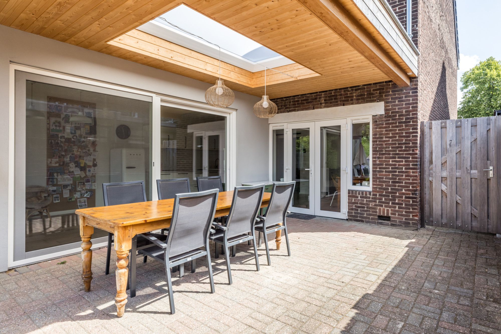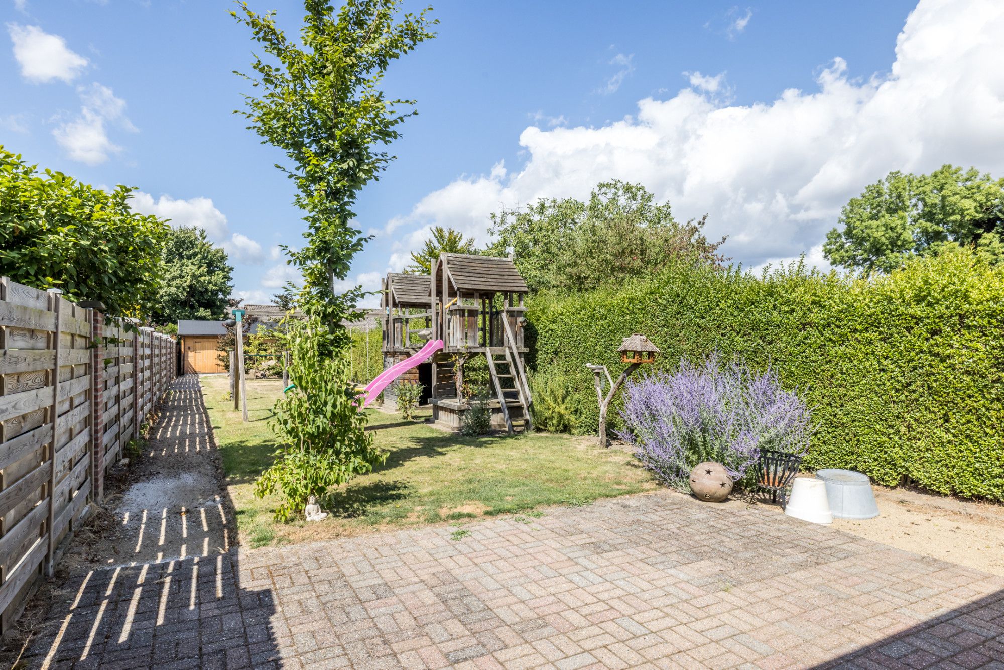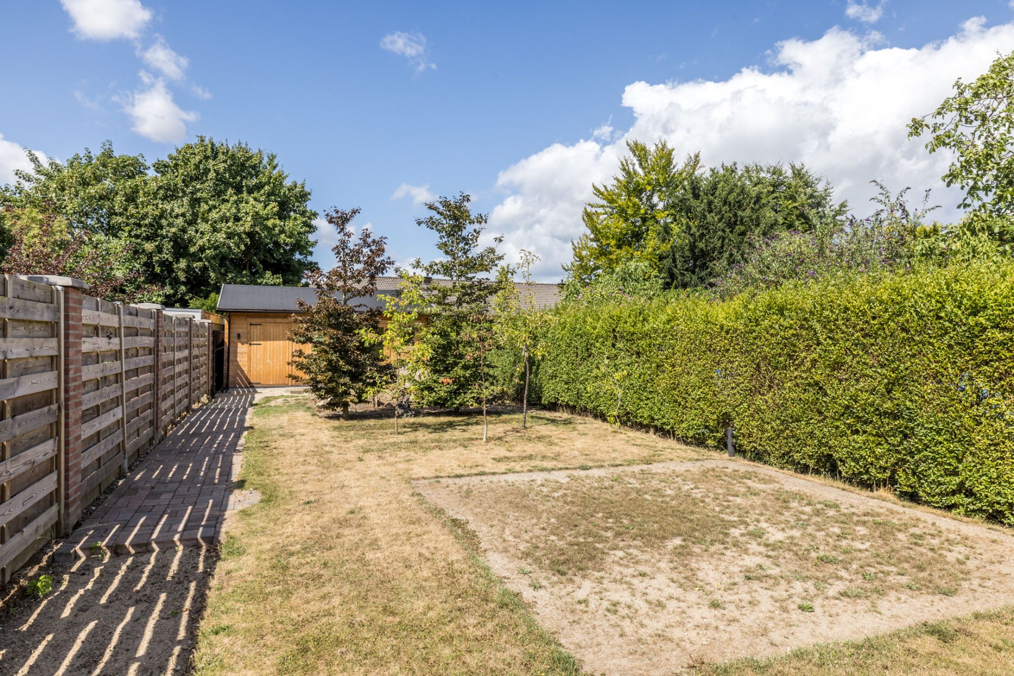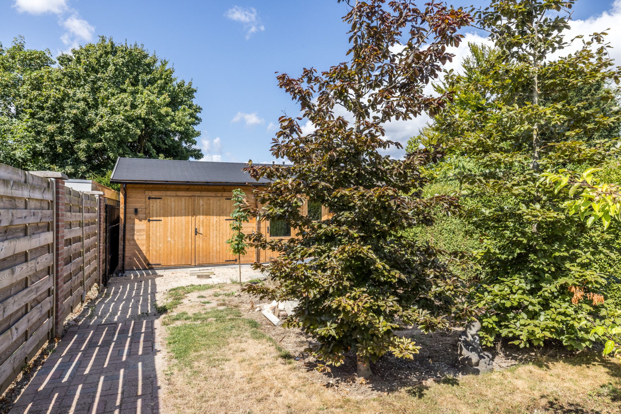 De diepe, zonnige achtertuin op het zuidwesten is geheel omsloten en verzorgd aangelegd met een gazon, borders, een ruim overdekt terras met lichtkoepel en een zij-ingang. Achter in de tuin bevindt zich een vrijstaande houten tuinberging met aparte opslag én een multifunctionele hobbyruimte.