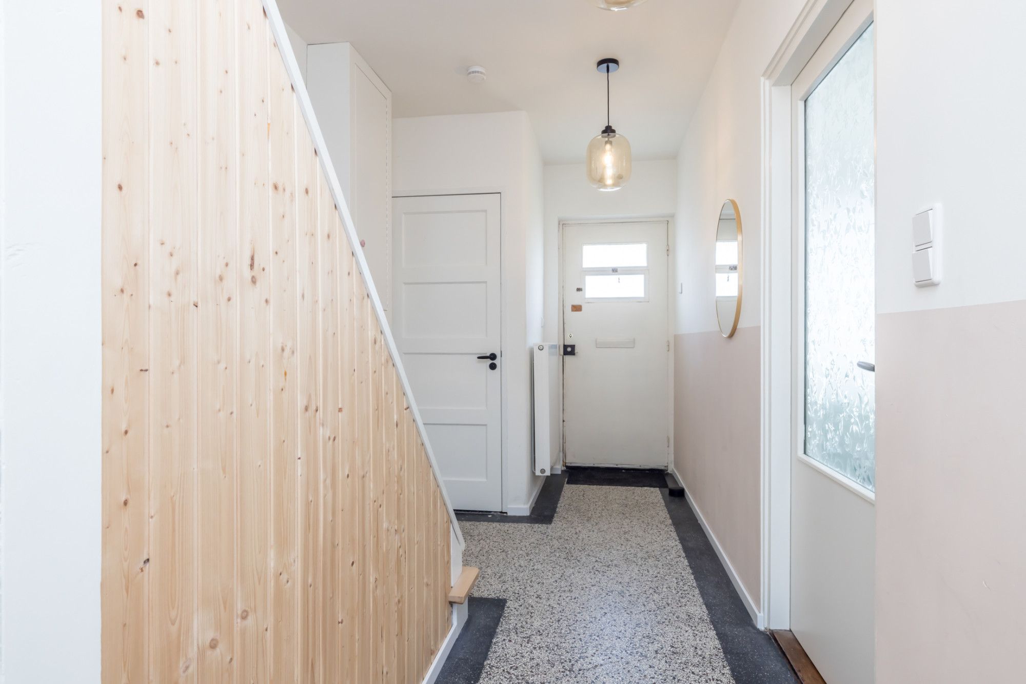 Entree/gang met traditionele terrazzo vloer en klassiek trappenhuis naar de verdieping en een garderobekast. Meterkast met 12 groepsinstallatie / 4x aardlekschakelaar / kookgroep / digitale meters en dag-/nachtstroomaansluiting. Modern strak gastentoilet met zwevend wandcloset. Toegang tot de woonkamer, keuken en de kelder.