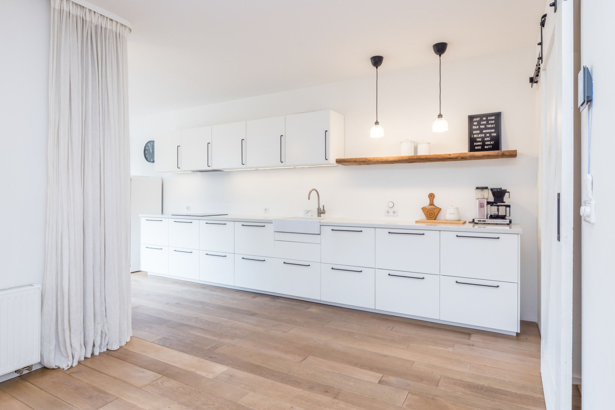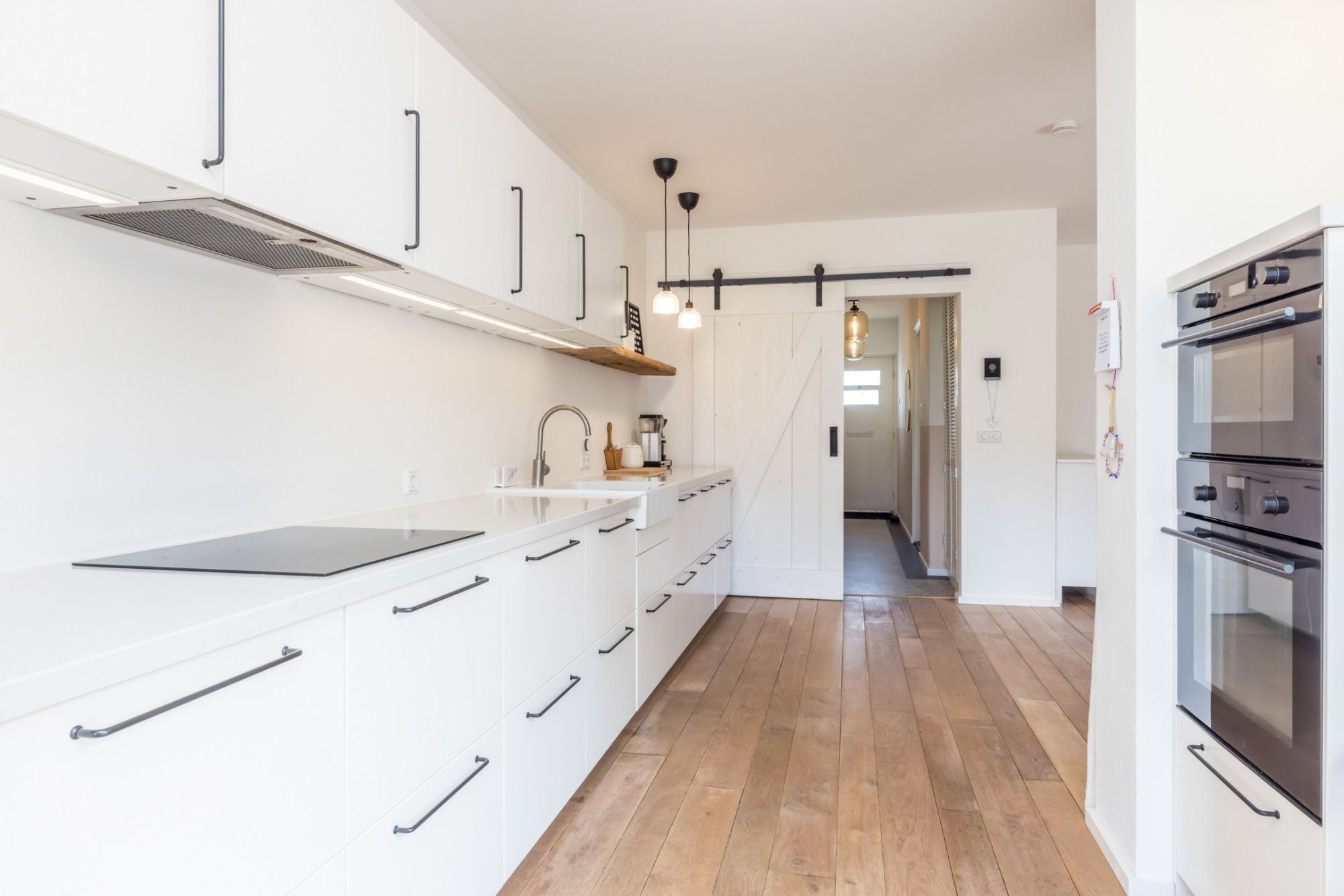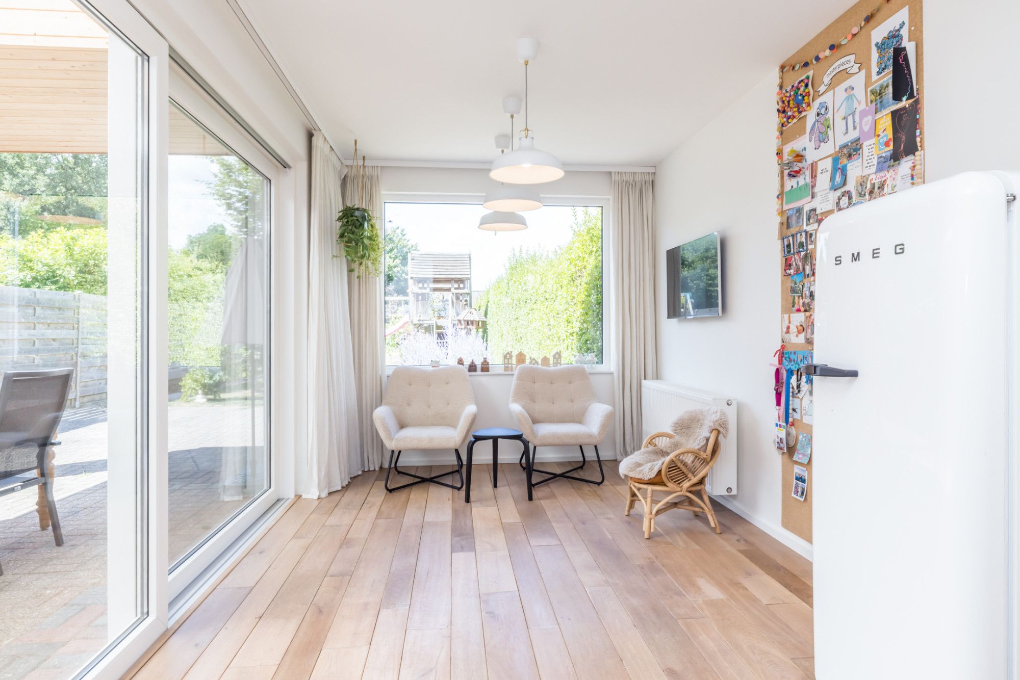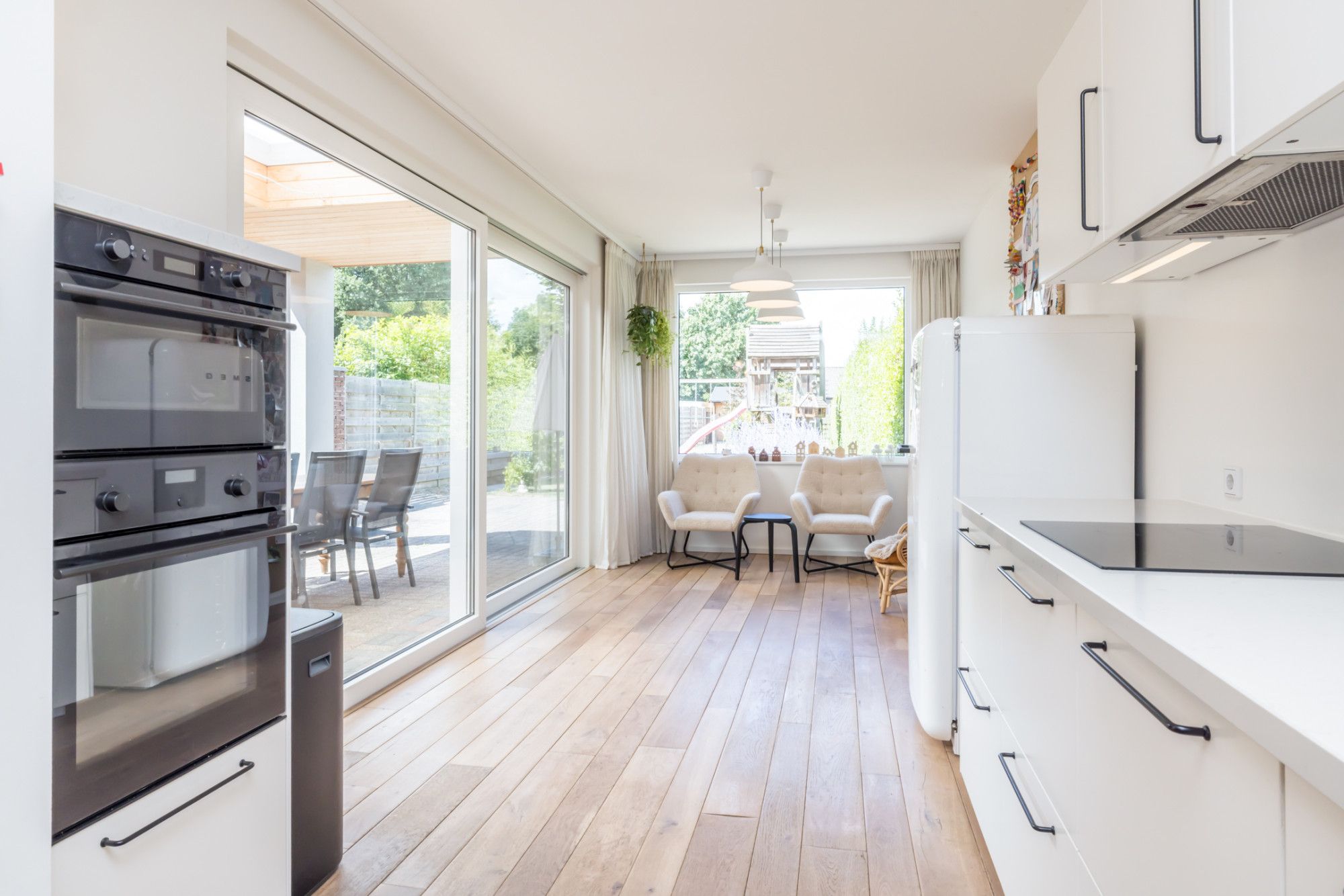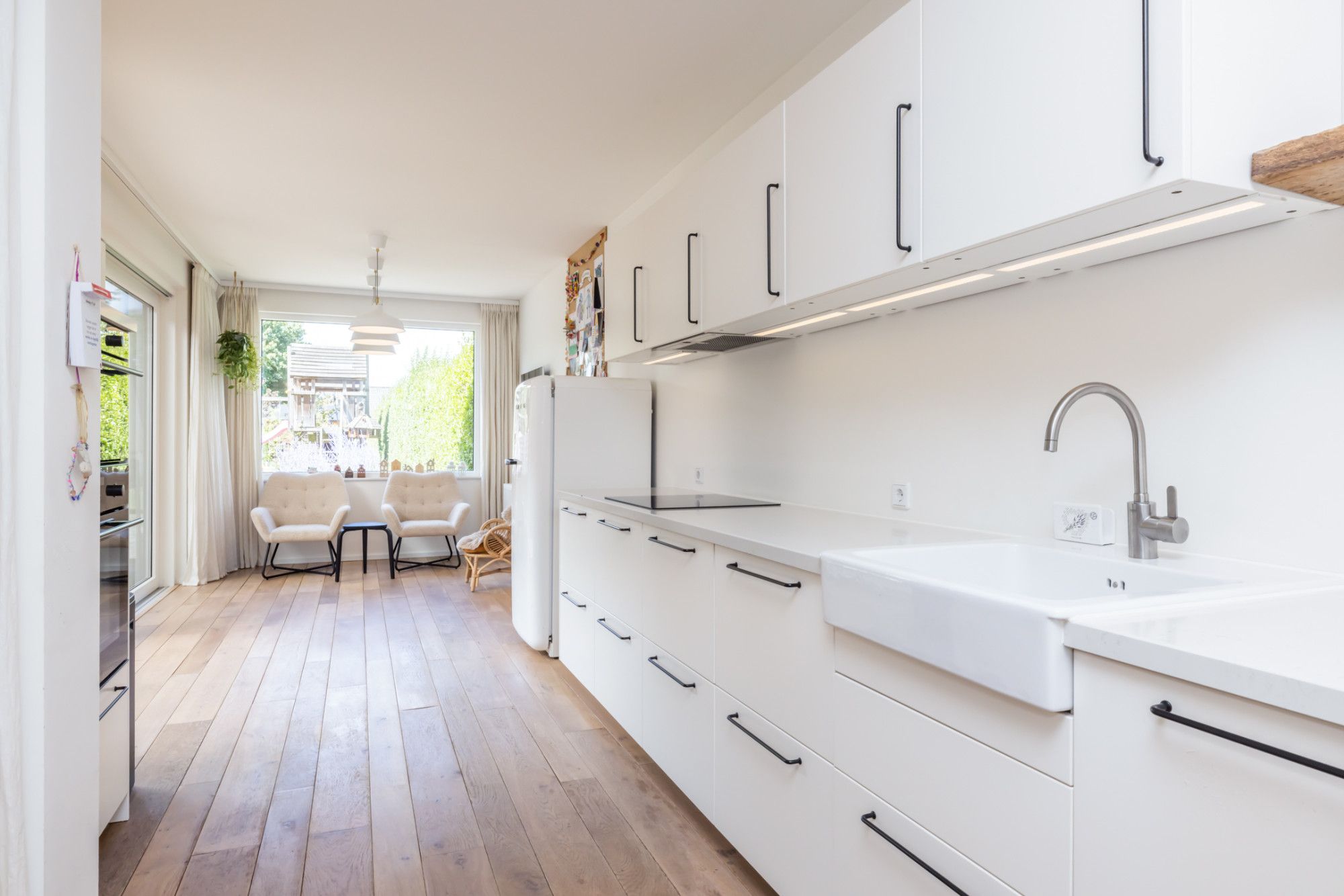De royale aanbouw biedt een lichte, moderne keukenruimte met een eigentijdse witte inbouwkeuken met zwarte grepen, voorzien van diverse inbouwapparatuur, een composiet werkblad en veel opbergruimte. Een stijlvol loftdeur detail leidt naar de hal, terwijl aan de achterzijde een gezellige zithoek met schuifpui de verbinding vormt met het terras en de tuin.