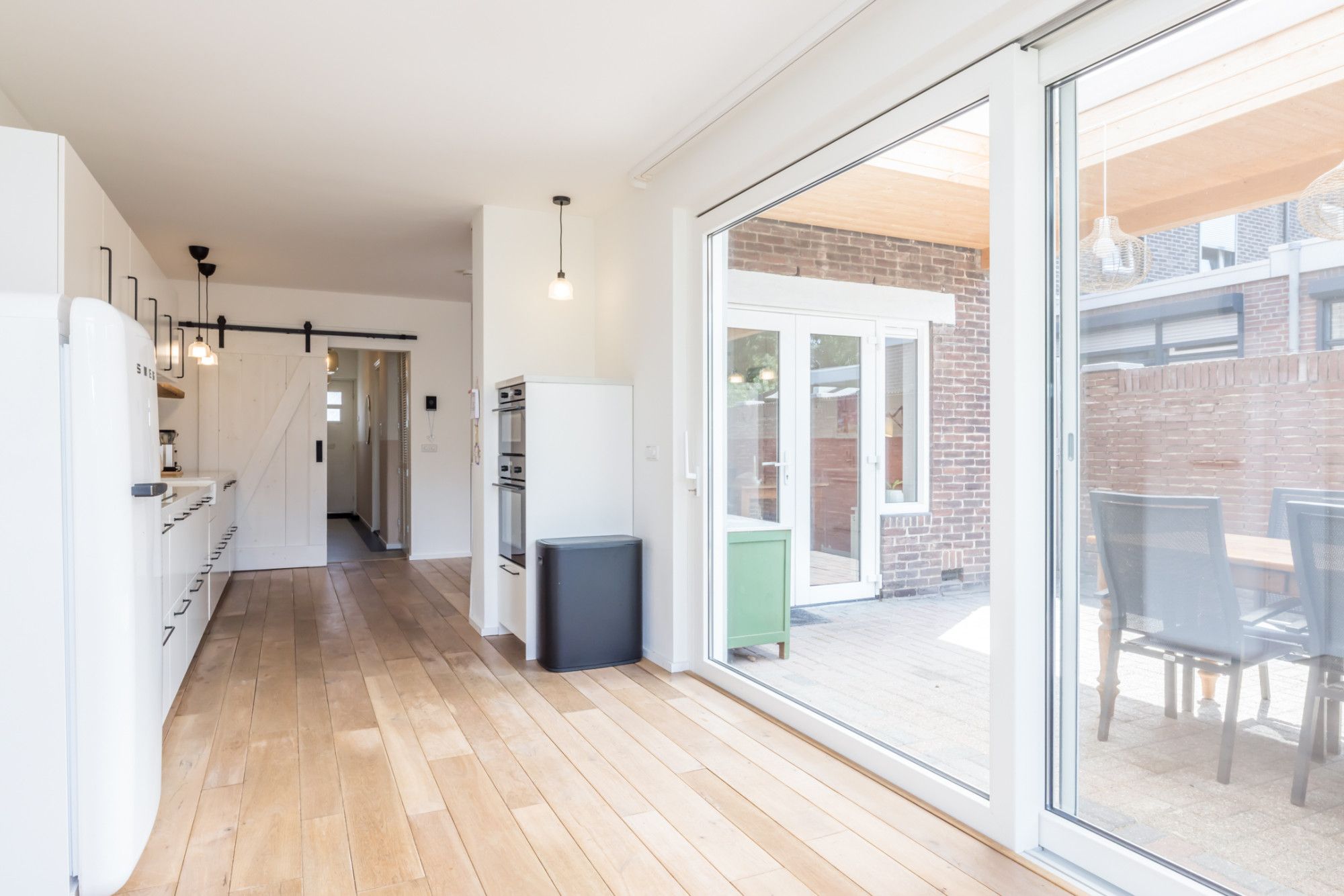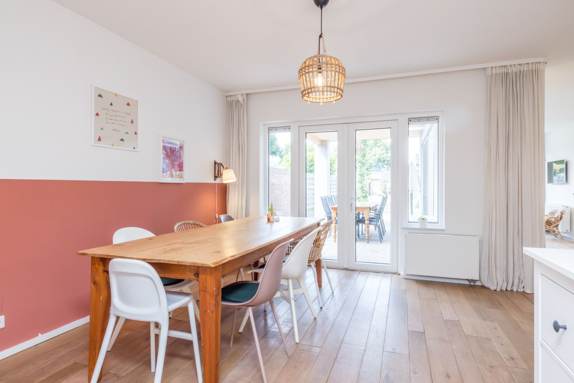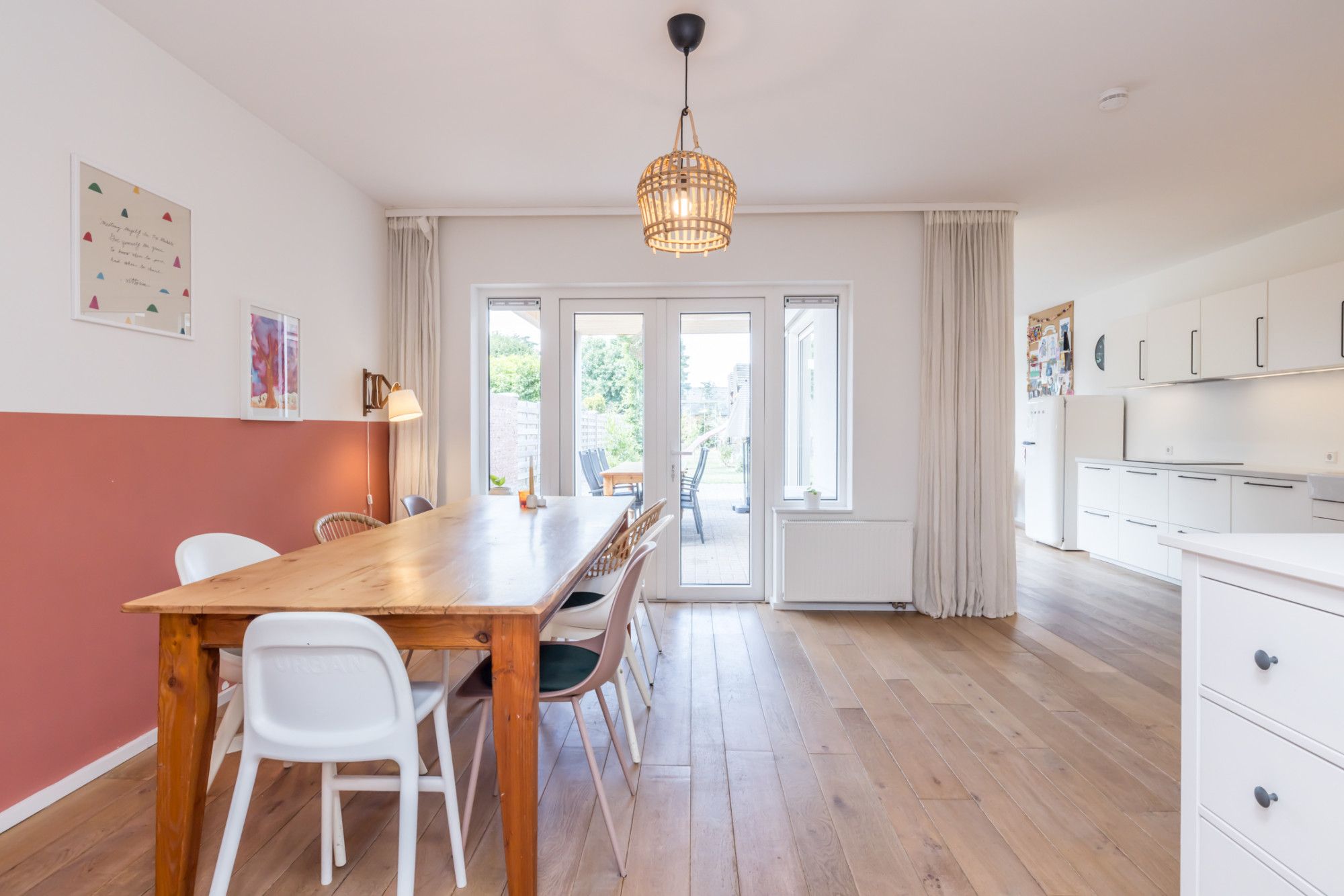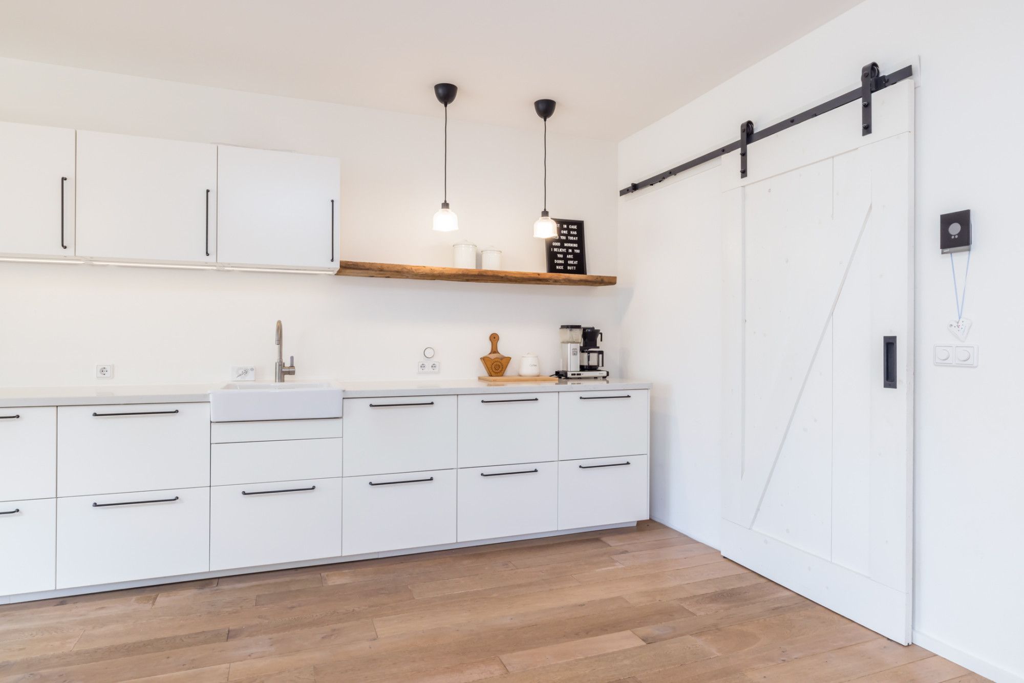 De royale aanbouw biedt een lichte, moderne keukenruimte met een eigentijdse witte inbouwkeuken met zwarte grepen, voorzien van diverse inbouwapparatuur, een composiet werkblad en veel opbergruimte. Een stijlvol loftdeur detail leidt naar de hal, terwijl aan de achterzijde een gezellige zithoek met schuifpui de verbinding vormt met het terras en de tuin.