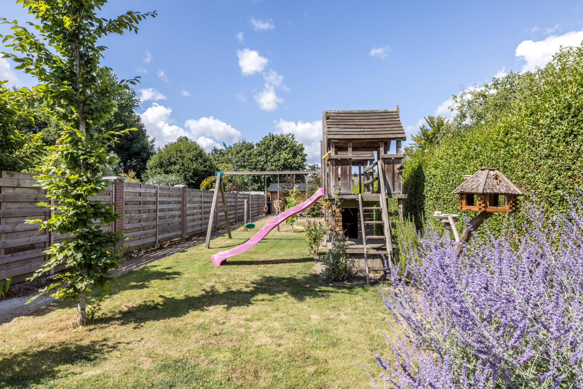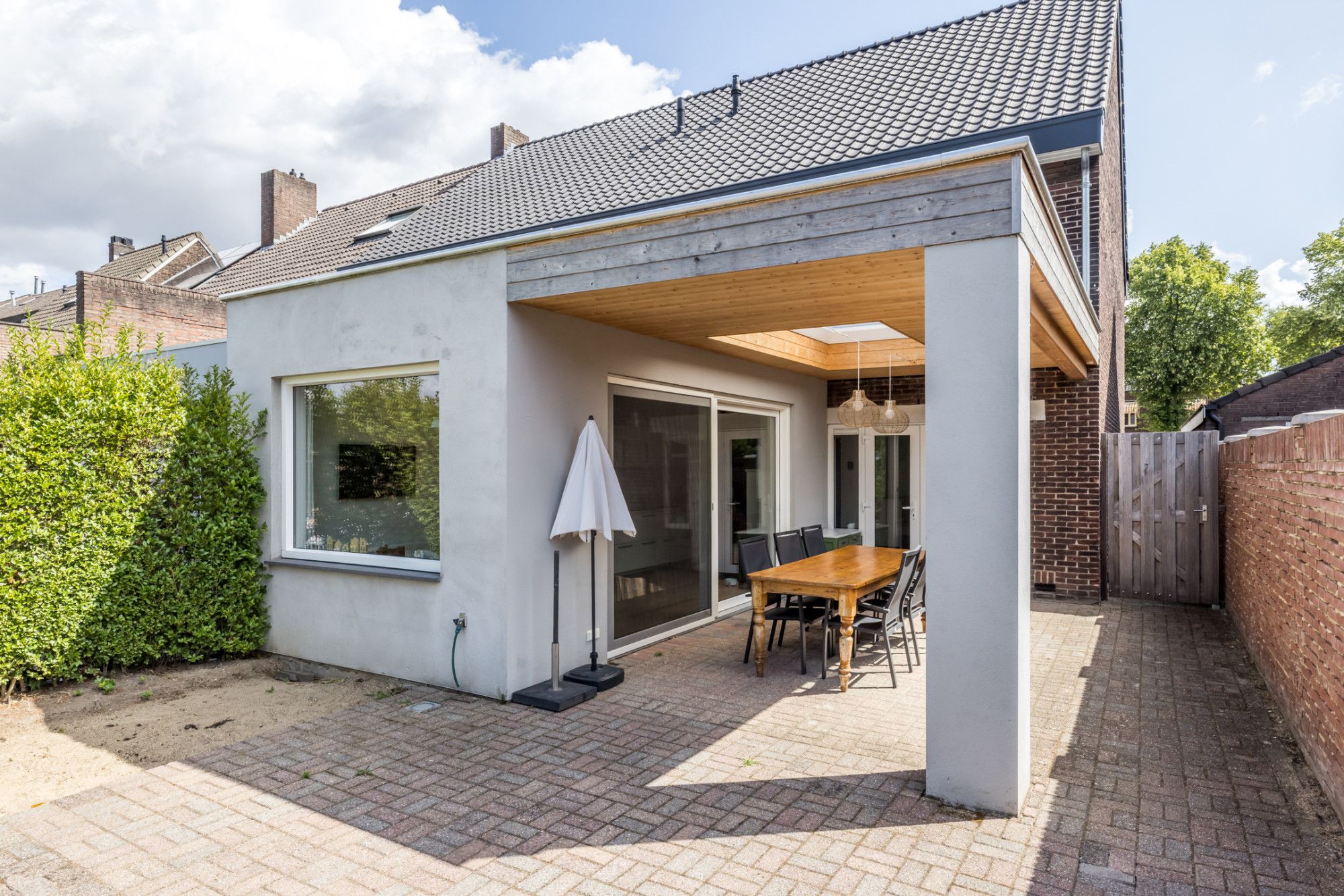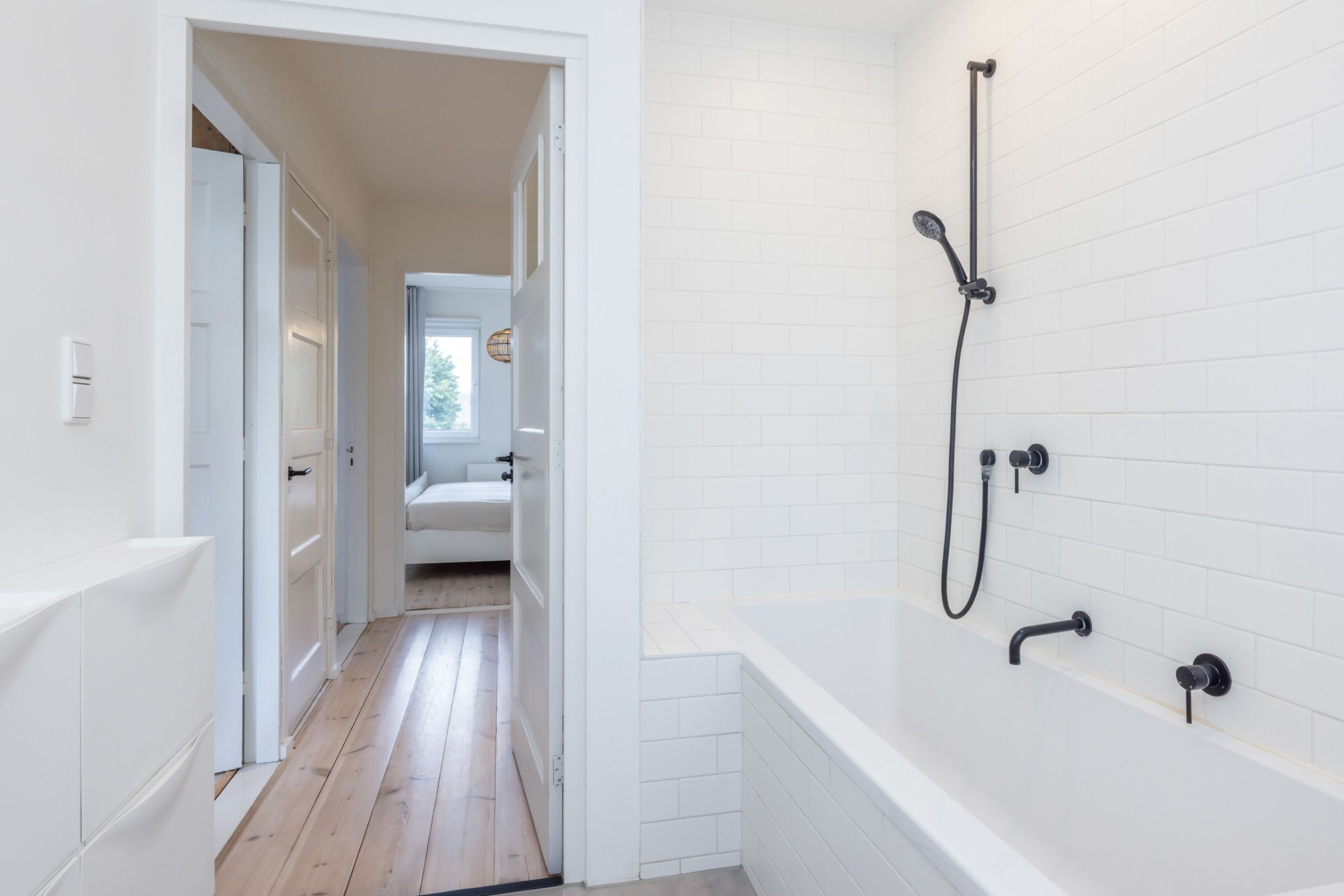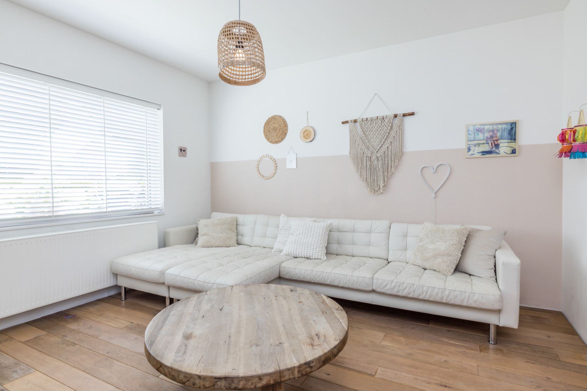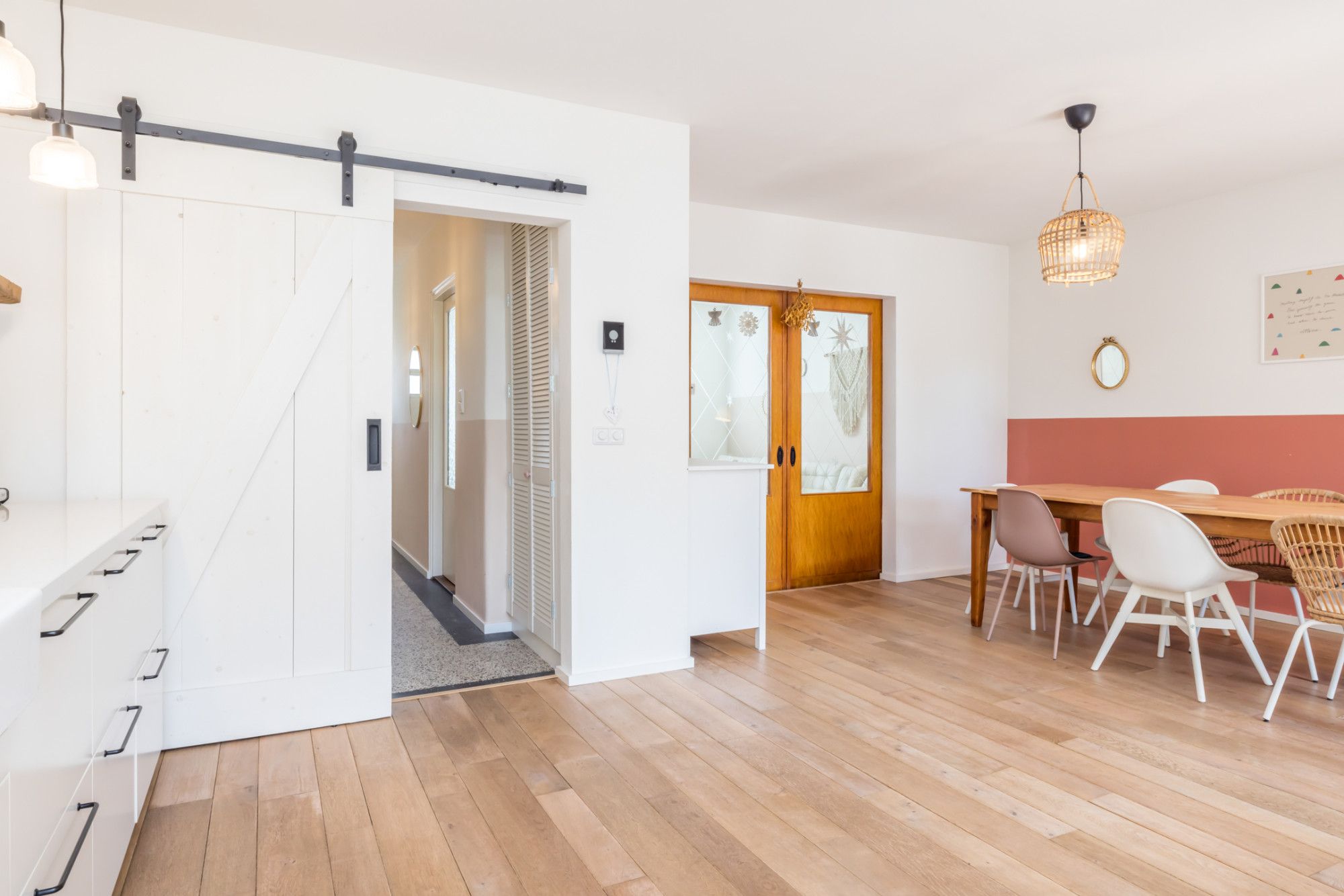 De royale aanbouw biedt een lichte, moderne keukenruimte met een eigentijdse witte inbouwkeuken met zwarte grepen, voorzien van diverse inbouwapparatuur, een composiet werkblad en veel opbergruimte. Een stijlvol loftdeur detail leidt naar de hal, terwijl aan de achterzijde een gezellige zithoek met schuifpui de verbinding vormt met het terras en de tuin.