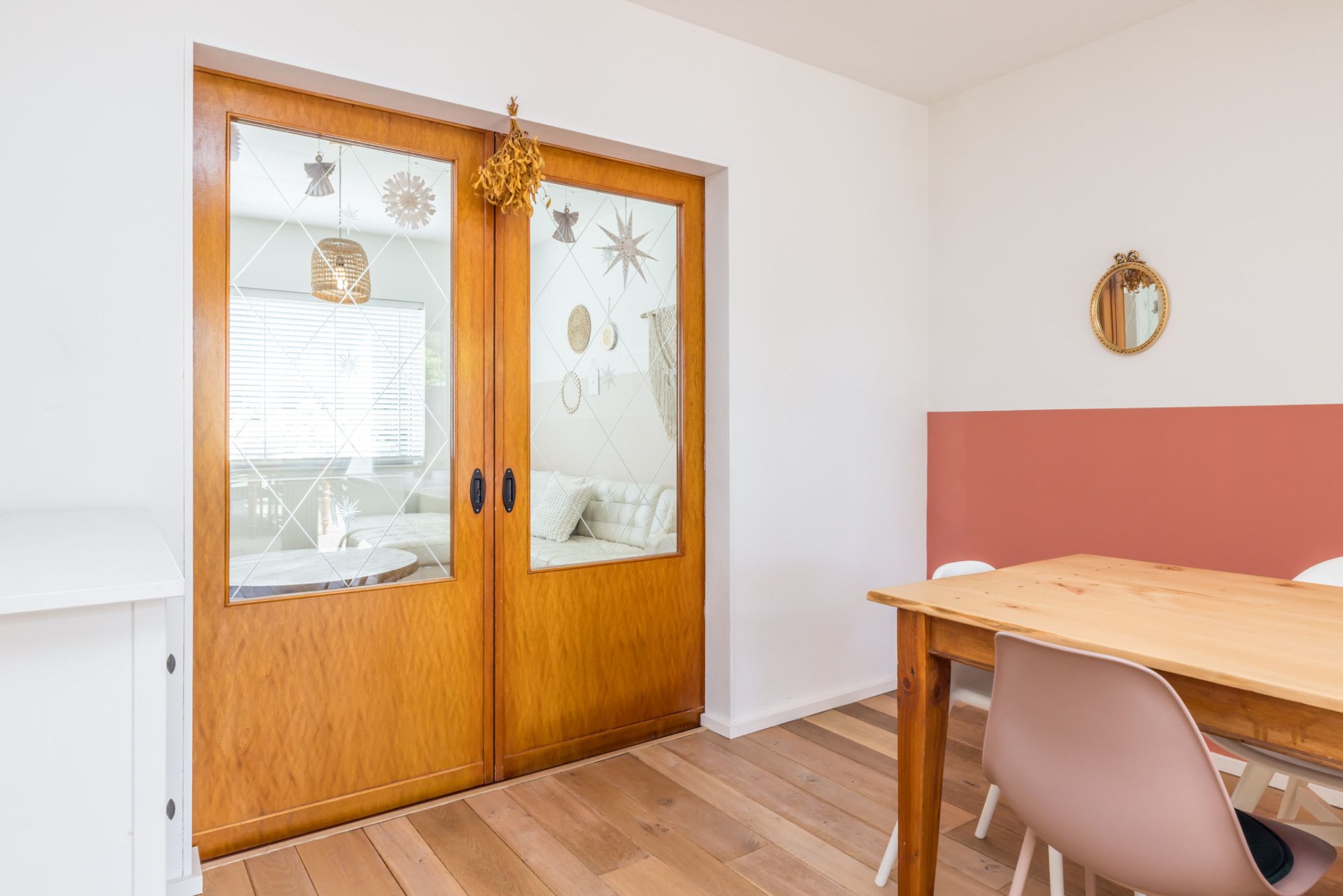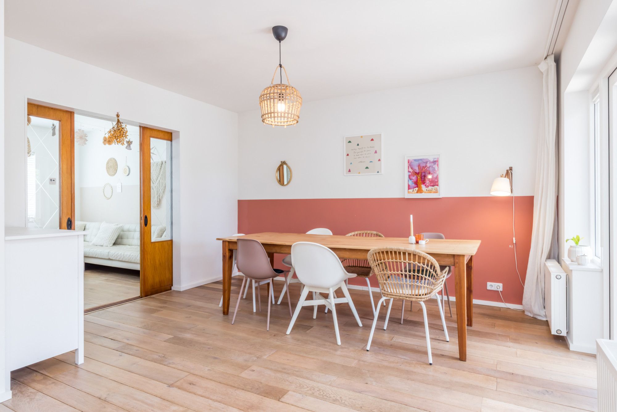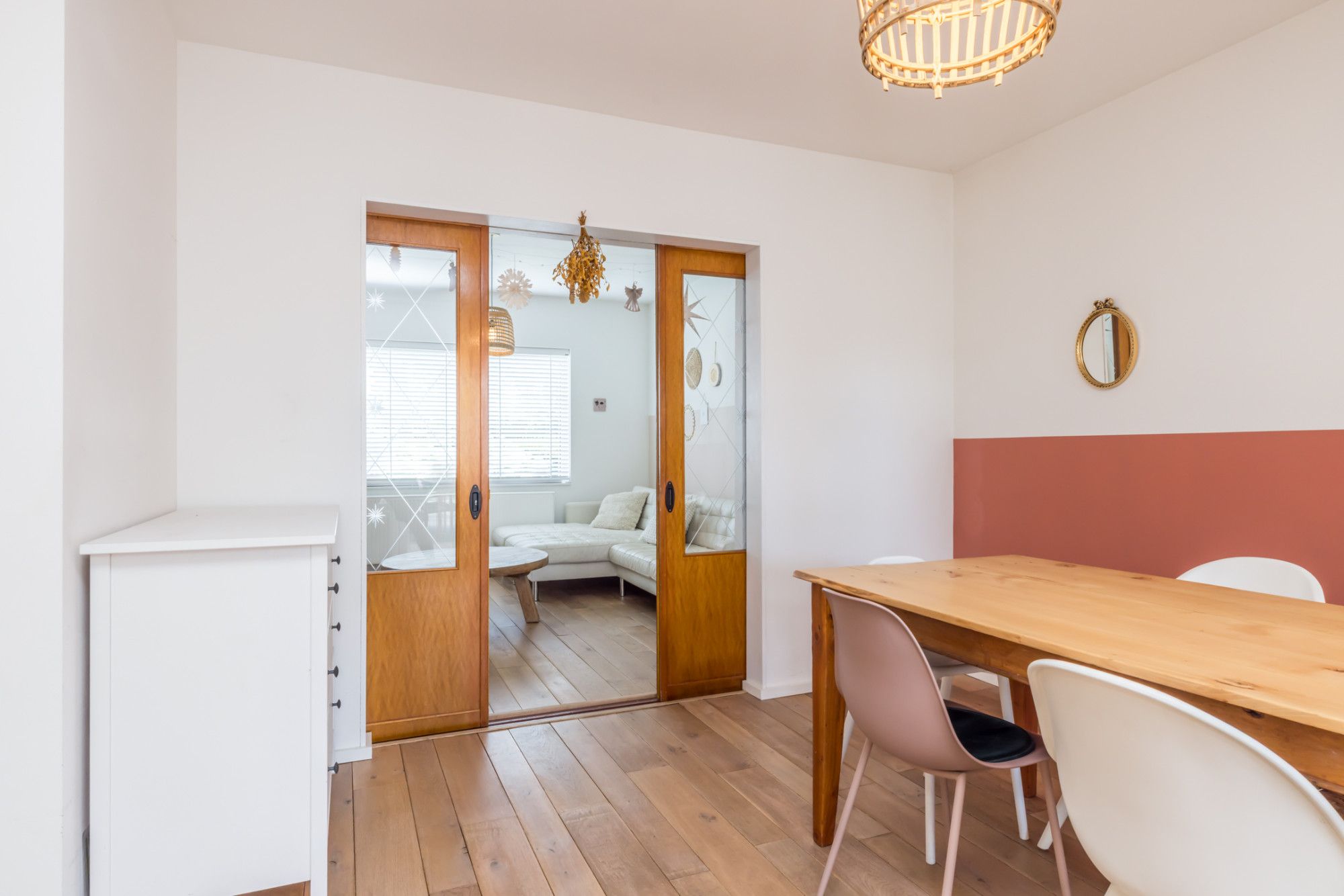Klassieke en-suite deuren vormen de verbindende schakel tussen living en de centraal geplaatste eetkamer, waar dubbele openslaande tuindeuren toegang geven tot het overdekte terras en de verzorgde achtertuin.