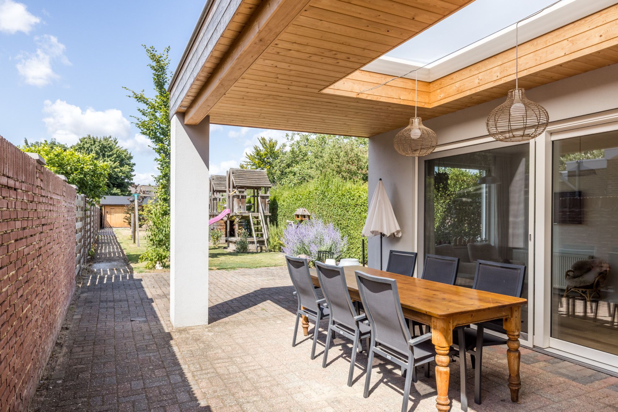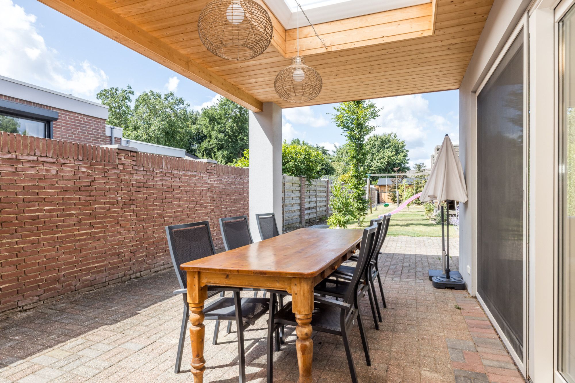 Royale heldere aanbouw met halfopen keukenruimte waar geplaatst een eigentijdse inbouwkeuken uitgevoerd in wit met zwarte grepen, voorzien van apparatuur, te weten: 4 zones inductiekookplaat / afzuigkap / elektrische oven / magnetron / keramische wasbak / vaatwasmachine / composiet werkblad en veel opbergruimte. Loftdeur naar de gang, zithoekje aan de achterzijde en een schuifpui naar het terras met overkapping en de achtertuin.