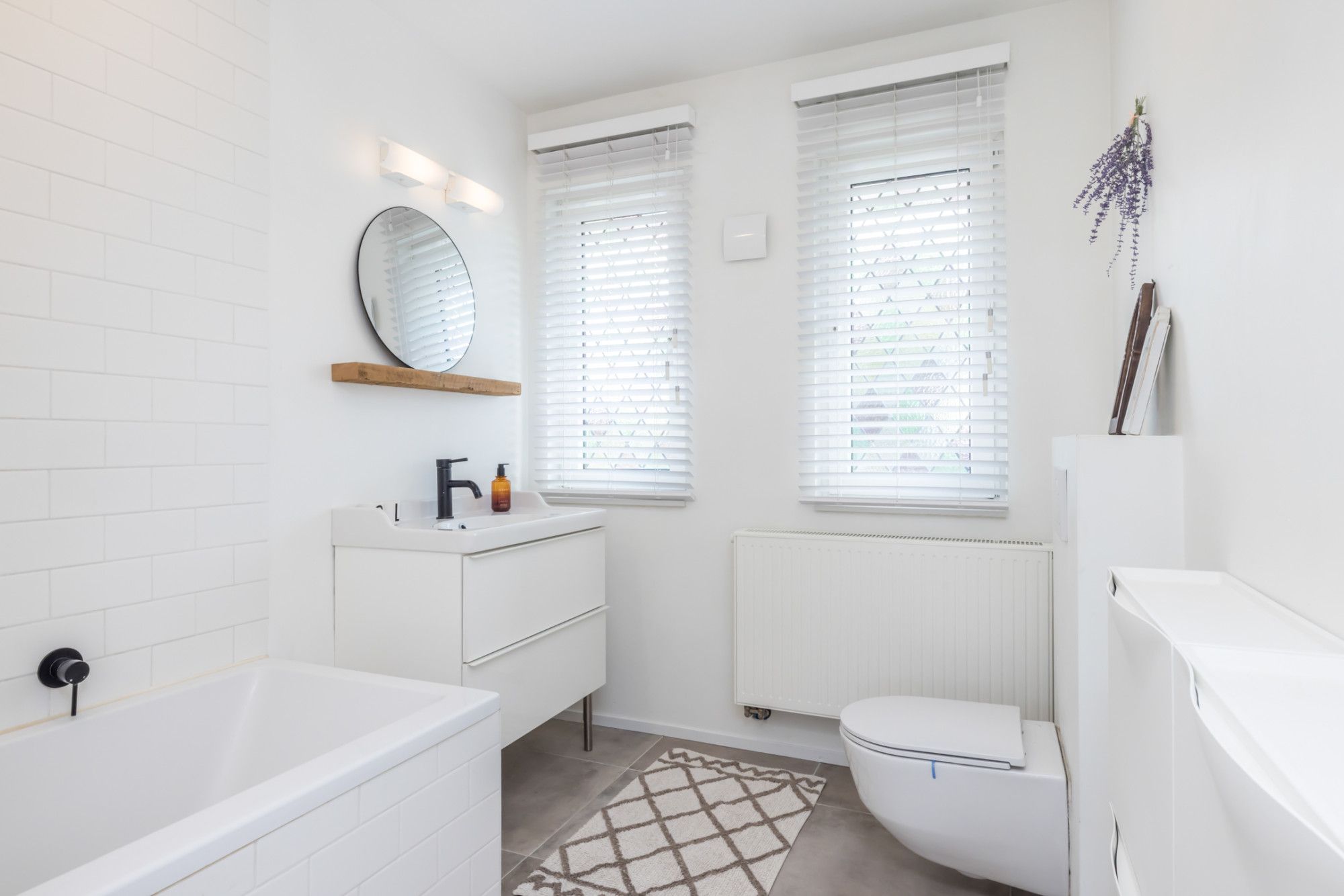 Geheel betegelde strakke badkamer met ligbad, vaste wastafel in een badkamermeubel voorzien van zwarte wandkranen en een tweede toilet.