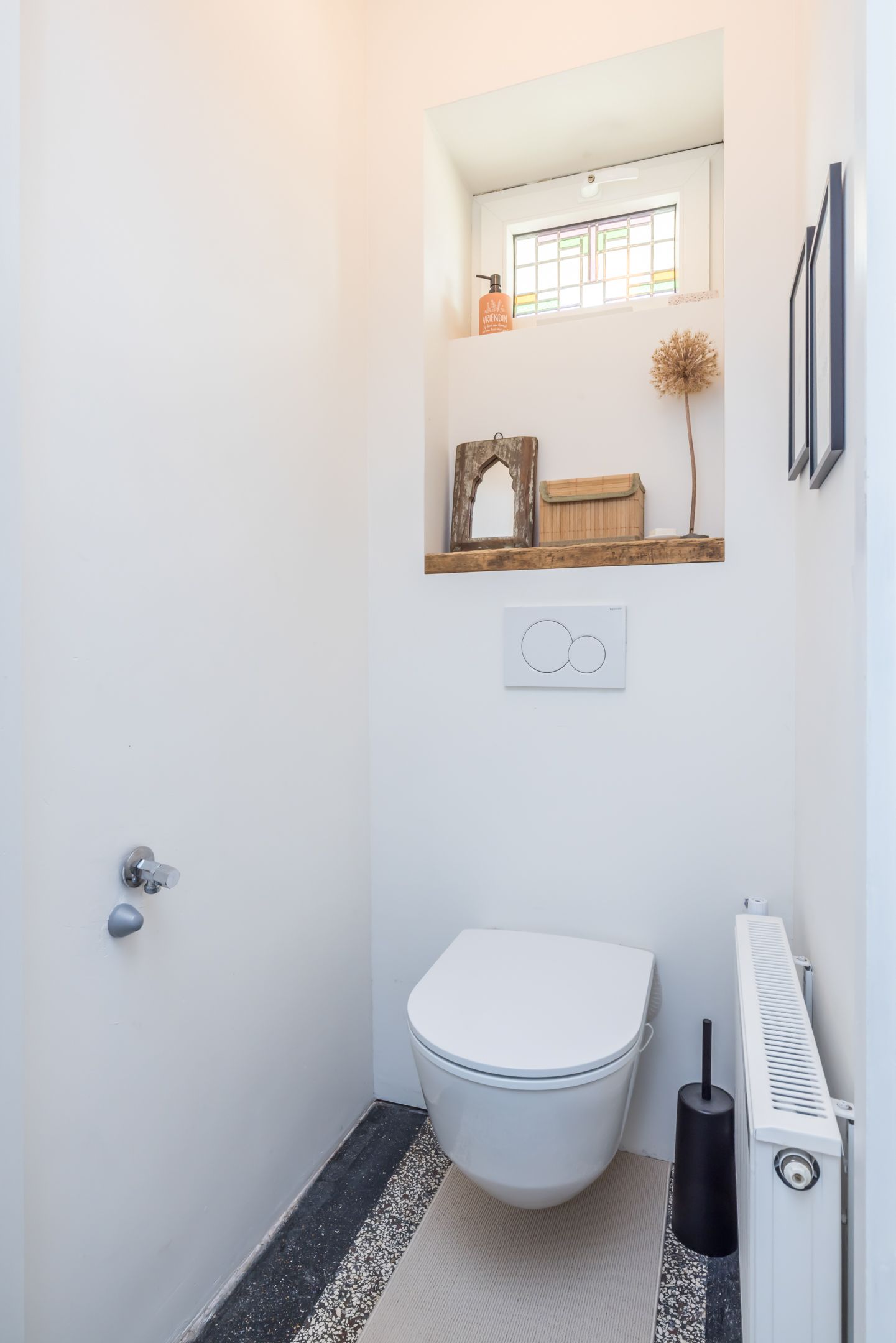 Het gastentoilet is strak afgewerkt met een zwevend wandcloset.