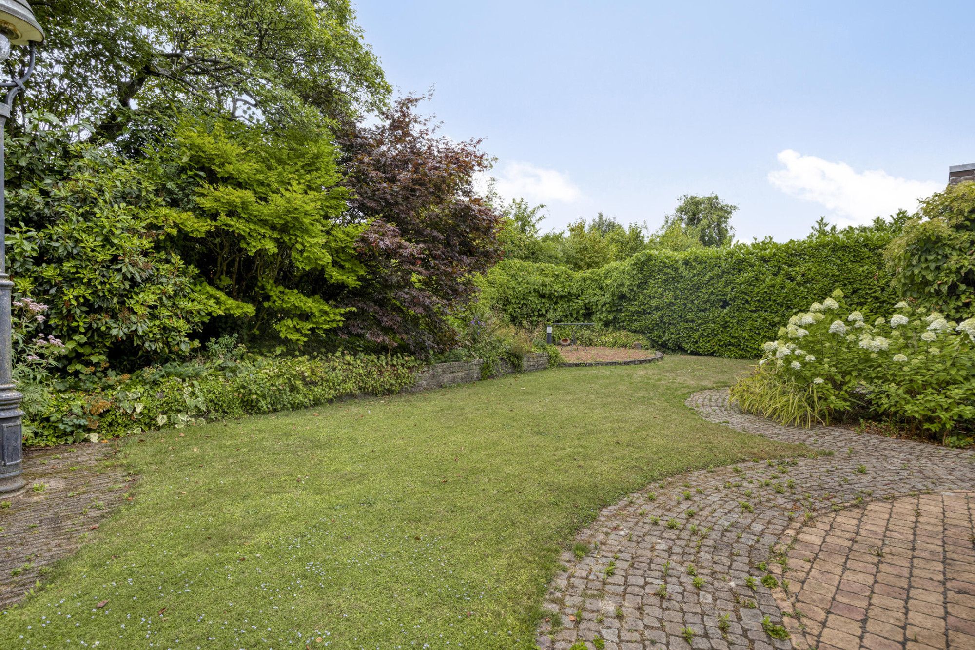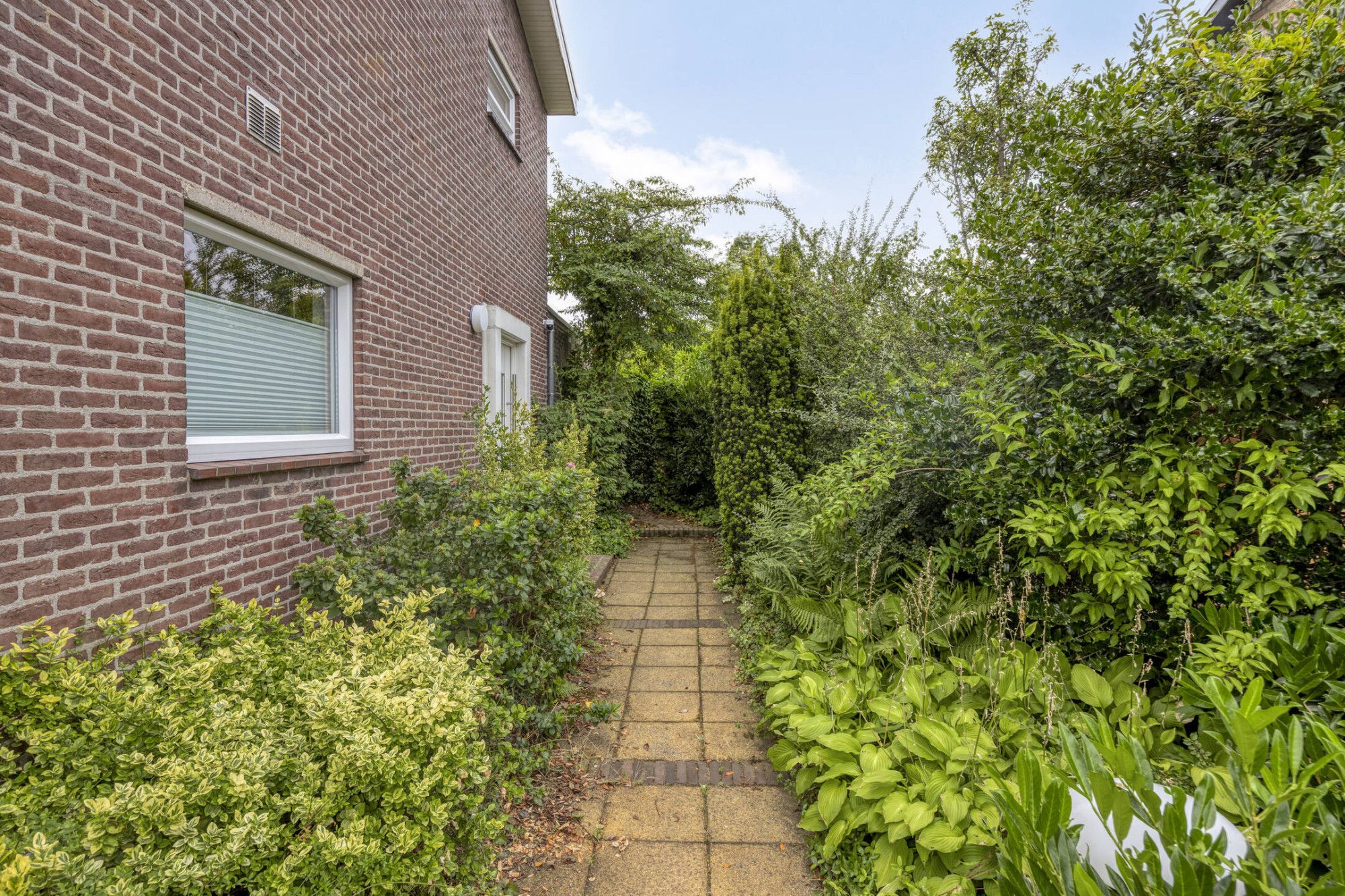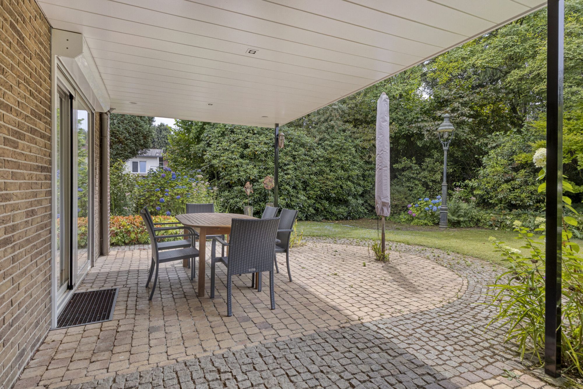 Vanuit de woonkamer en hal te bereiken omsloten tuin met zij-ingang met overdekt terras, graszone en mooi aangeplante borders.