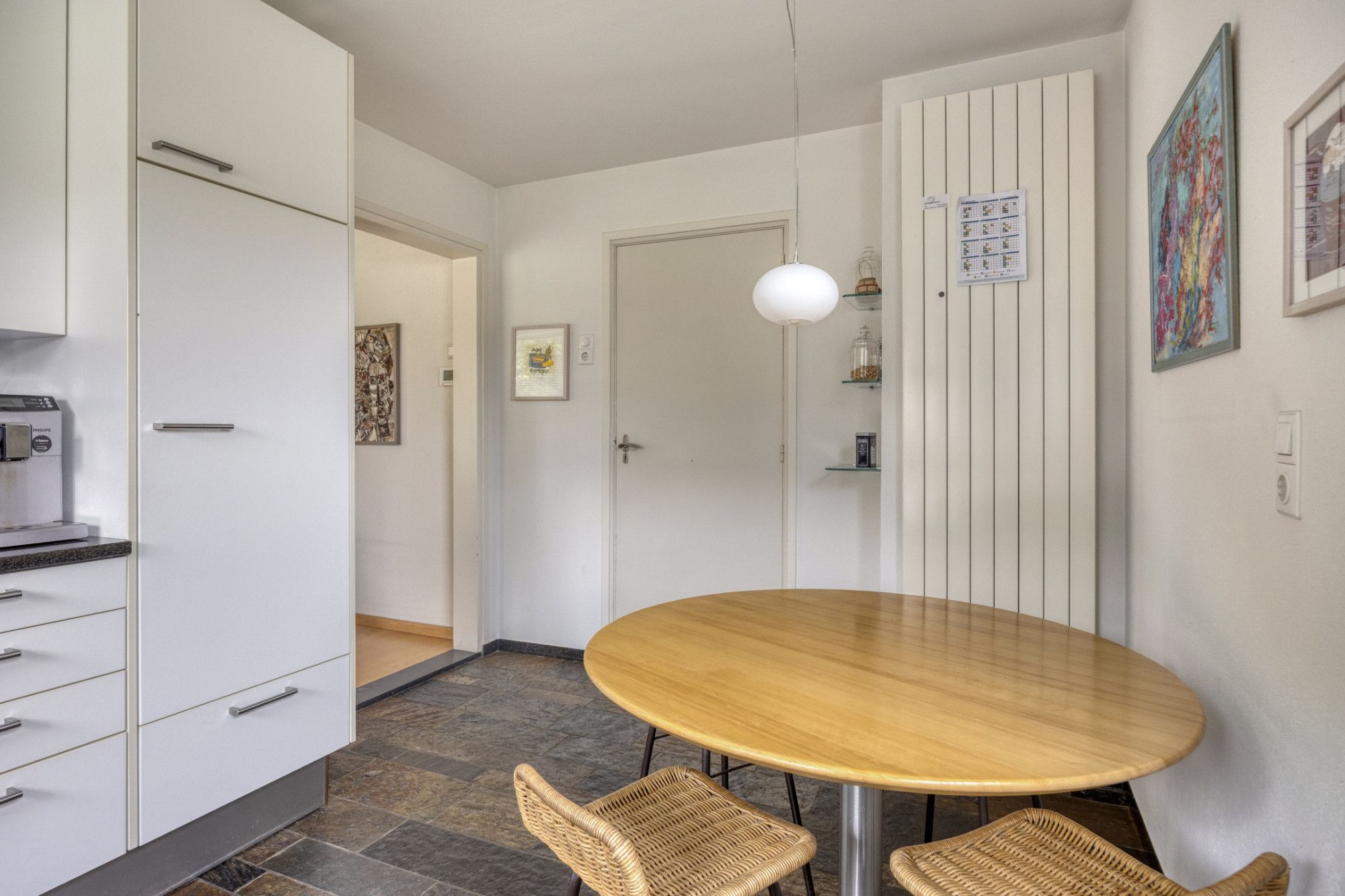 Half/open keuken (4.23 x 2.80 m) met witte keukeninstallatie in hoek opstelling met diverse onder- en bovenkasten, inbouwapparatuur te weten: 4-pits inductie kookplaat, vlakscherm afzuigkap, oven (beiden van Gaggenau) vaatwasser en koel/vries combinatie (beiden van Siemens).