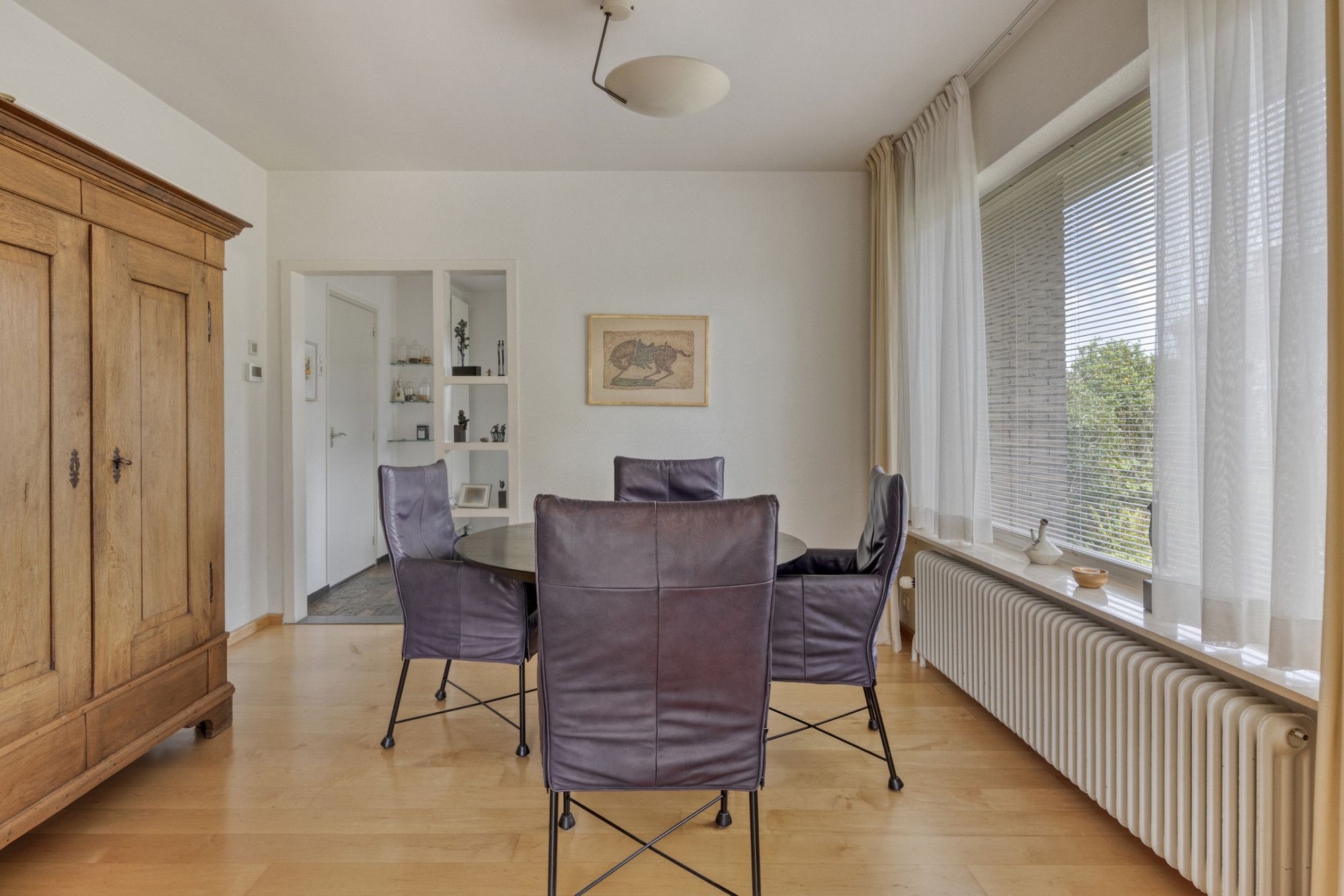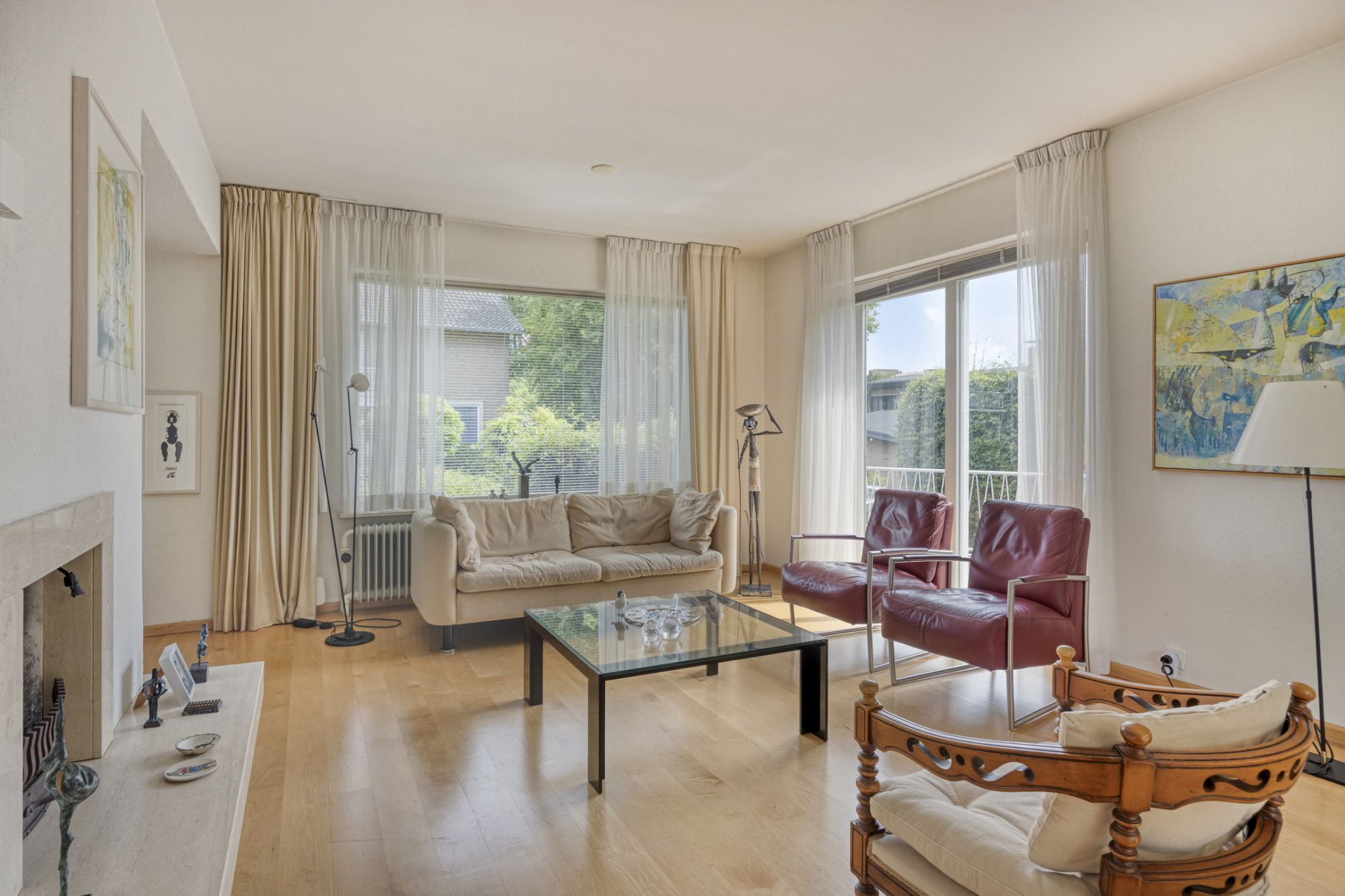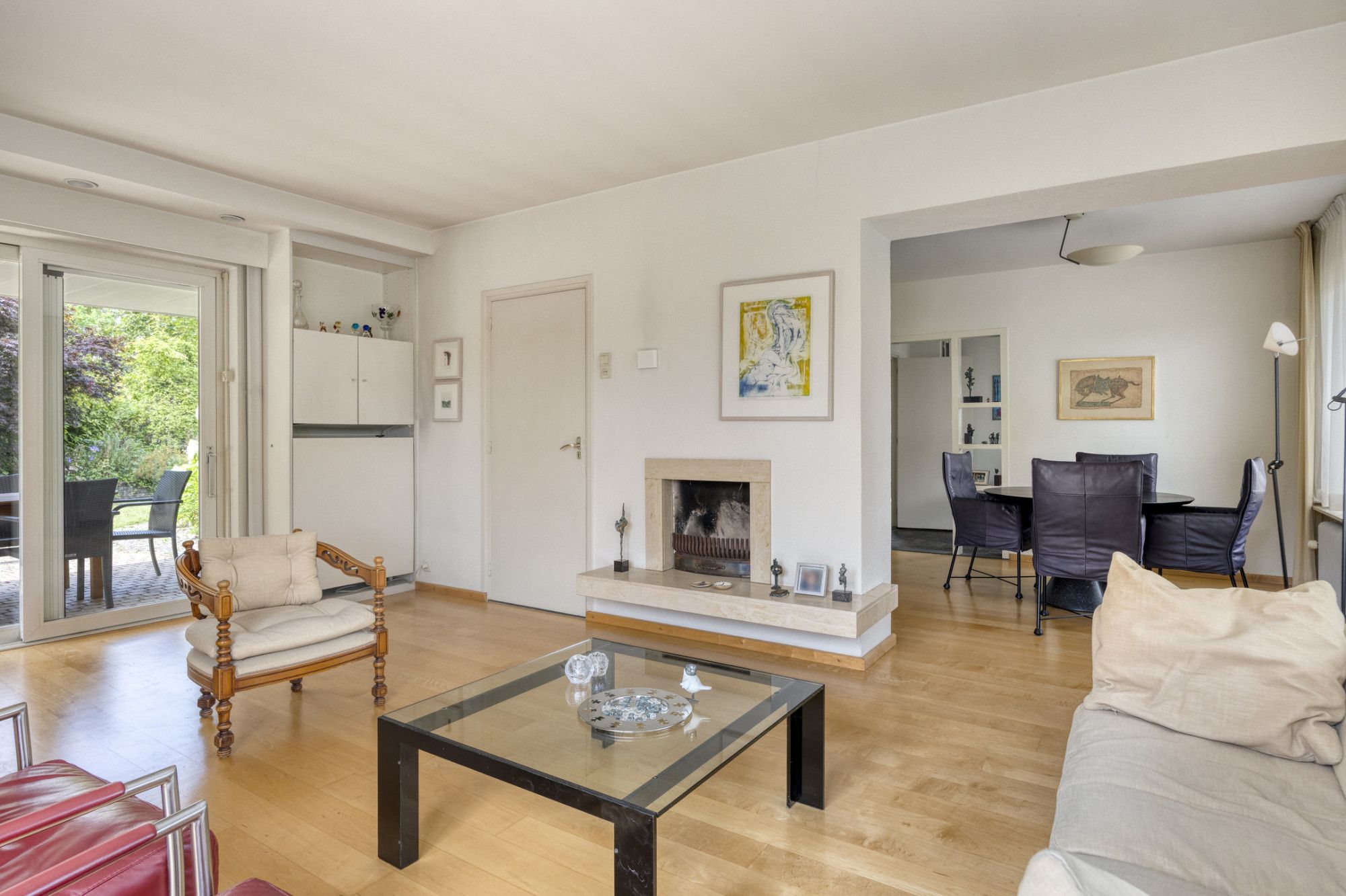 Speels ingedeelde lichte woonkamer (7.53 x 5.94/3.65 m - circa 37 m²) voorzien van parketvloer, schouwpartij met open haard, grote raampartijen, schuifpui naar het ruime terras aan opritzijde en schuifpui naar het overdekte terras (6.82 x 4.52 m) aan tuinzijde achterkant.