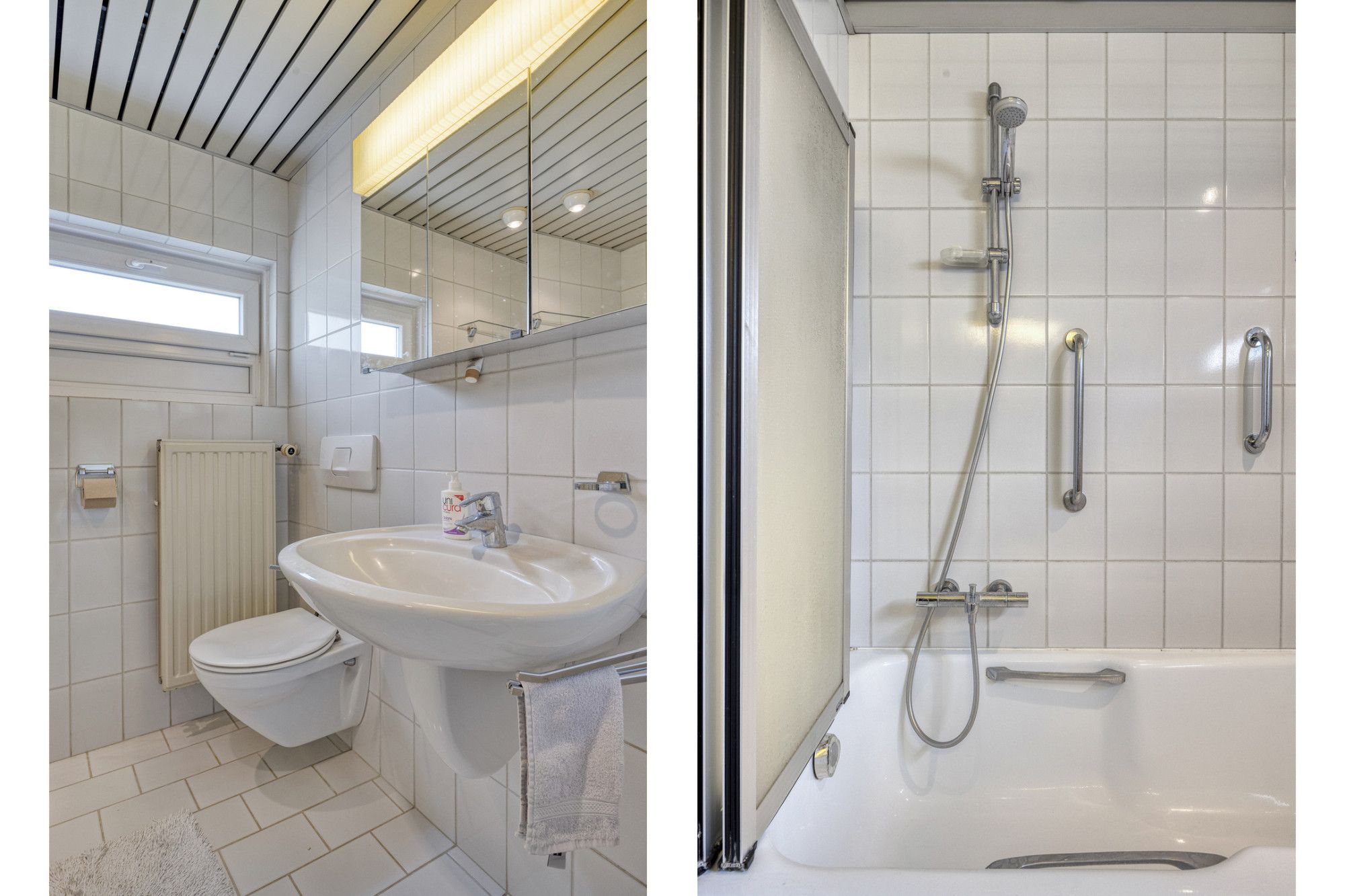 Geheel betegelde badkamer (2.20 x 1.76 m) met bad voorzien van douchescherm, 2e wand closet en vaste wastafel.
