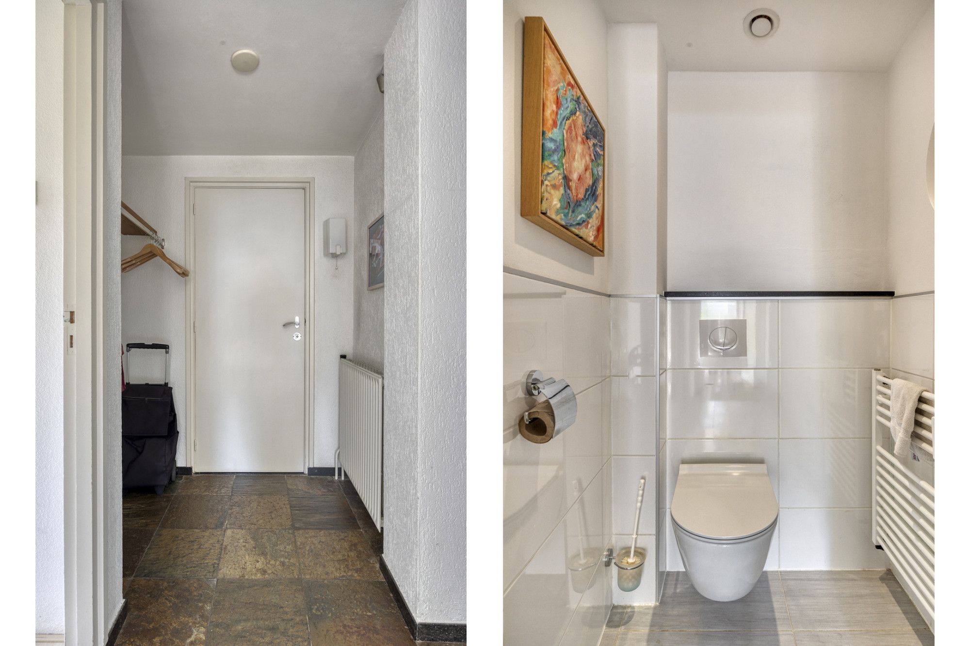 Ruime hal (6.46 x 2.28 m) met leistenen vloer doorlopend in keuken, garderobenis en deels betegelde toiletruimte met wandcloset, fonteintje en handdoeken radiator.