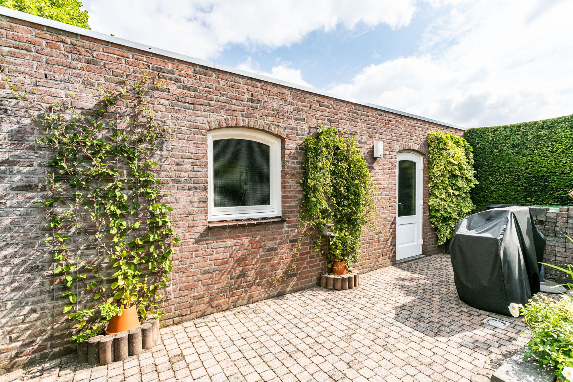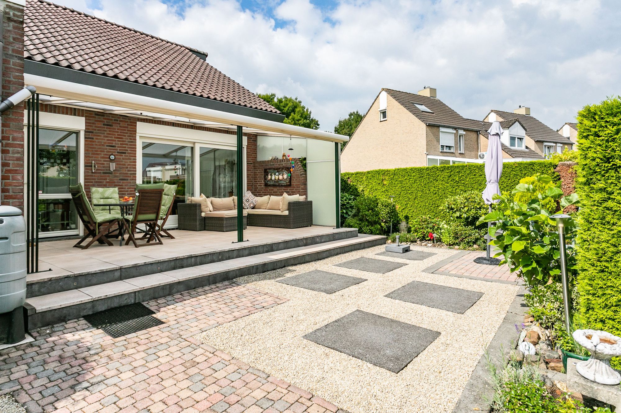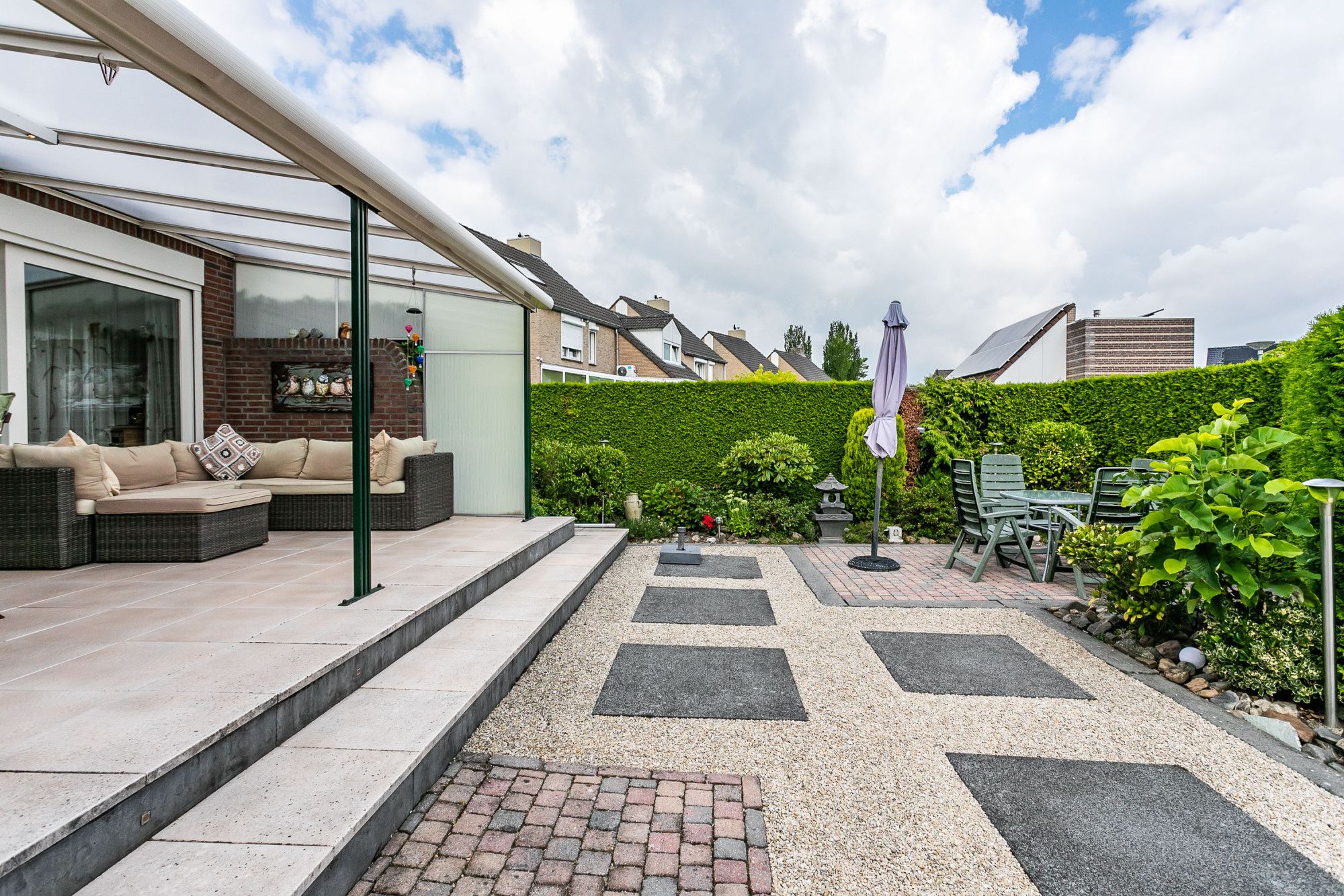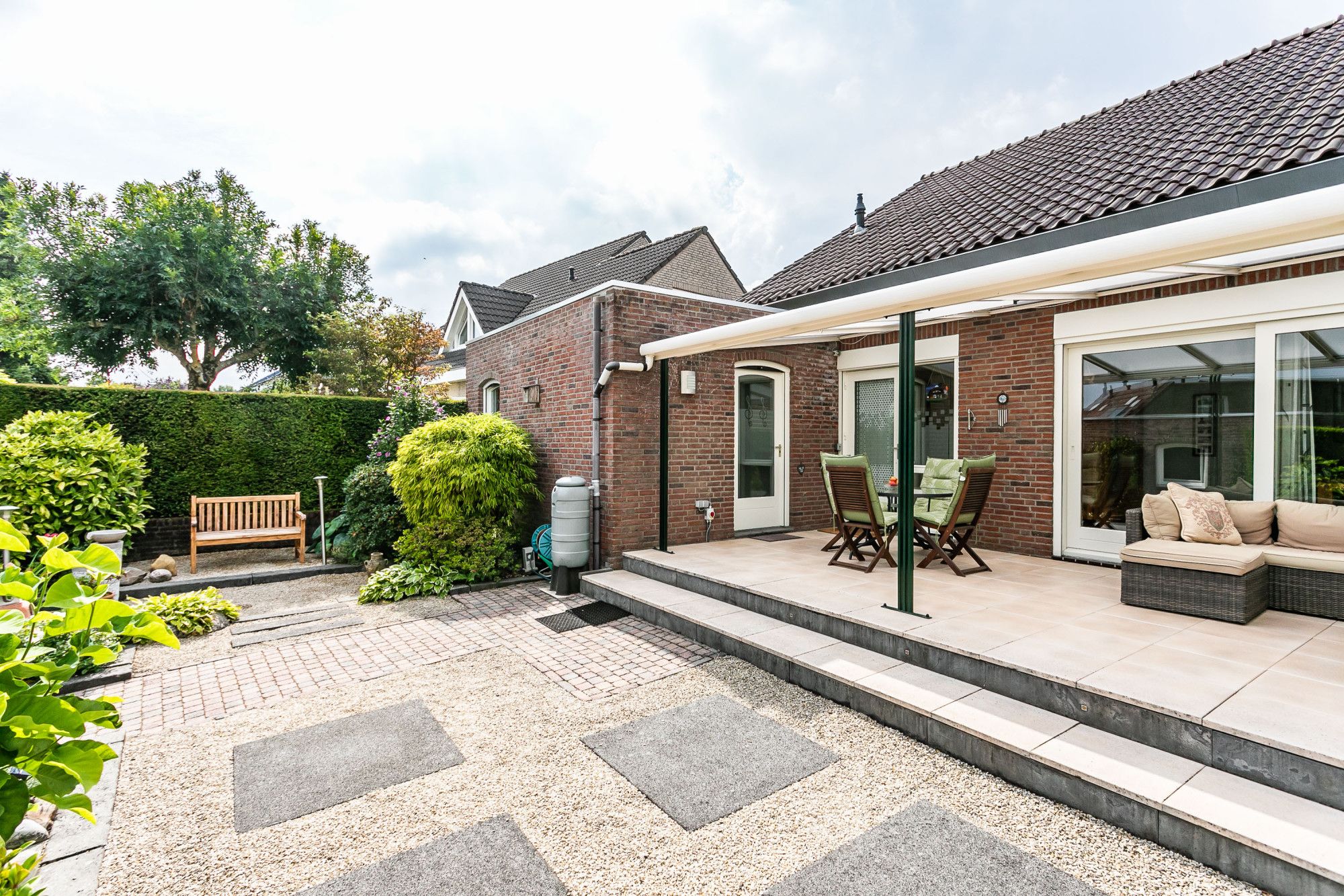 De brede, onderhoudsvriendelijke achtertuin biedt optimale privacy en is voorzien van een royaal overdekt terras, borders met aanplanting en een praktische zij-ingang.