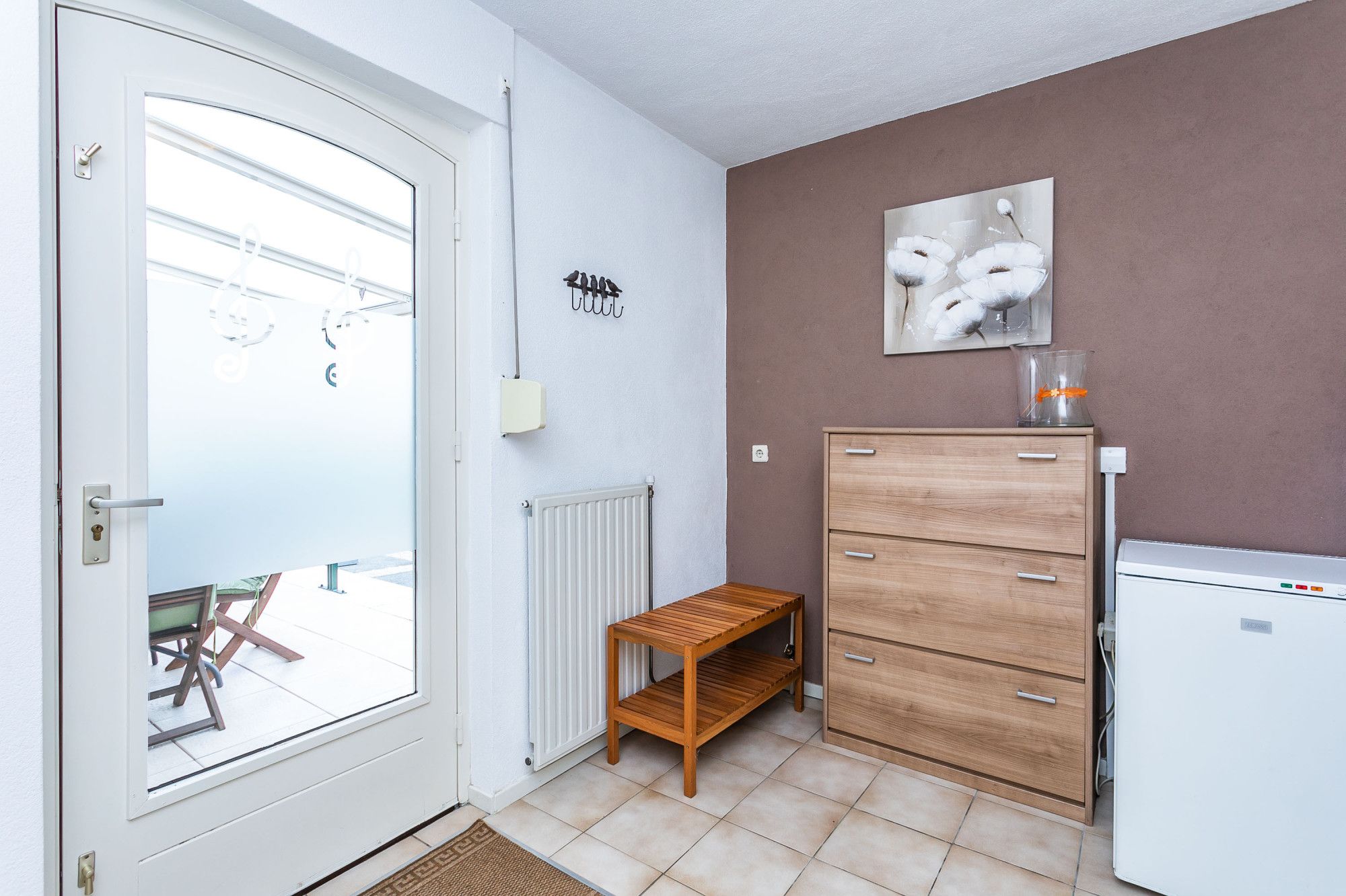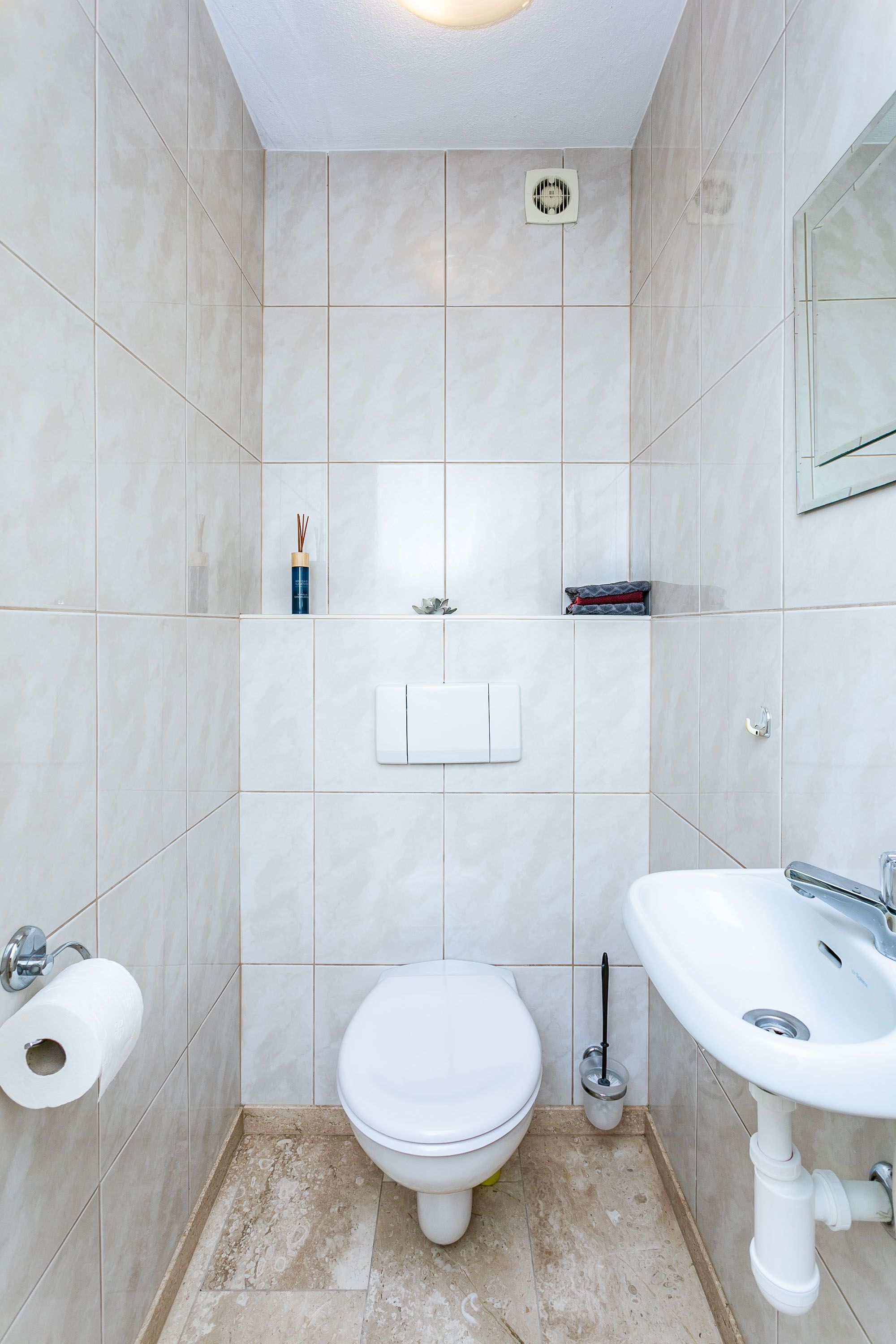 Het moderne, geheel betegelde gastentoilet is voorzien van een zwevend wandcloset en fonteintje.