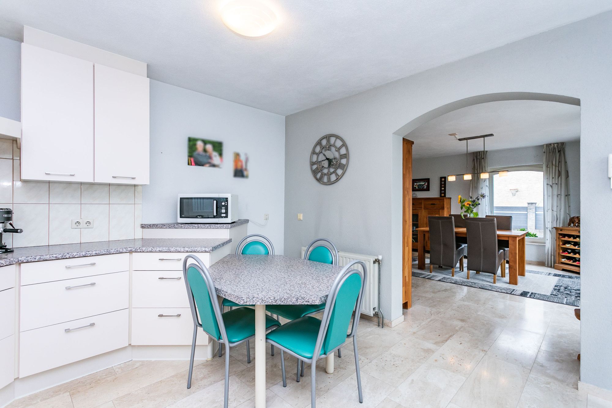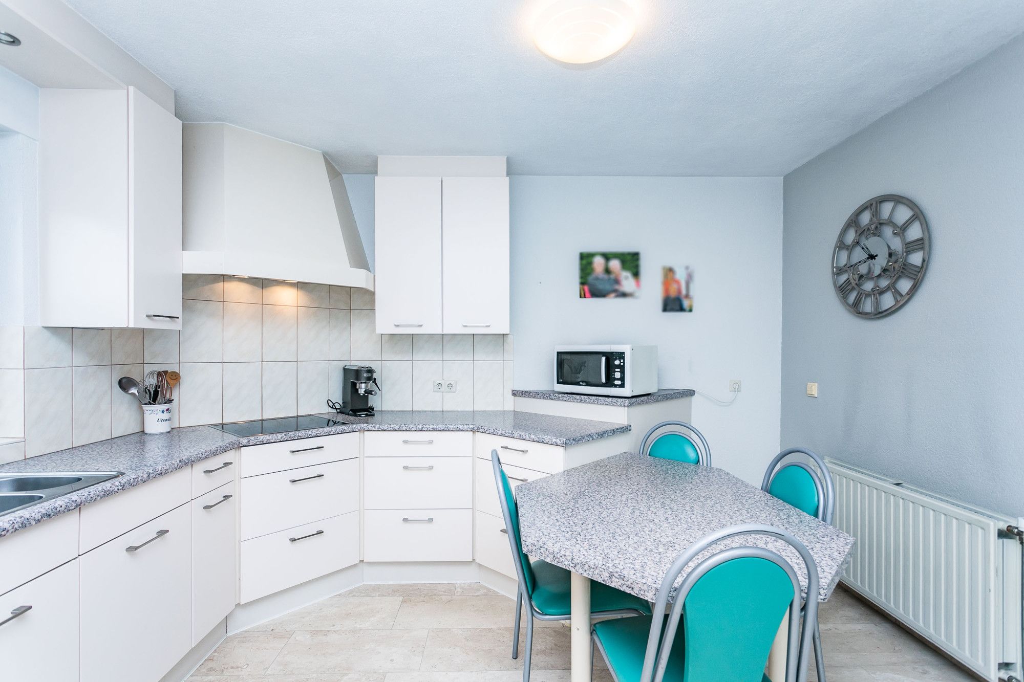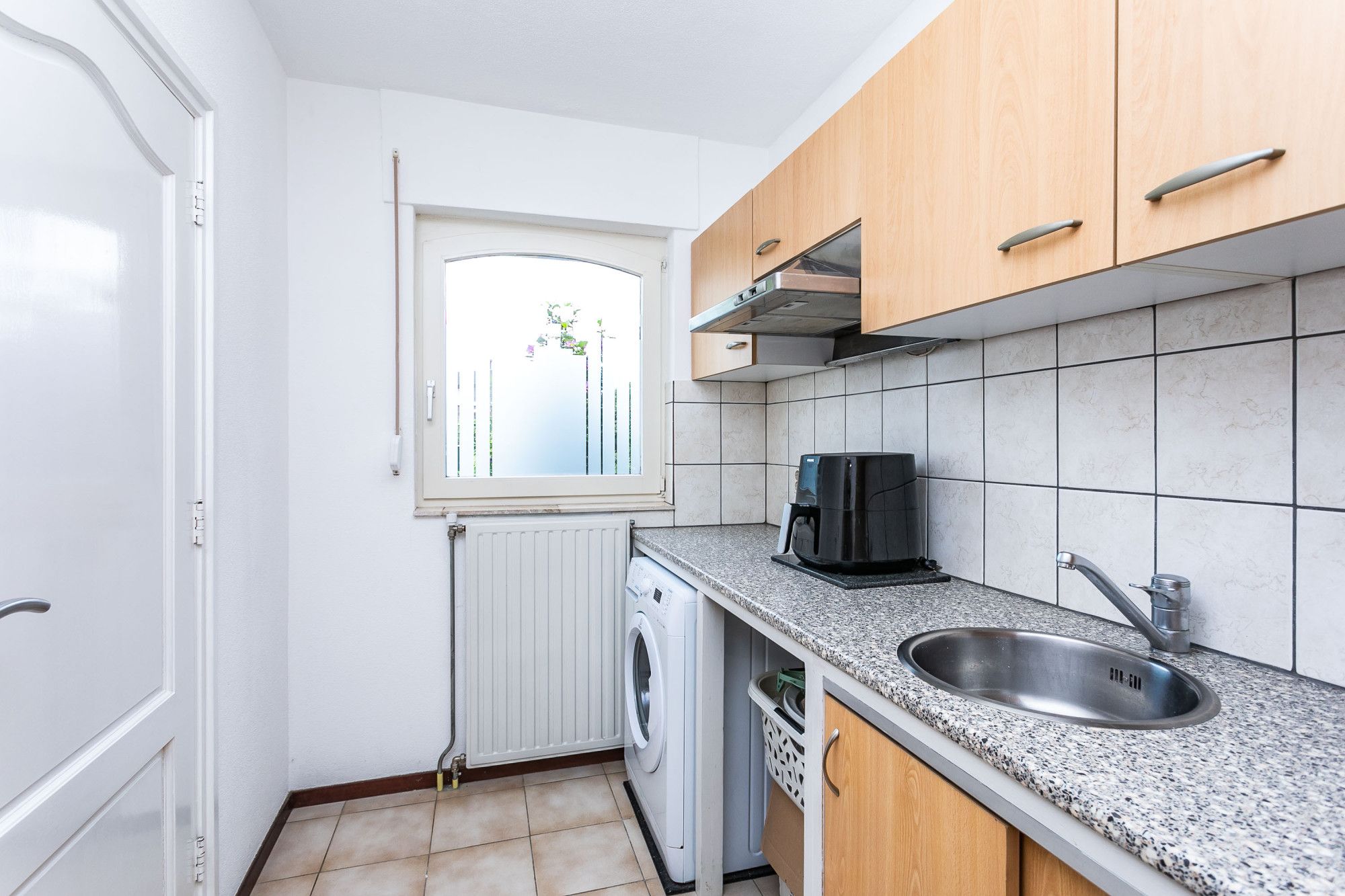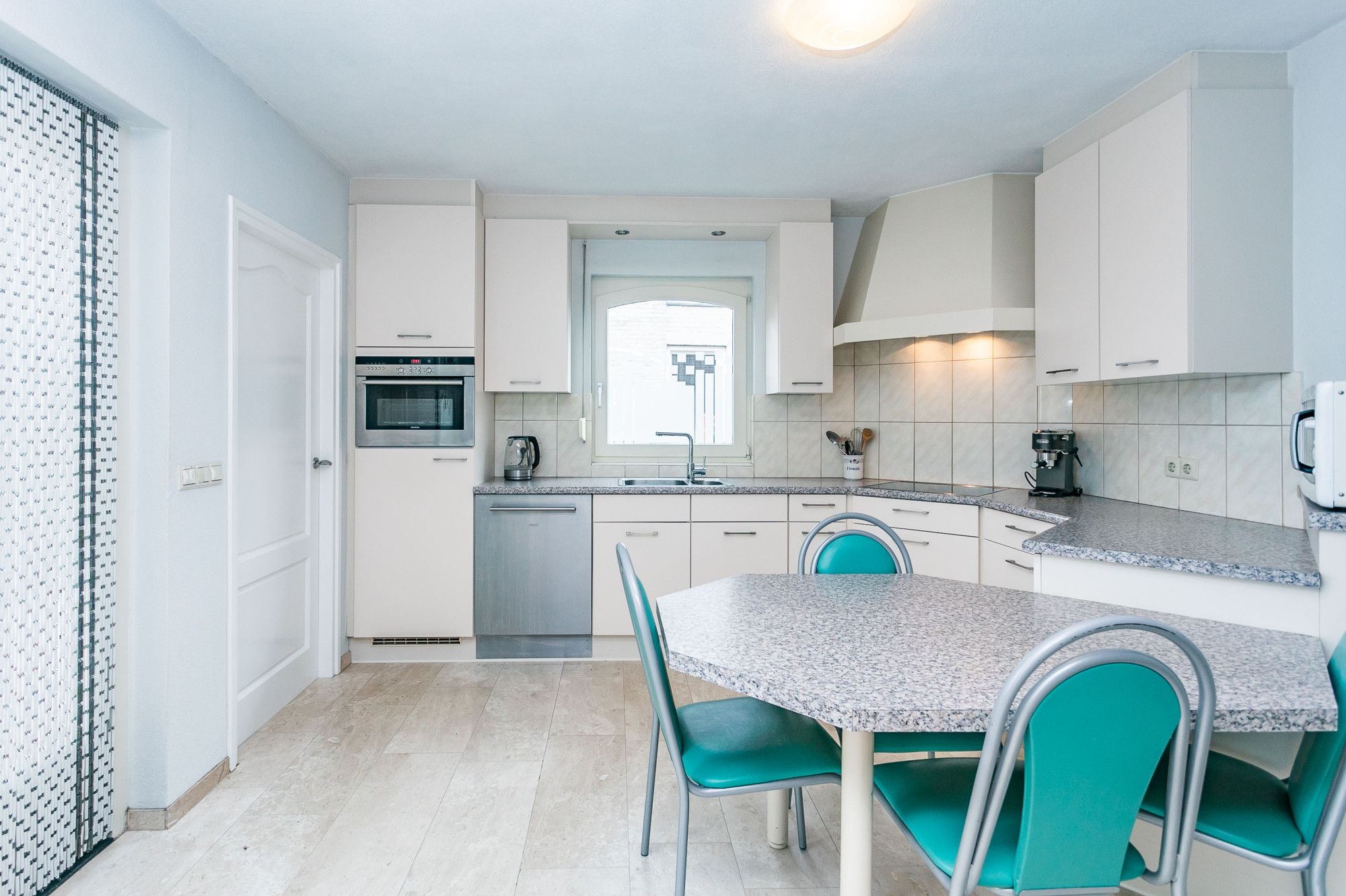 De halfopen keuken is uitgevoerd in wit met RVS-grepen en voorzien van diverse inbouwapparatuur. Aangrenzend treft u een separate wasruimte met witgoedaansluitingen en een bijkeuken met eenvoudig keukenblok, eveneens met toegang tot het terras en de tuin.
