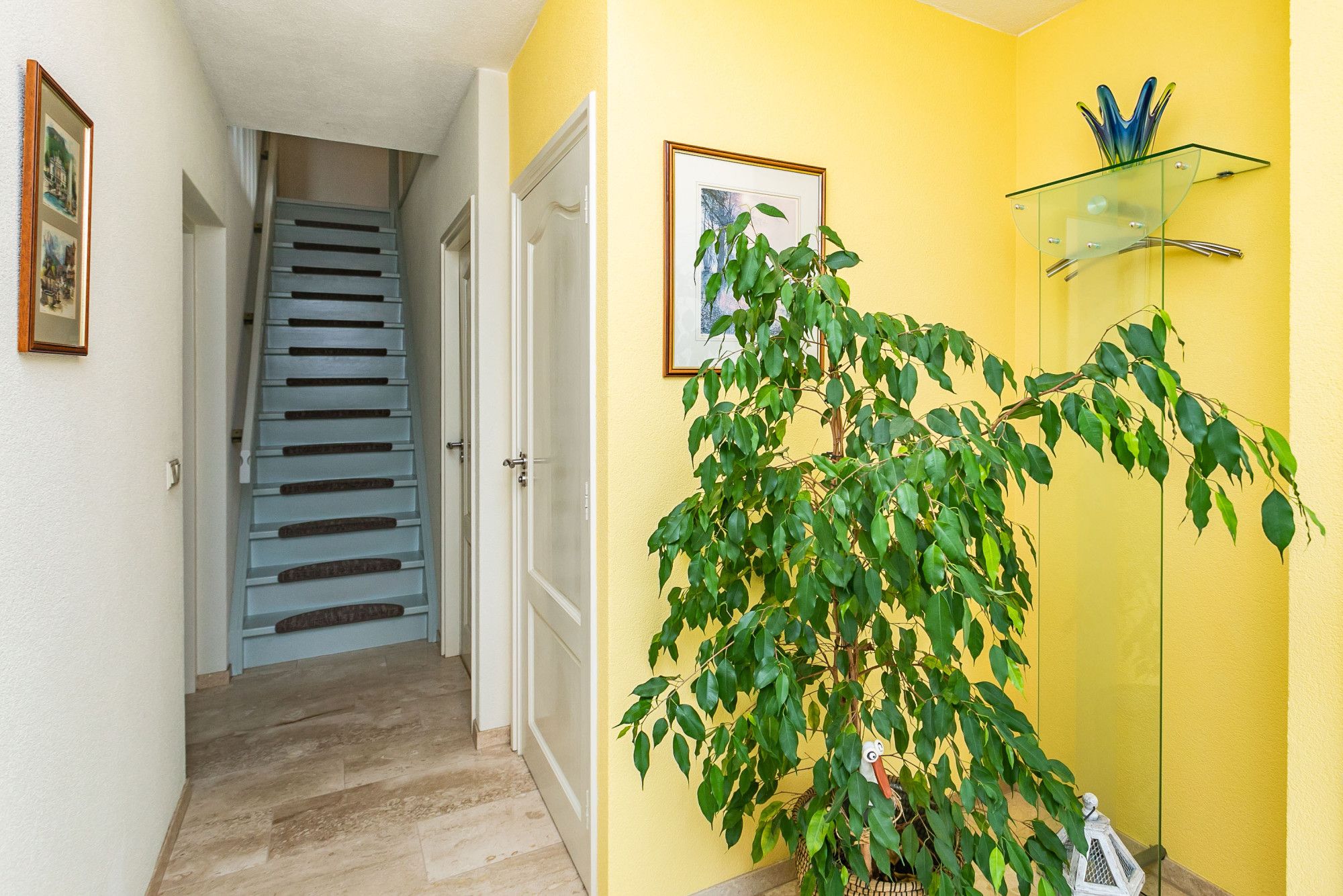 Ruime entree/hal met garderobe-nis en trappenhuis naar en de verdieping. Meterkast voorzien van 10 groepsinstallatie / kookgroep / aardlekschakelaars / 3 fase aansluiting digitale meters met dag- en nachtstroomaansluiting. Gastentoilet met zwevend wandcloset en fonteintje. Toegang tot de woonkamer, slaapkamer met voorgelegen badkamer.
