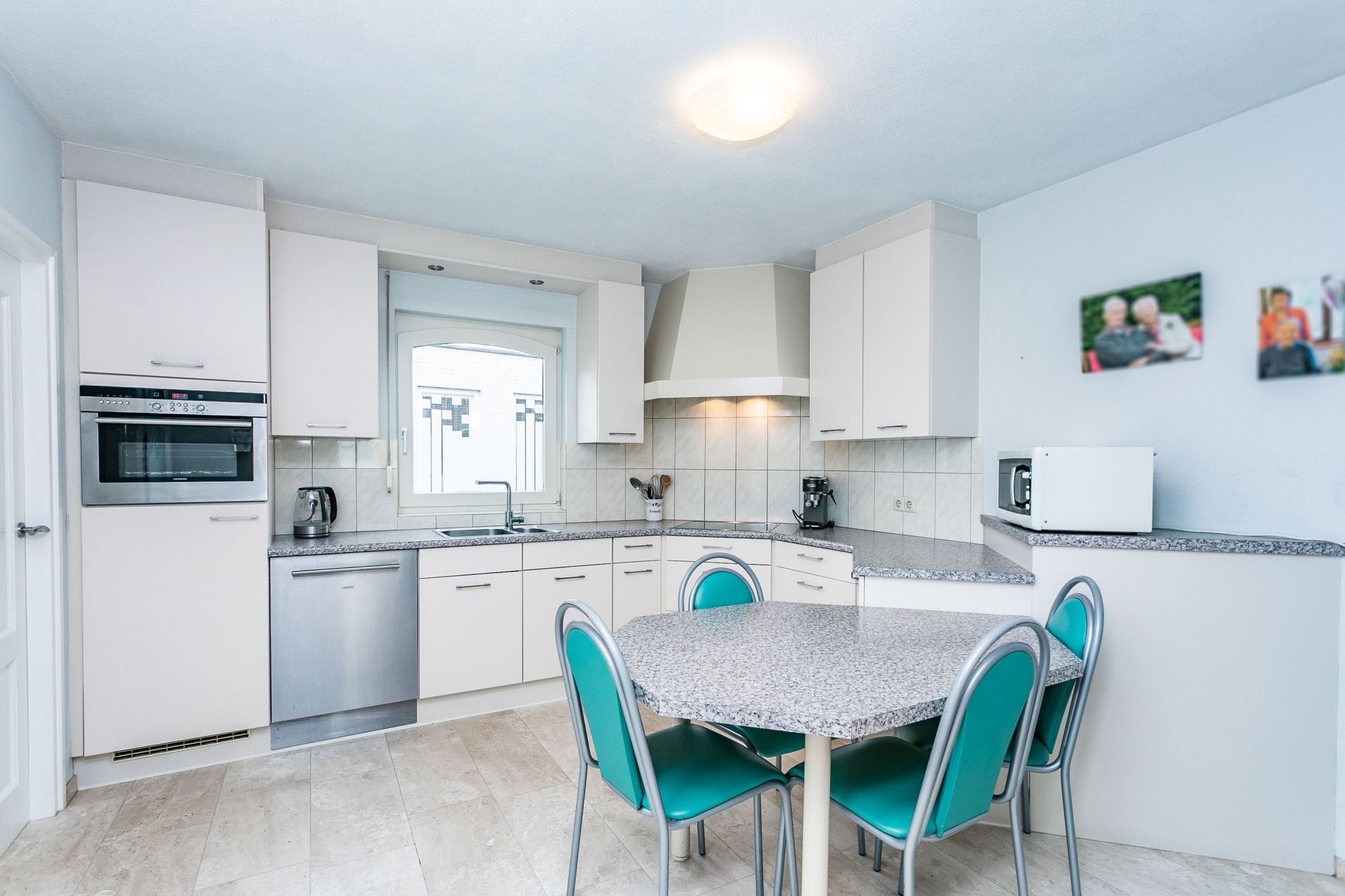 Halfopen leefkeuken voorzien van een in wit met RVS-grepen uitgevoerde inbouwkeuken in hoekopstelling, uitgerust met apparatuur, te weten: 4 zones keramische kookplaat / afzuigkap / combimagnetron / koelkast / vaatwasmachine en wasbak.