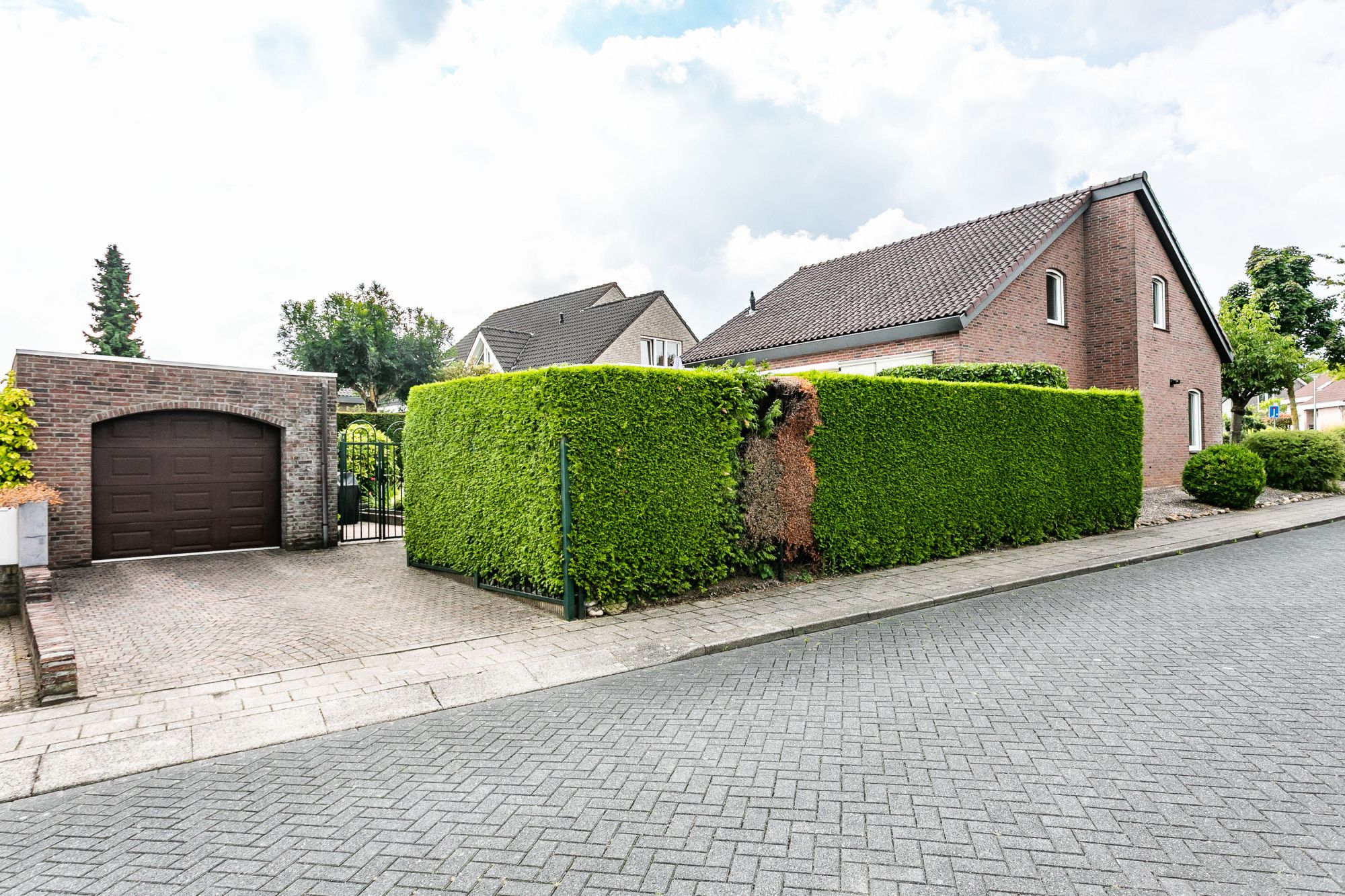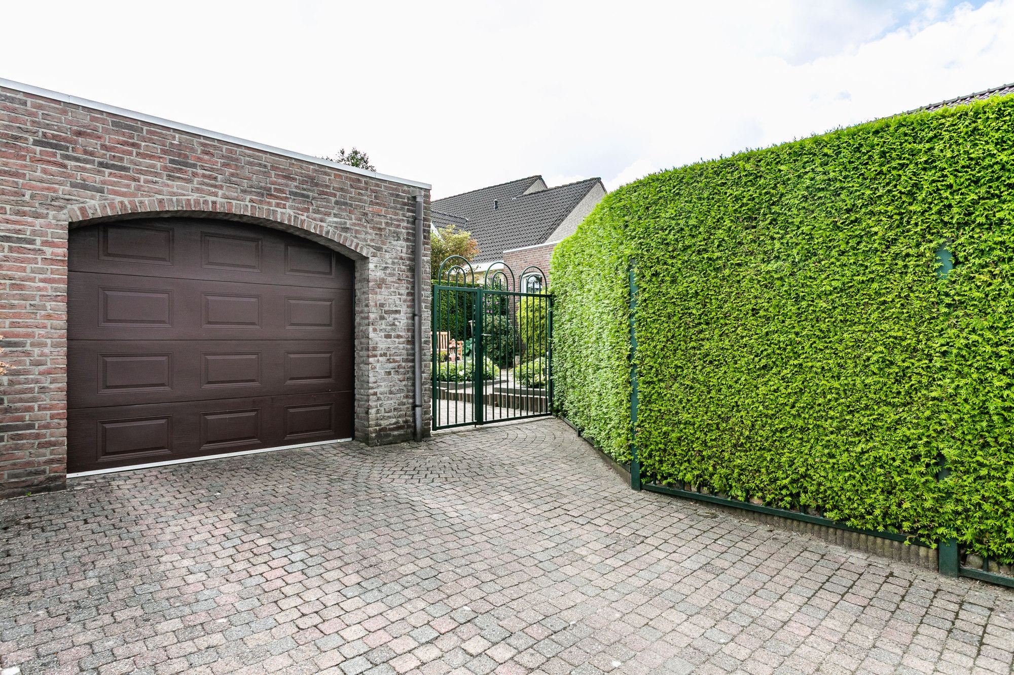 De vrijstaande stenen garage heeft een elektrisch bedienbare sectionaalpoort en op de oprit is ruimte voor meerdere auto’s.