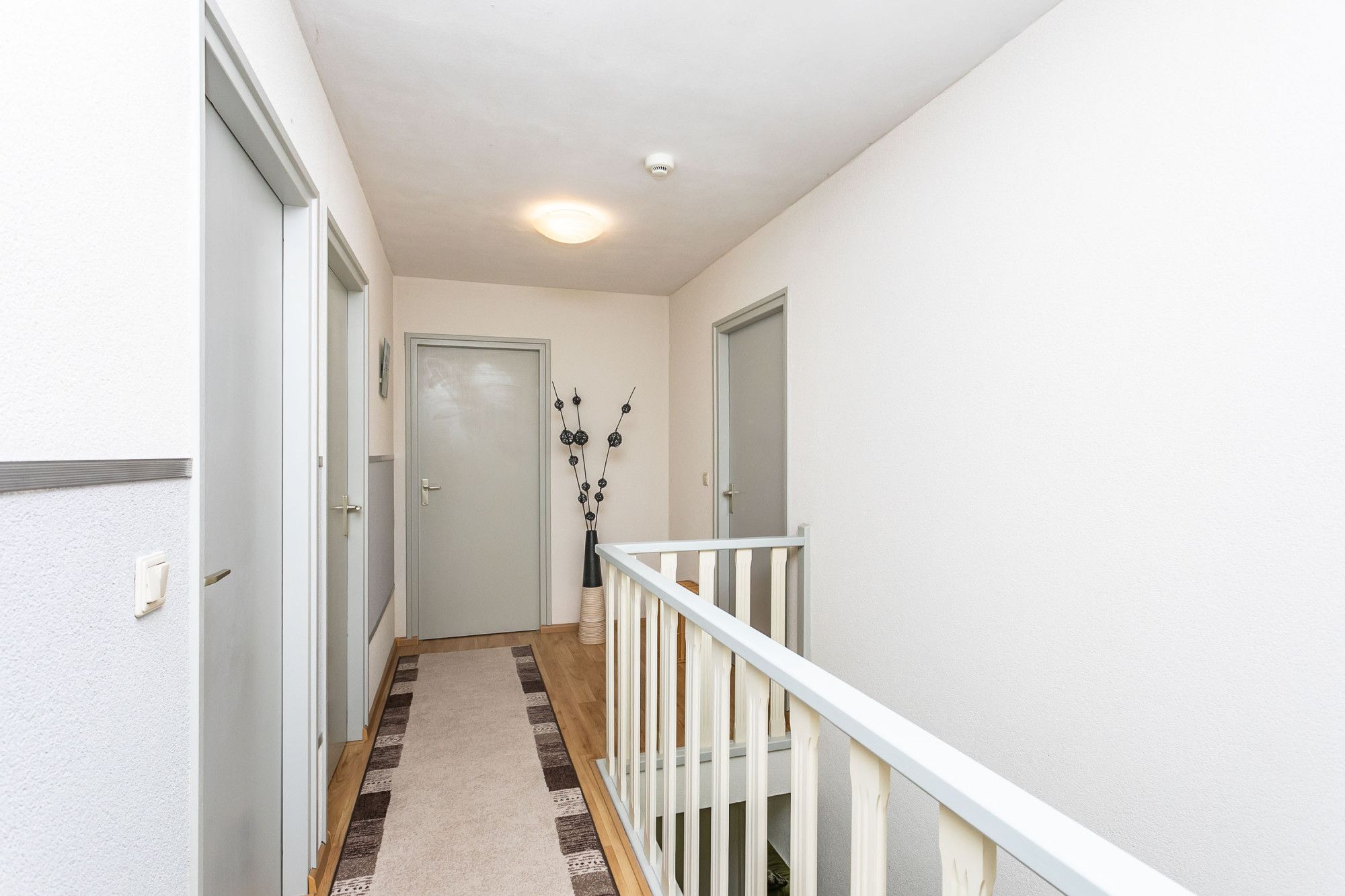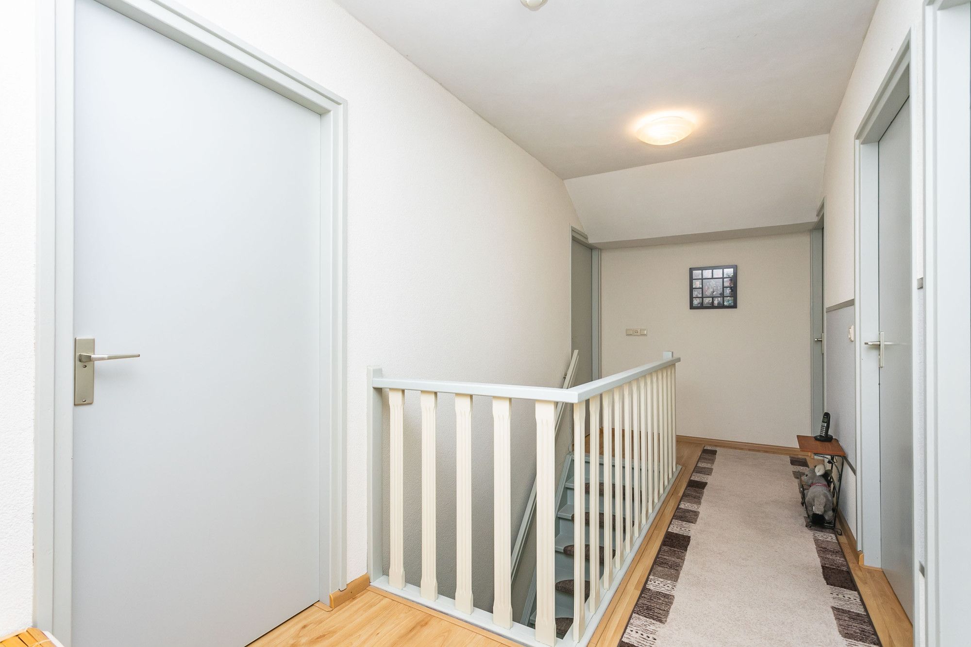 De ruime overloop biedt toegang tot de vier slaapvertrekken en de badkamer.