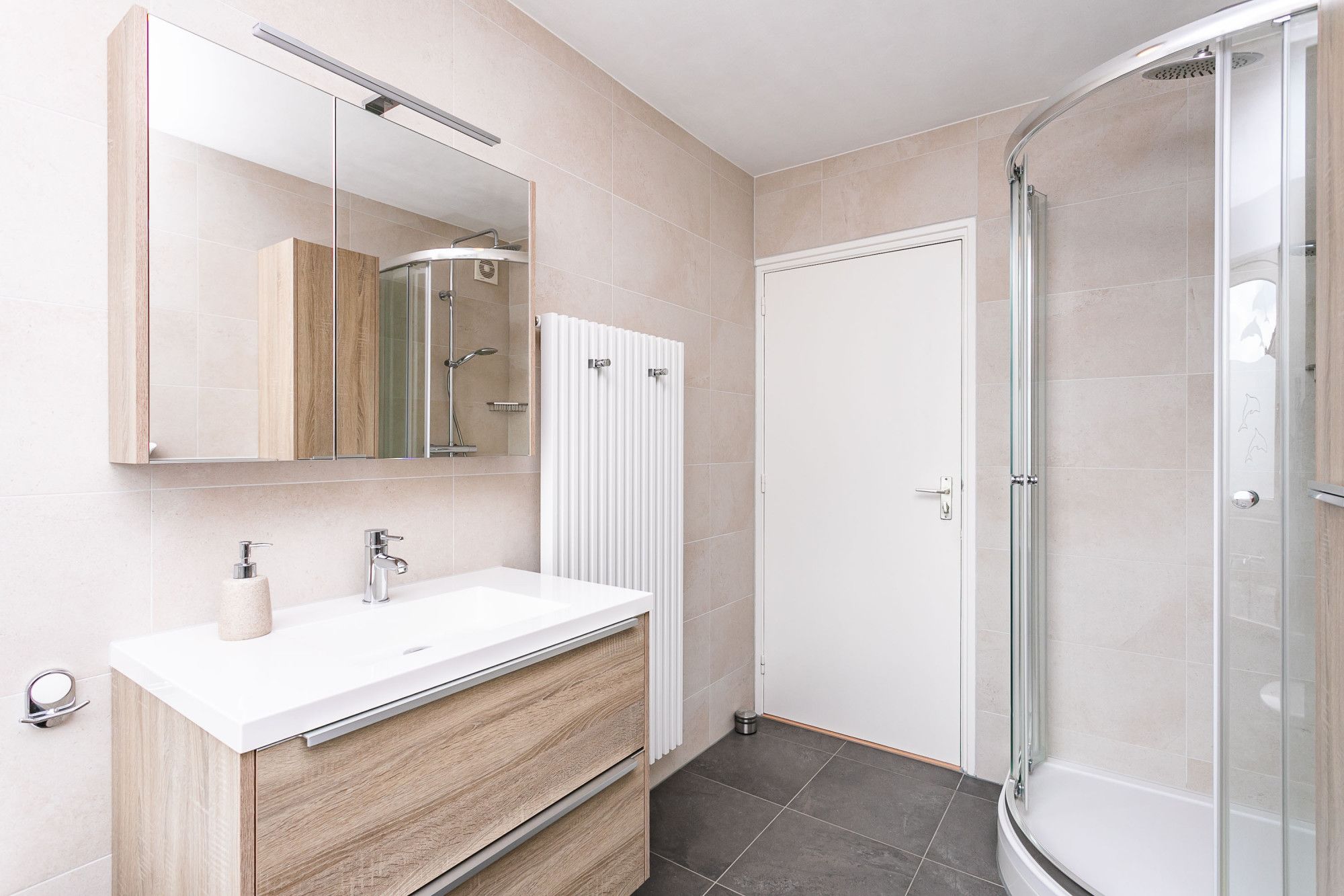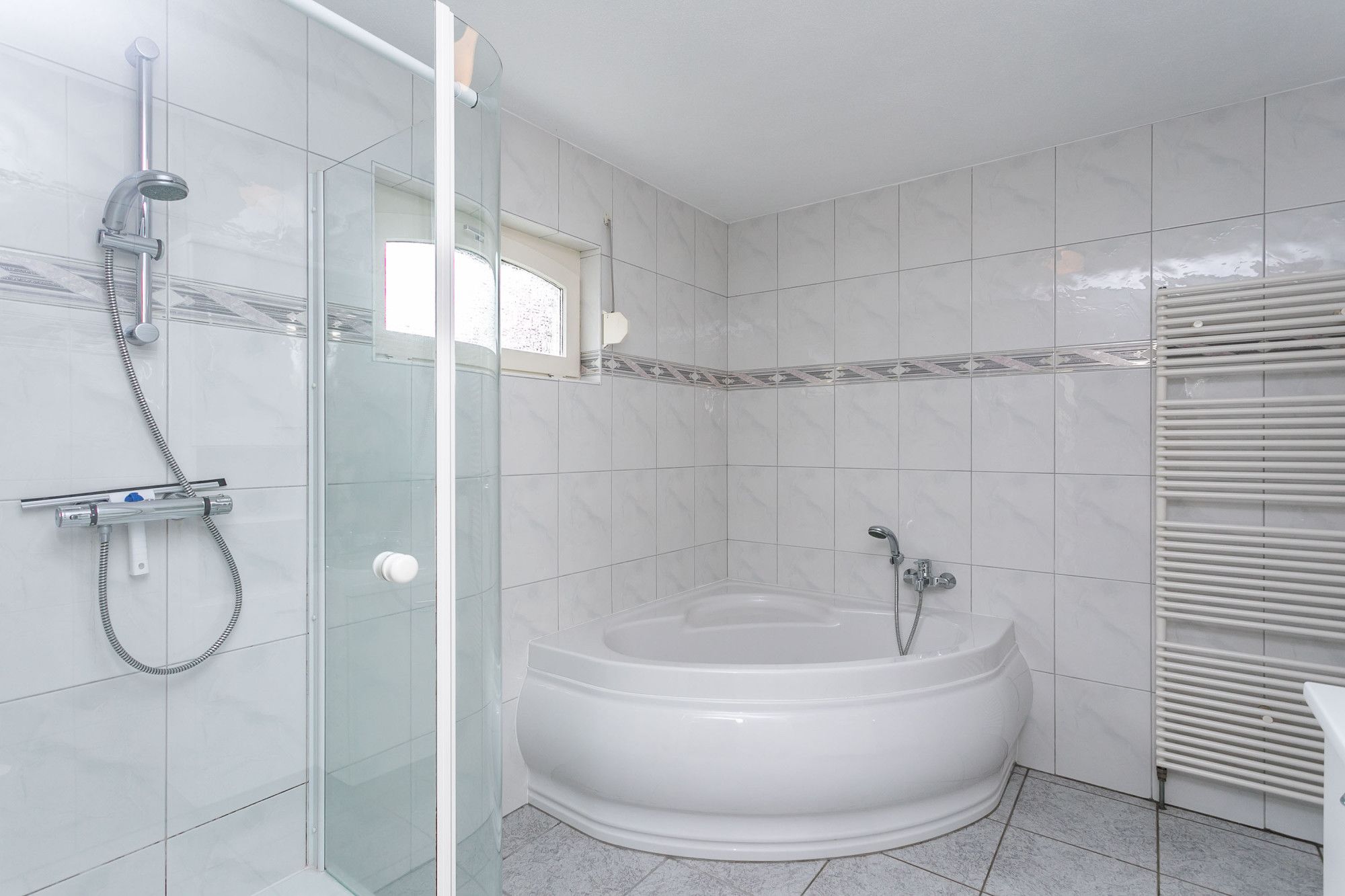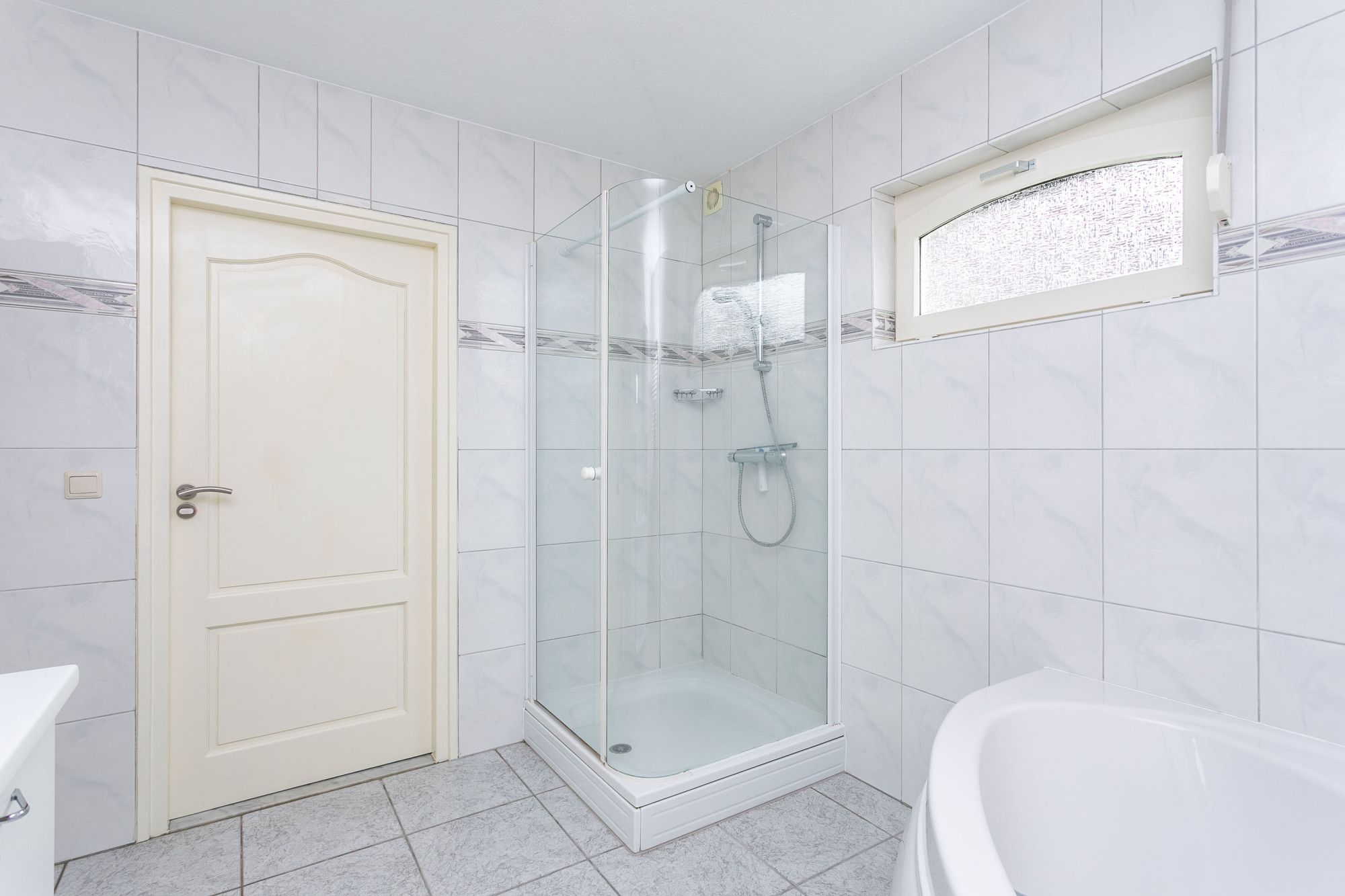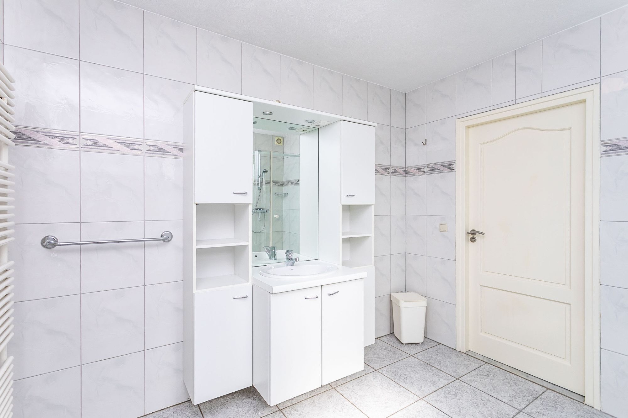 Centraal aan de overloop de gerenoveerde moderne badkamer uitgerust met een wastafel in een badkamermeubel / ligbad / douche en tweede toilet. Naastgelegen slaapkamer in gebruik als logeerkamer.