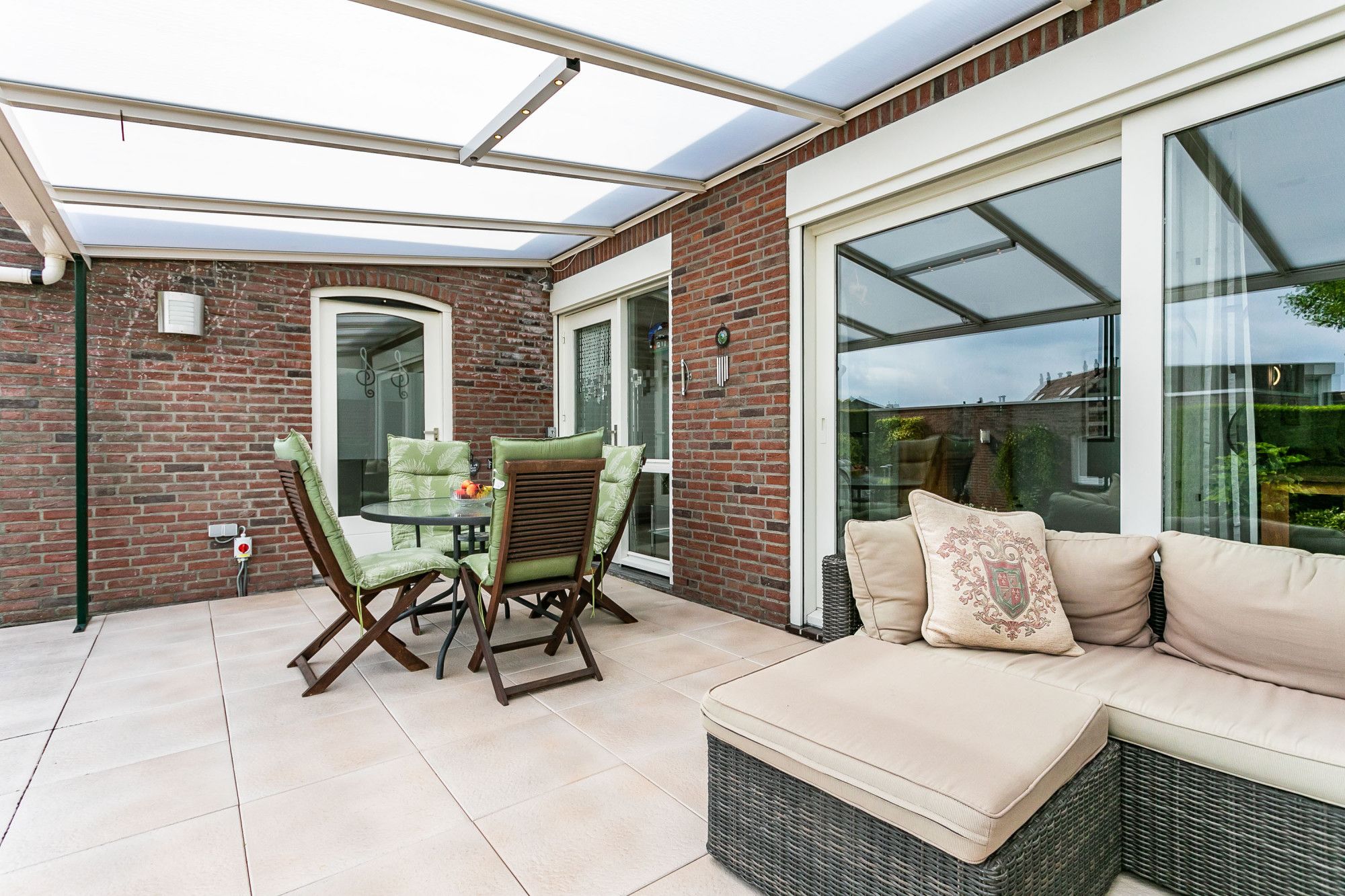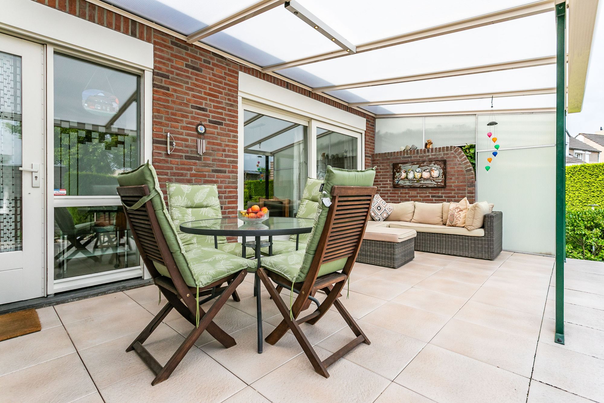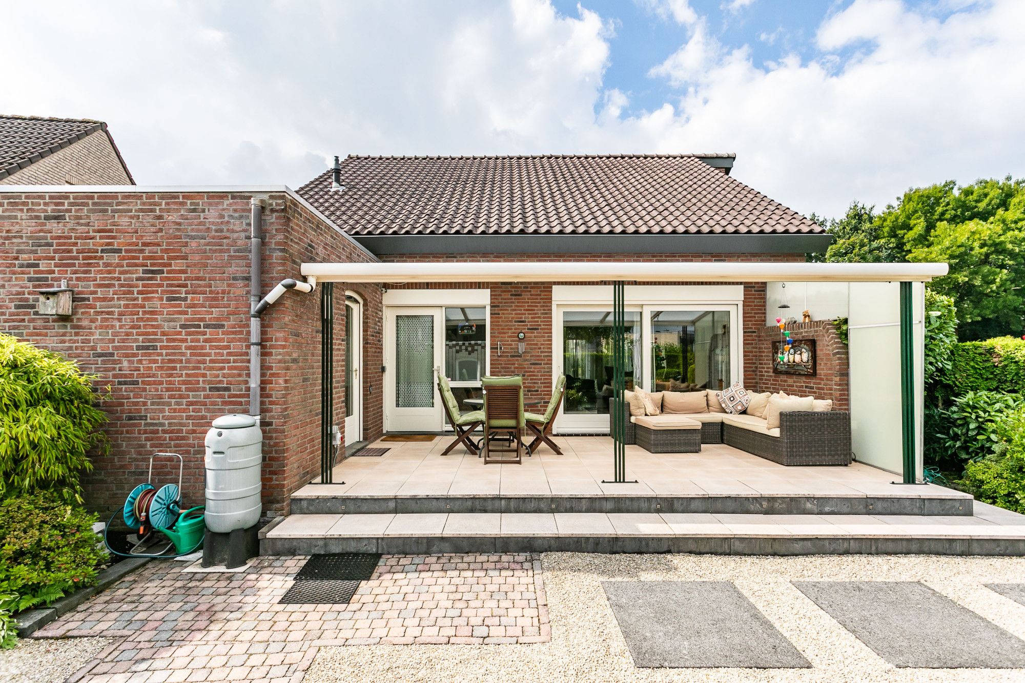 De lichte woonkamer met plavuizen vloer ademt een warme sfeer. Aan de voorzijde bevindt zich de zithoek met audio-/visuele aansluitingen, centraal in de ruimte een fraaie schouwpartij met sfeervolle gashaard. Aan de achterzijde ligt de eetkamer, waar een schuifpui zorgt voor direct tuincontact en toegang tot het royale, overdekte terras.