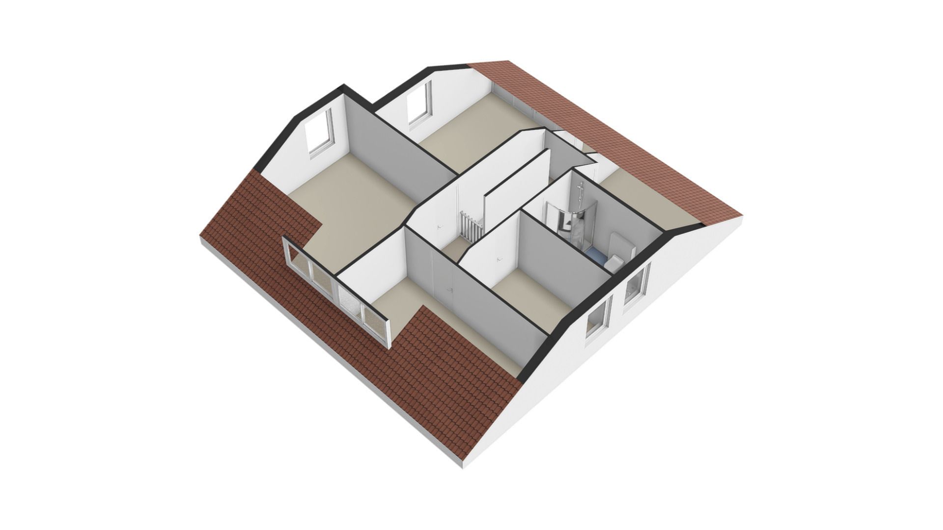 De verdieping biedt vier volwaardige kamers, momenteel ingericht als slaapkamer, hobbyruimte, logeerkamer en kleedkamer. De centraal gelegen, recent gerenoveerde badkamer beschikt over een ligbad, douche, wastafelmeubel en tweede toilet.