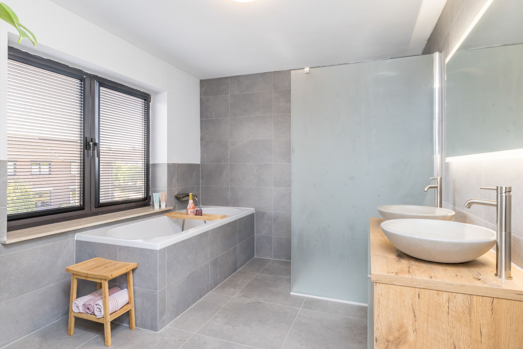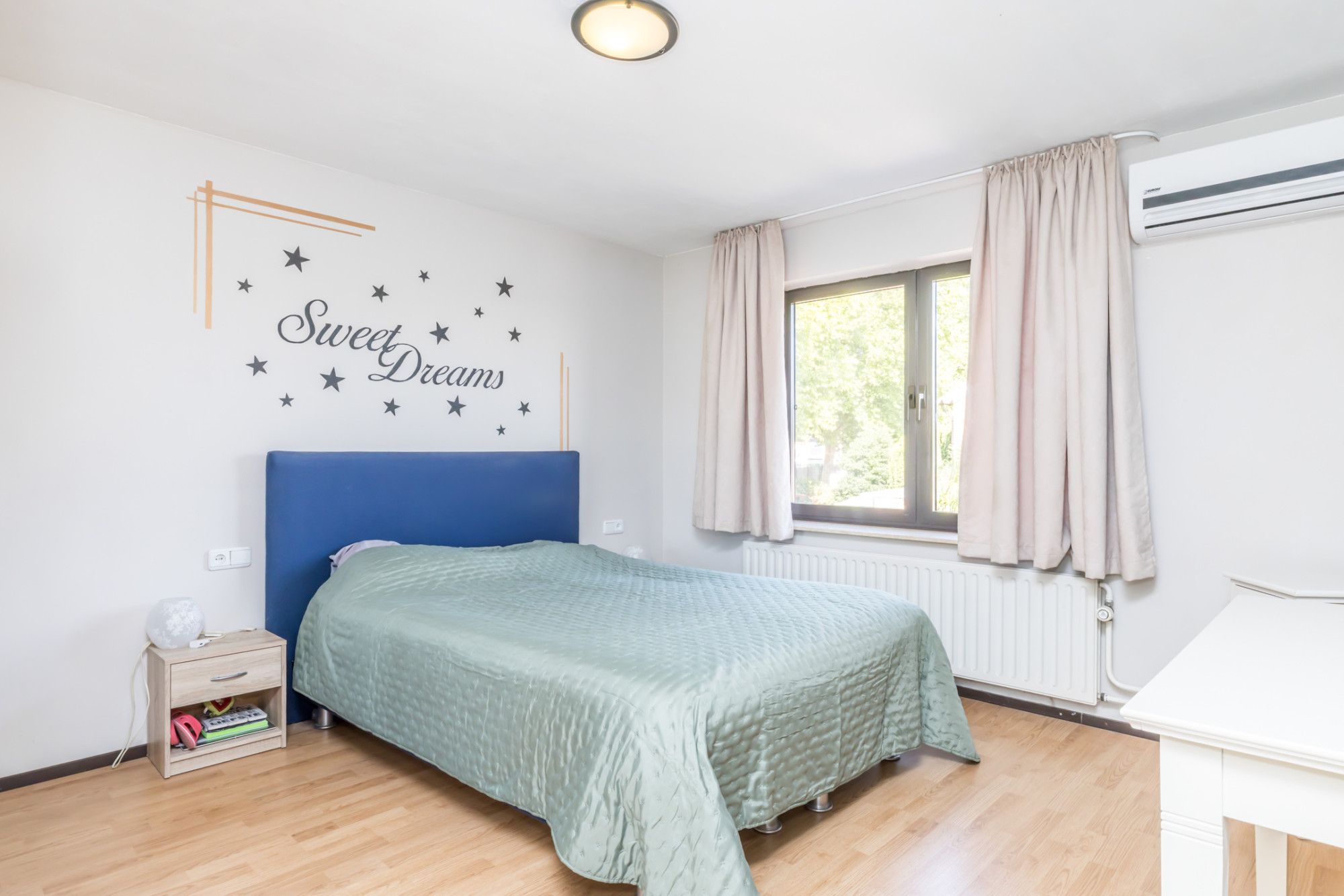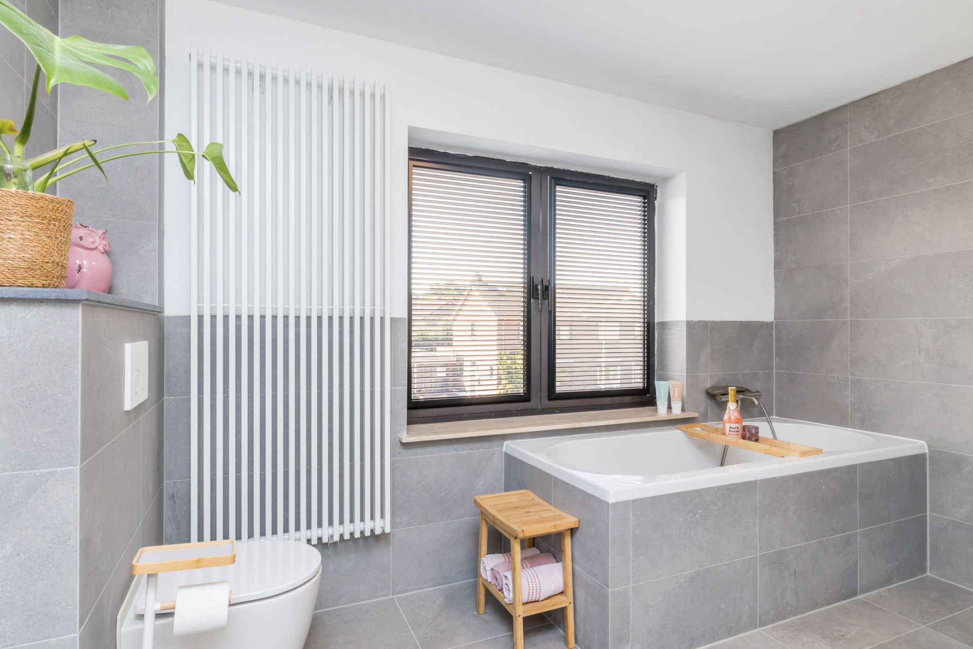 Ruime overloop met toegang tot twee comfortabele slaapkamers, een stijlvolle en grotendeels betegelde badkamer die is uitgerust met een modern ligbad, een royale inloopdouche, een hangend toilet en een strak vormgegeven wastafelmeubel met 2 wasbakken. De slaapkamers zijn ca. 14 m² en 4 m² en zijn beiden gelegen aan de achterzijde van de woning. De ouderslaapkamer beschikt over airconditioning. De voormalige badkamer is omgetoverd tot een praktische witgoedruimte of bergruimte, kortom een ideale ruimte voor extra opslag of wasvoorzieningen in huis.