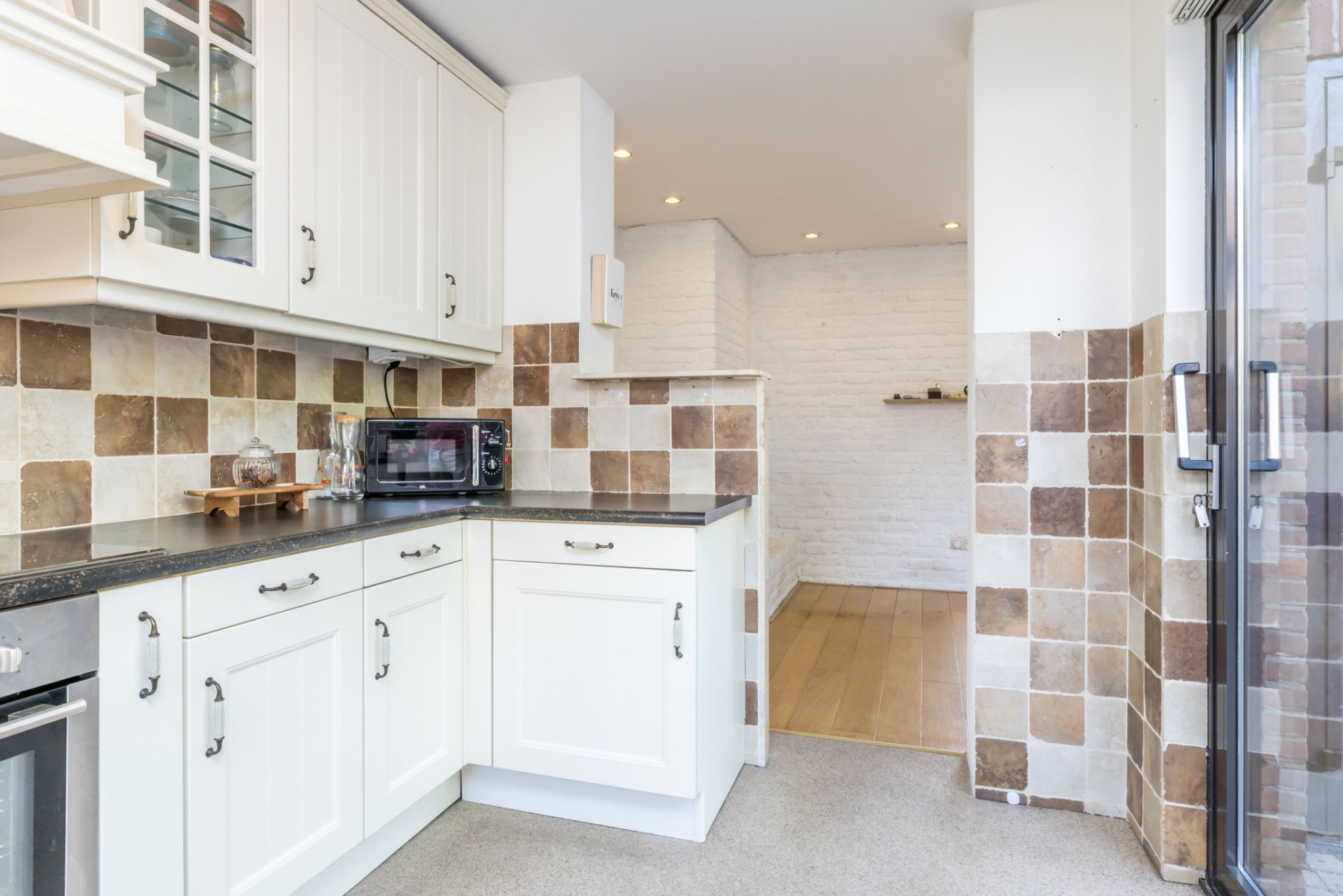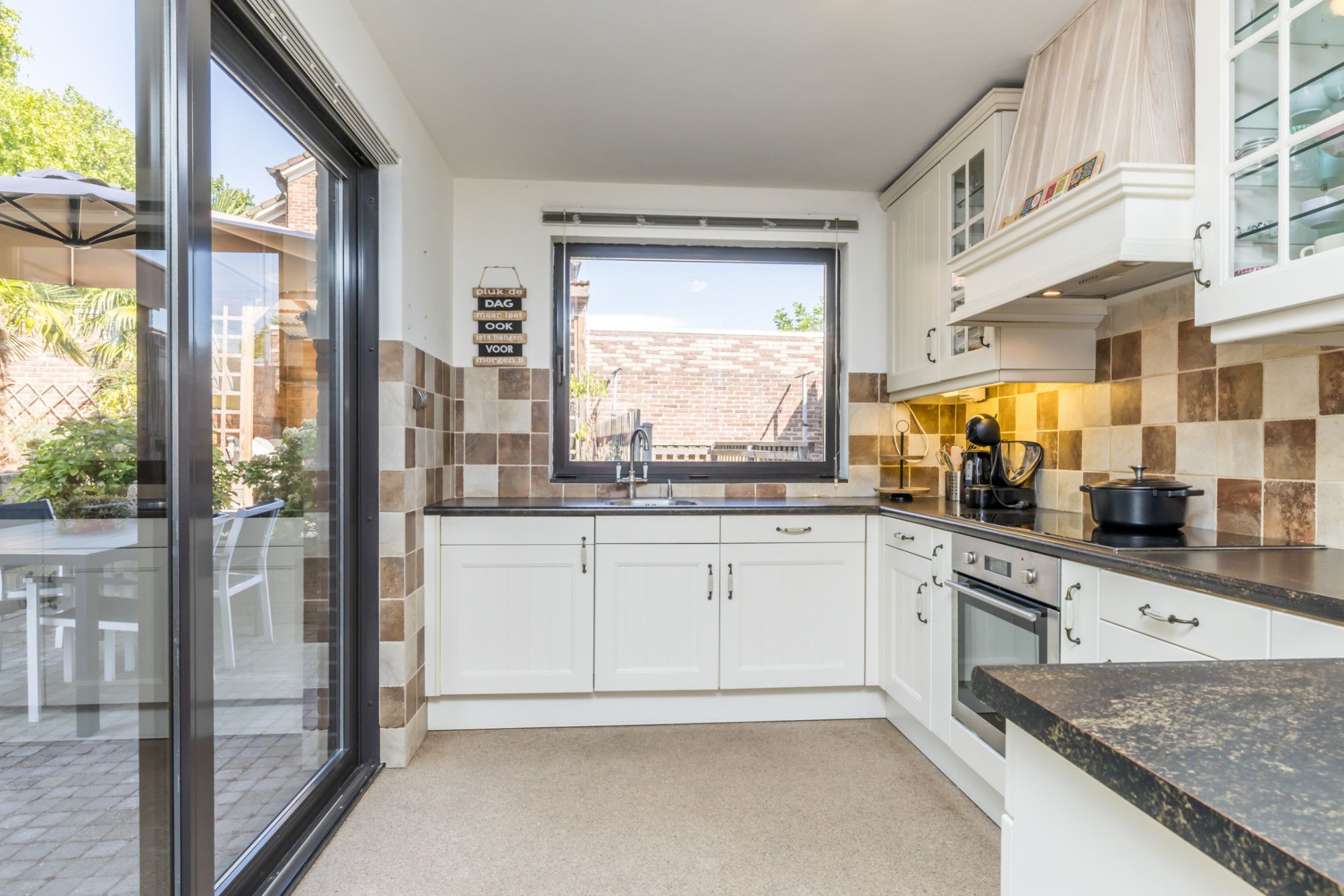 De halfopen keuken is gerealiseerd in de aanbouw en is opgesteld in een functionele U-vorm en voorzien van diverse inbouwapparatuur, waaronder een 5-pits keramische kookplaat, een elektrische oven, een afzuigkap en een koelkast. De keuken is afgewerkt met een grindvloer en biedt tijdens het koken zicht op de achtertuin.