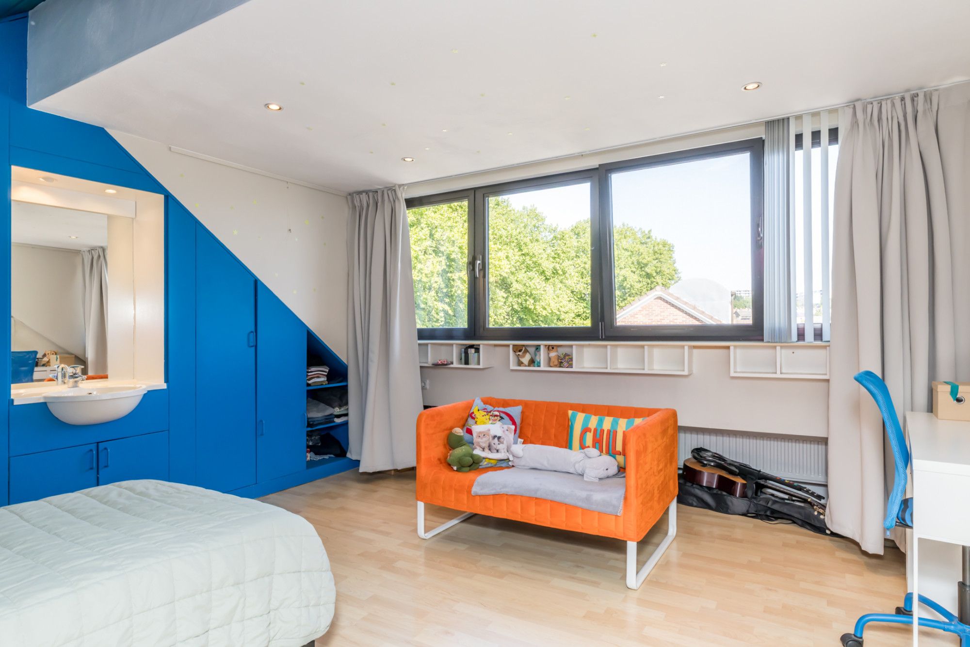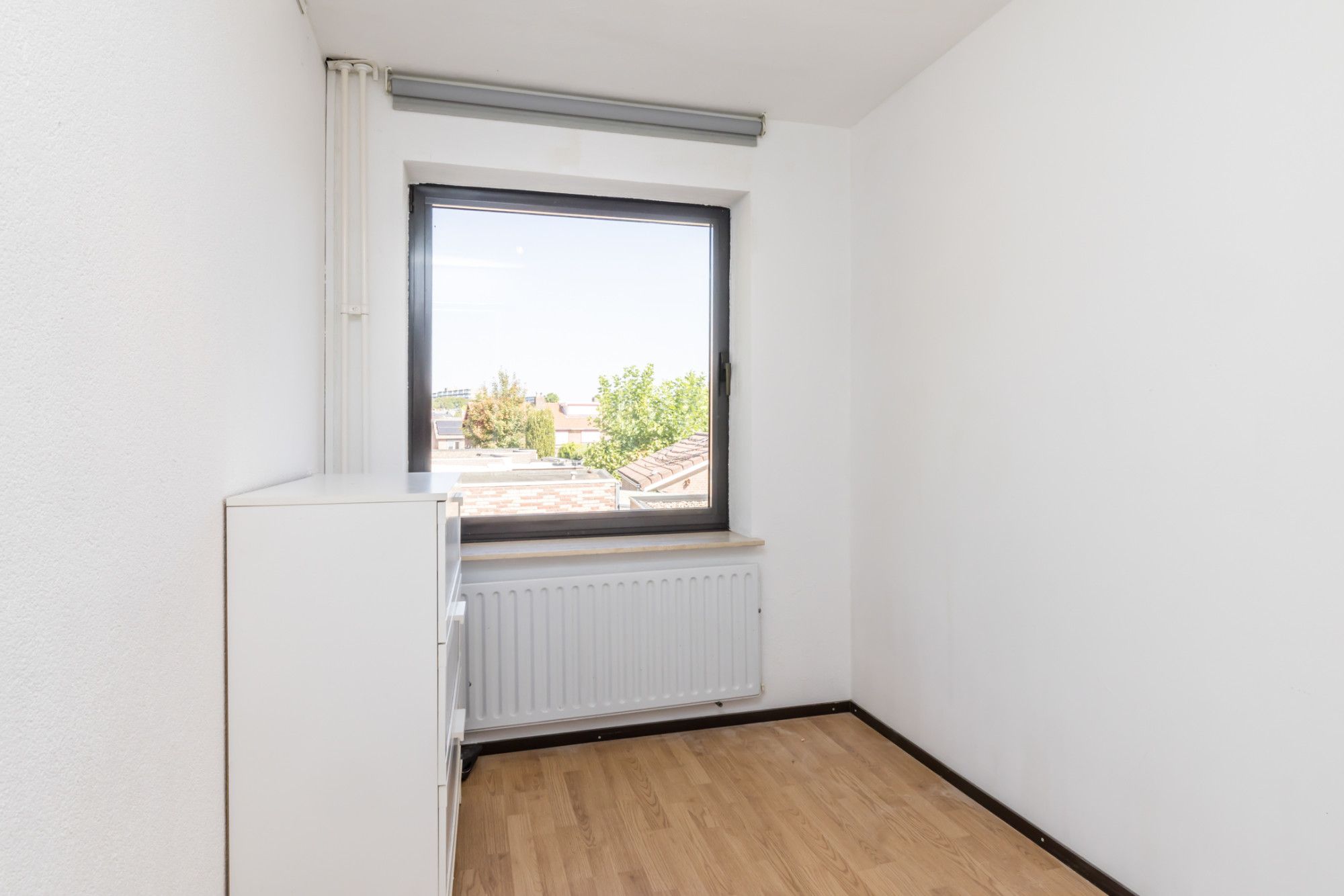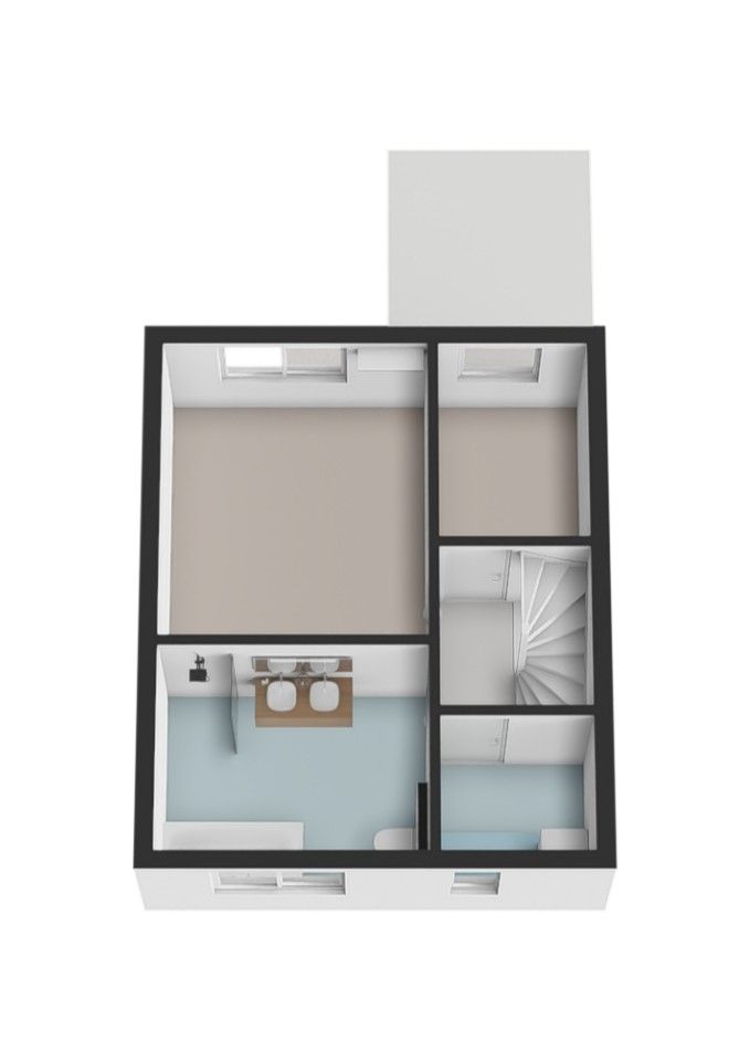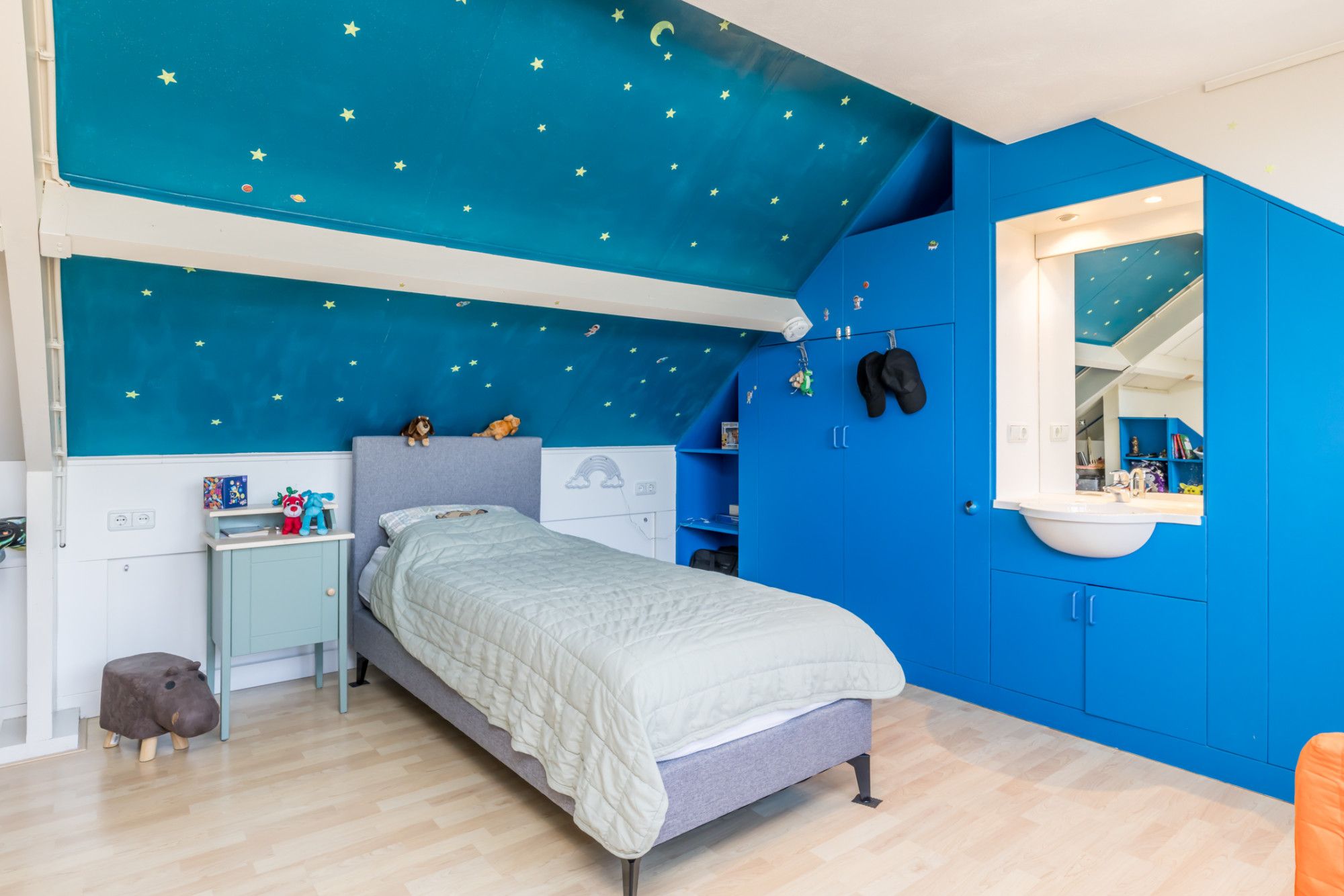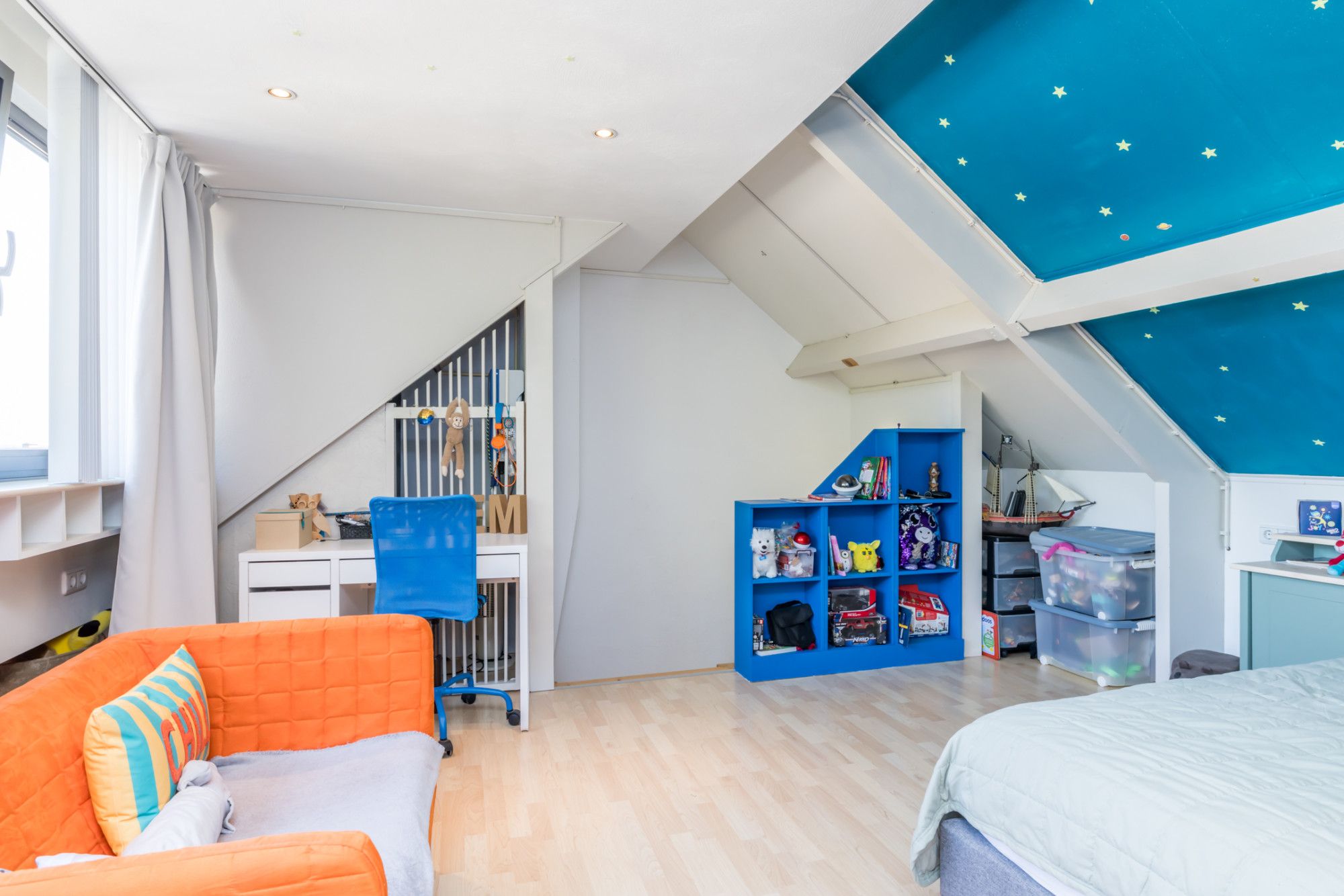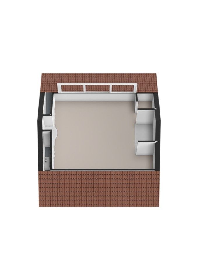 Ruime, via een vaste trap bereikbare derde slaapkamer, voorzien van een moderne laminaatvloer. Aan de achterzijde bevindt zich een groot kunststof dakkapel, wat zorgt voor veel natuurlijk lichtinval. De kamer beschikt over een praktische, ingebouwde kastenwand met stijlvolle wastafel. Aan de voorzijde is er extra bergruimte onder de schuine daklijn. Tevens is hier de energiezuinige omvormer voor de zonnepanelen geplaatst.