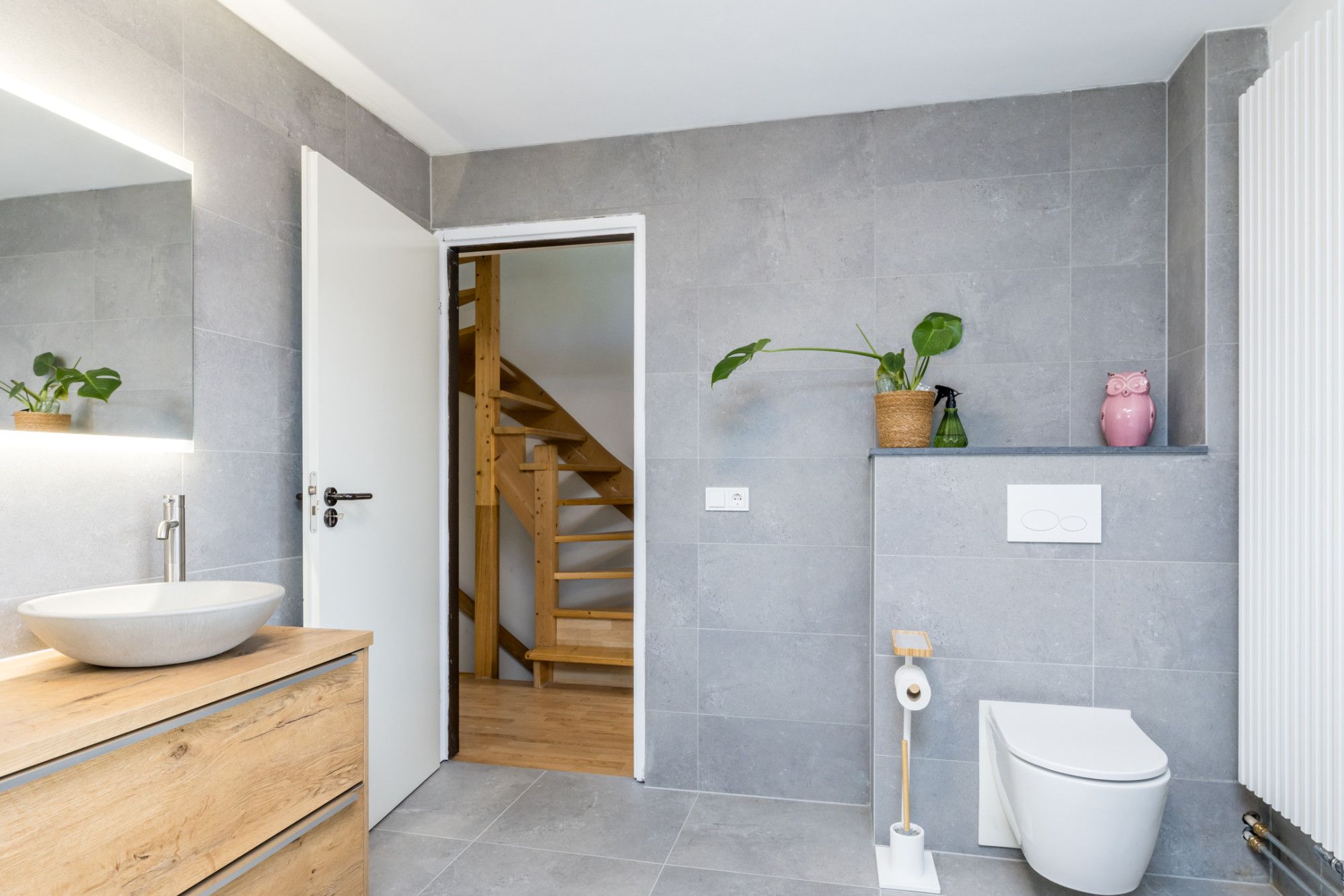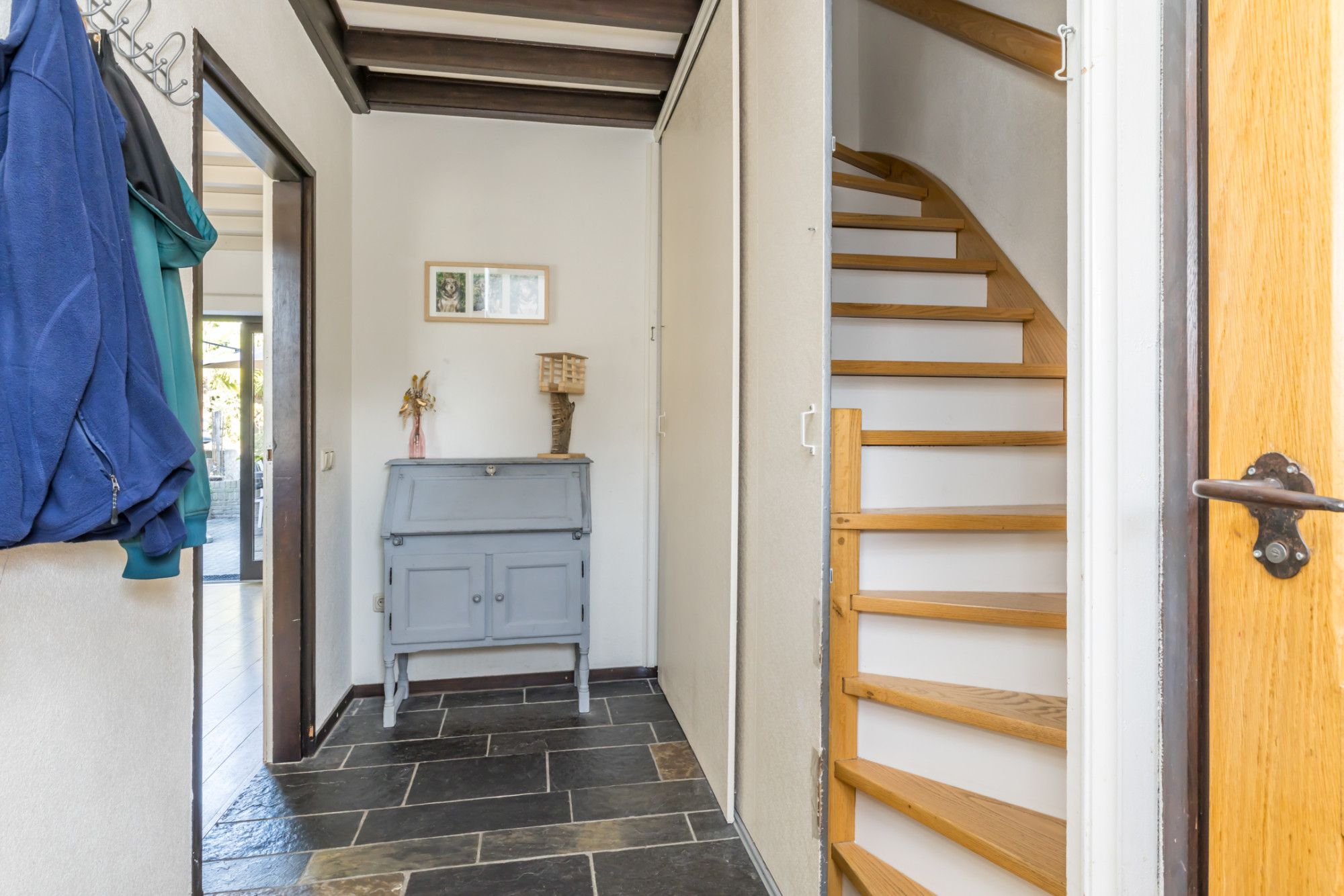 Binnenkomst via een nette entree/hal met een stijlvolle plavuizenvloer. Hier bevinden zich de volledig betegelde toiletruimte, met modern zwevende toilet met fontein en verwarming, evenals de meterkast, trapopgang naar de 1e verdieping en toegang tot de woonkamer.