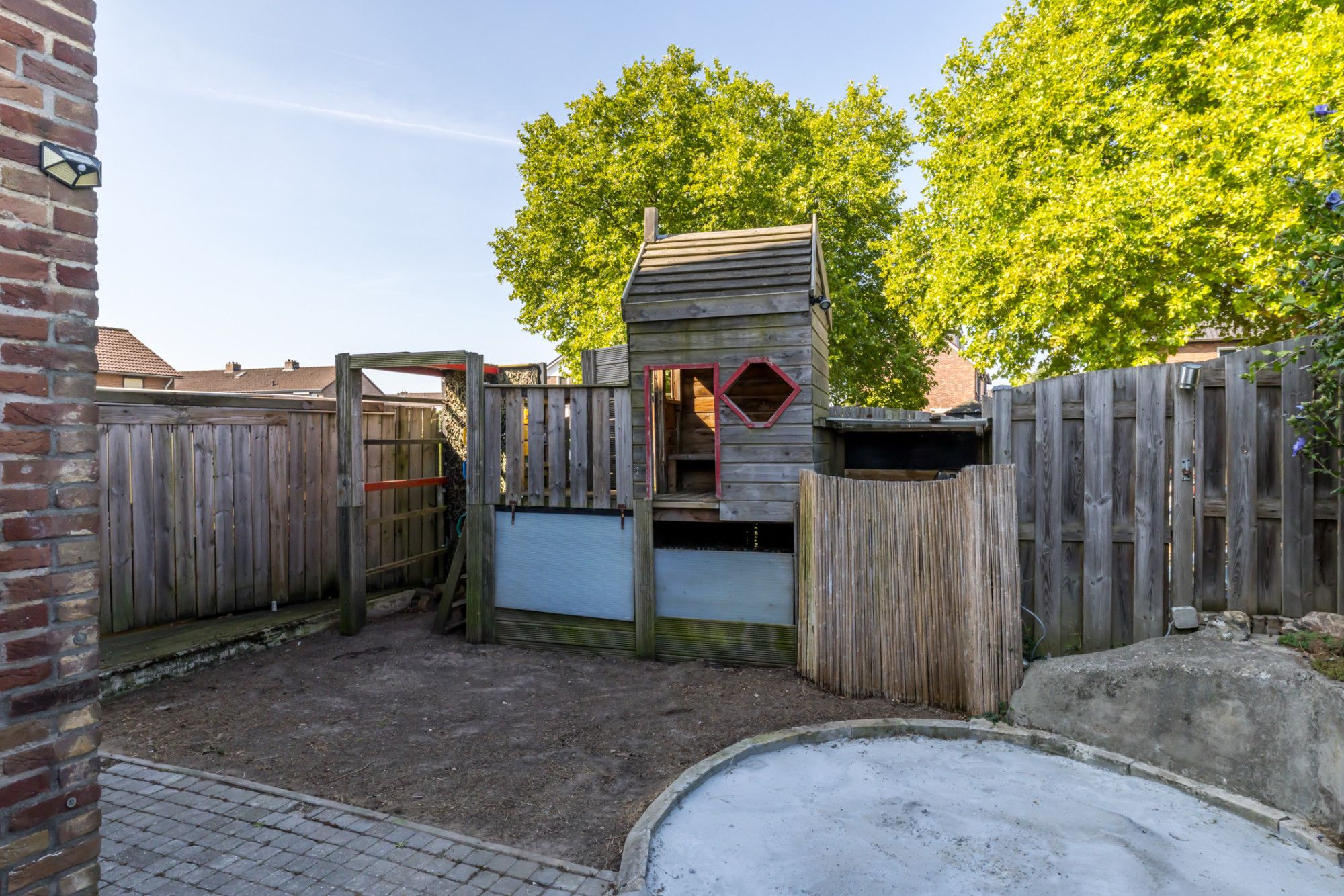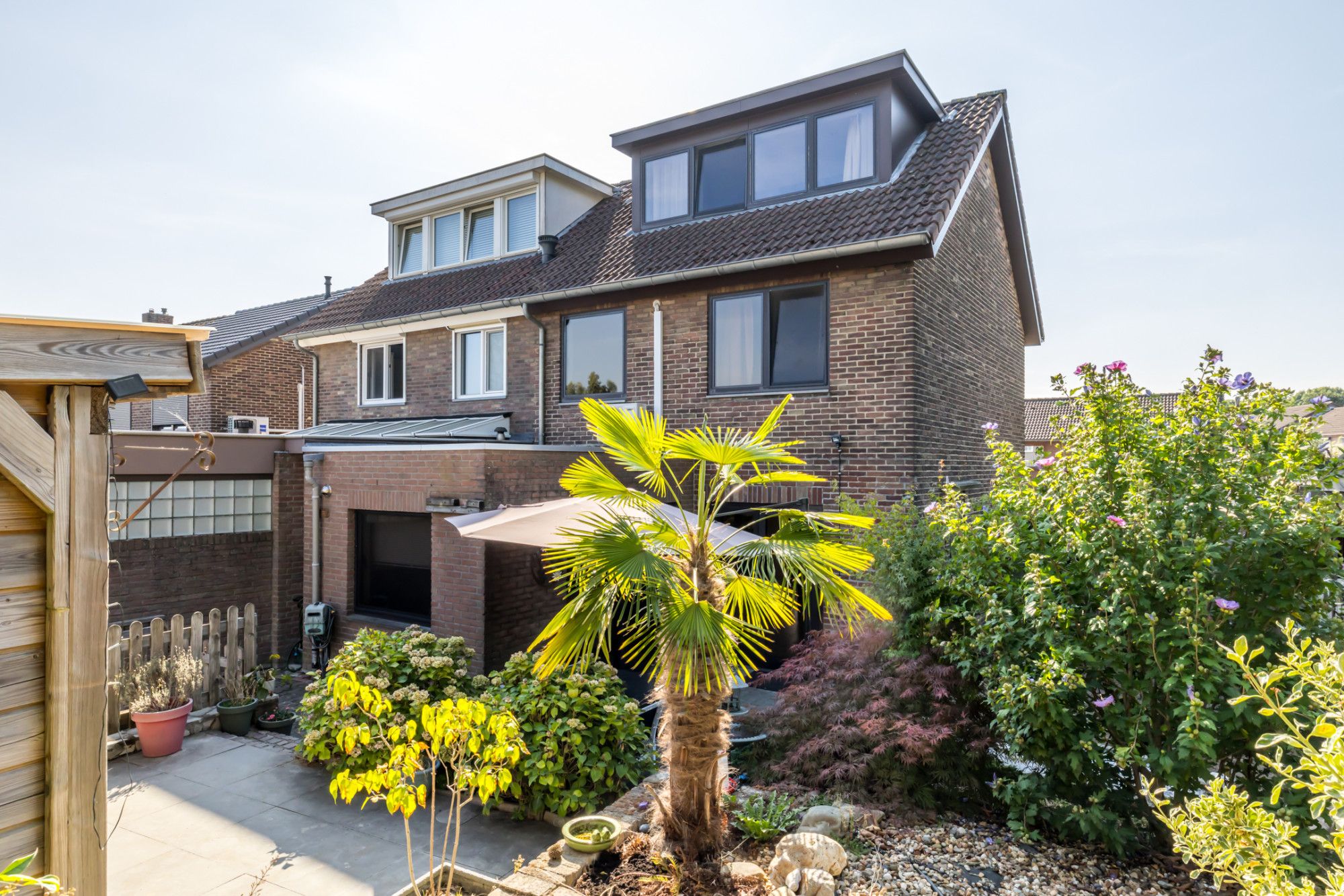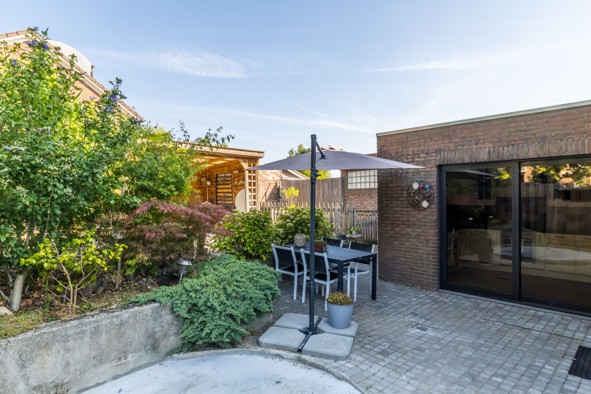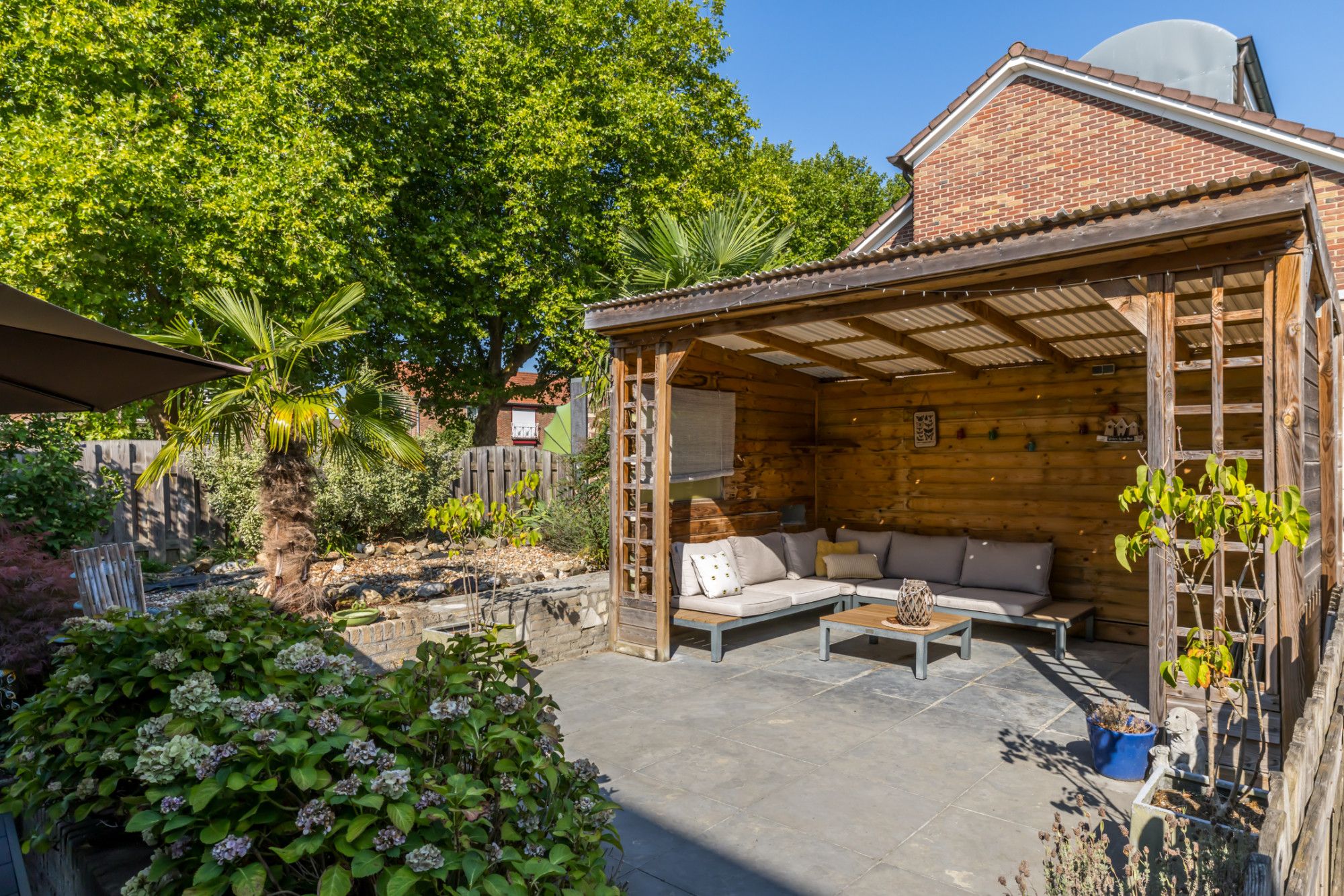 Direct achter de woning is een fraai terras gelegen. Aan de achterzijde van de tuin is een overdekt terras gesitueerd. Onderhoudsvriendelijke achtertuin met enkele plantenborders. Tuinberging aan voorzijde van de tuin en toegang tot de garage. Via voorzijde toegankelijk (naast de woning).