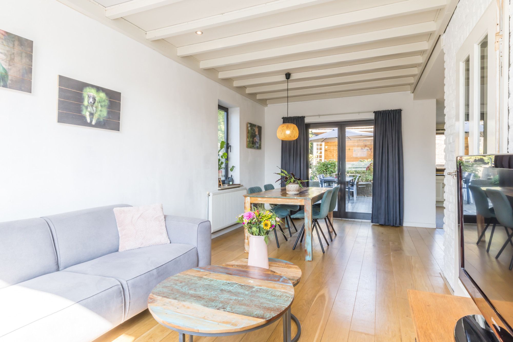 De royale doorzonwoonkamer met klassieke parketvloer en karakteristiek Oud-Hollandse plafond straalt sfeer uit en geniet veel lichtinval. De woonkamer is L-vormig ingedeeld en beschikt over een charmante open haard met schouwpartij. Via de schuifpui aan de achterzijde van de woonkamer heb je direct toegang tot de zonnige achtertuin.