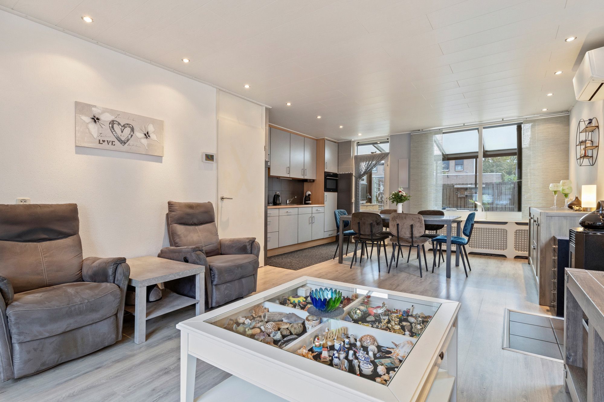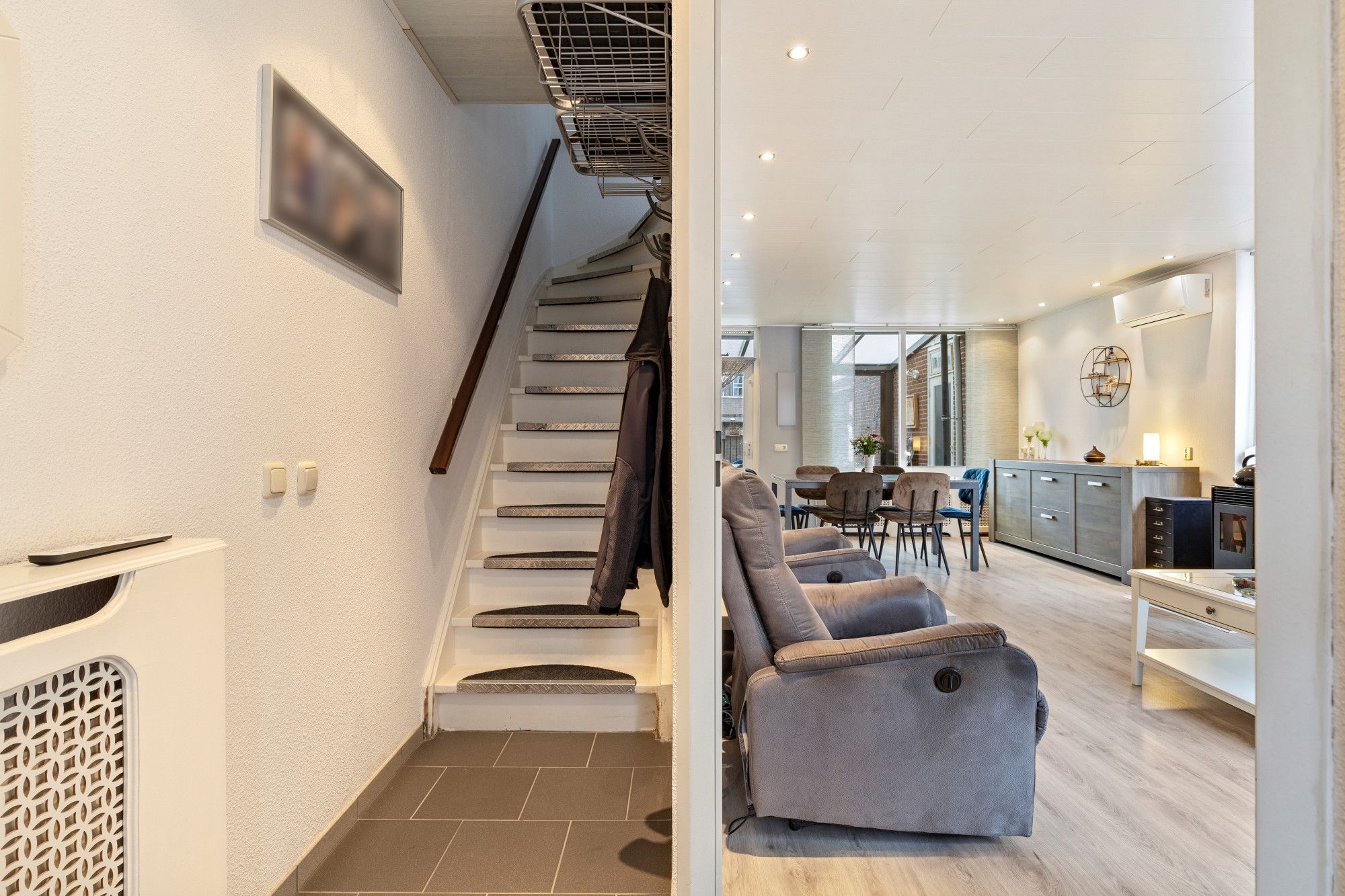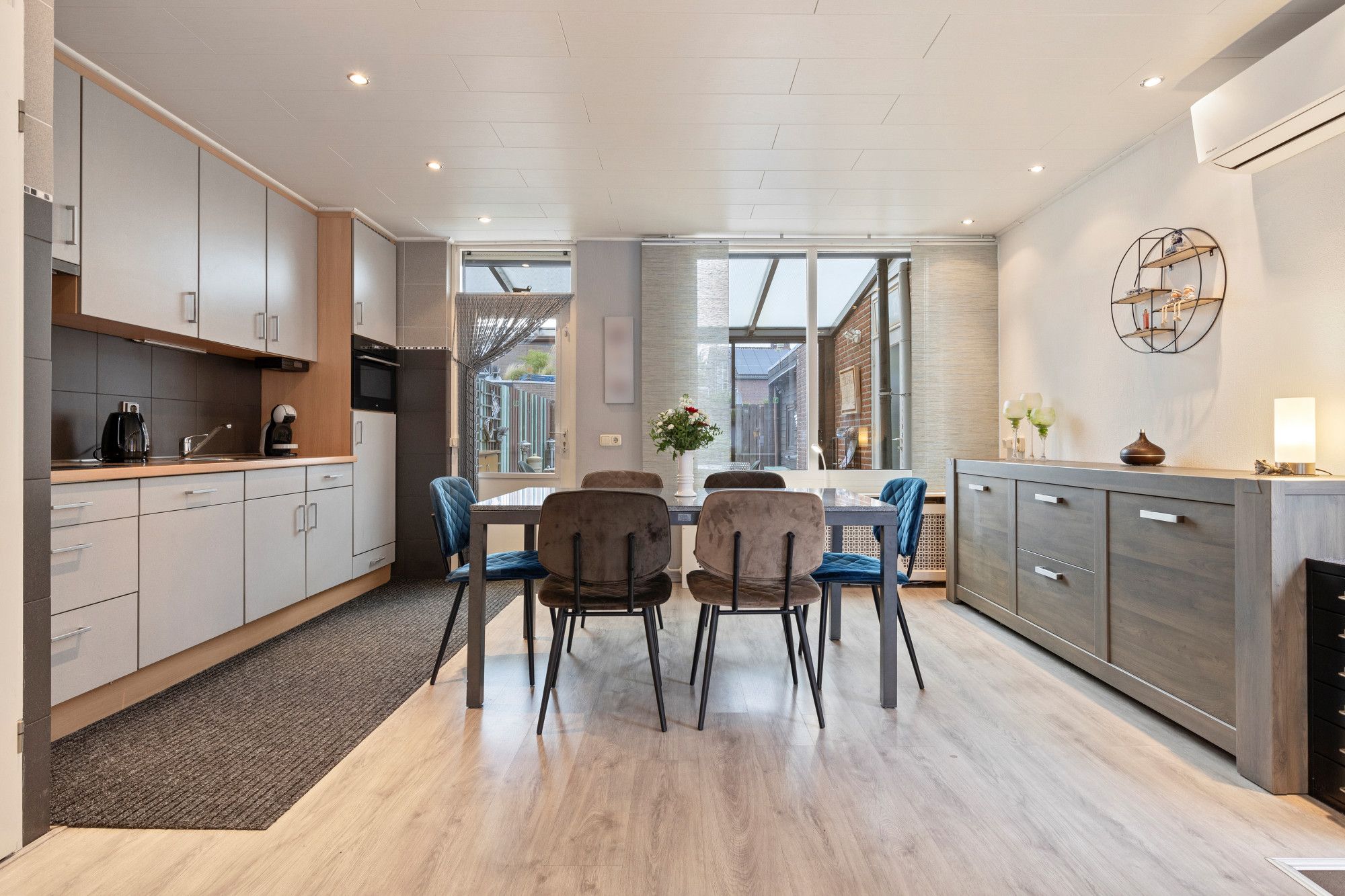 Doorzon woonkamer v.v. laminaatvloer, trapberging, airconditioning en knusse pellet kachel, open keuken met modern keukenblok inclusief apparatuur, te weten, combi-oven, inductie kookplaat, vaatwasser en wasemkap.