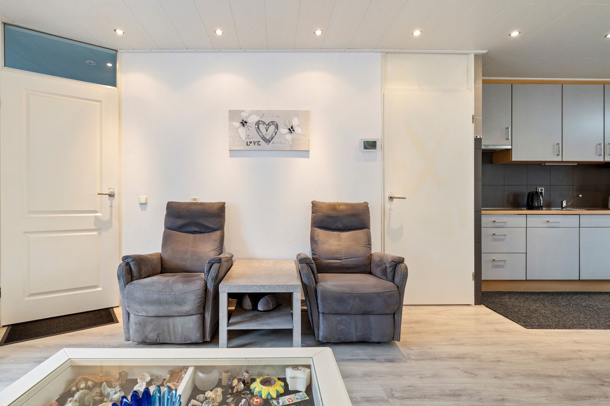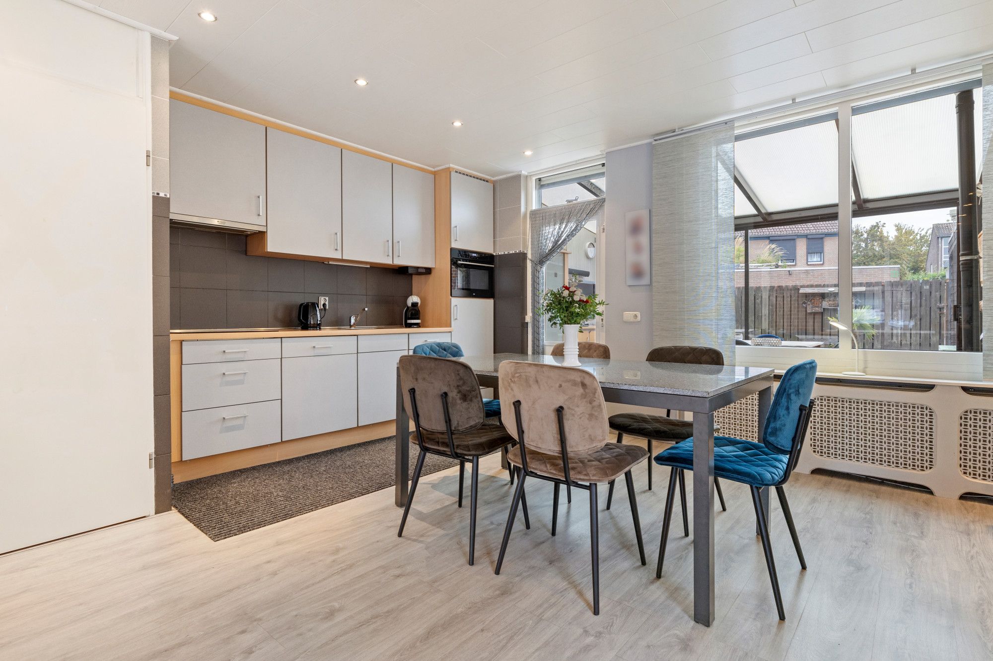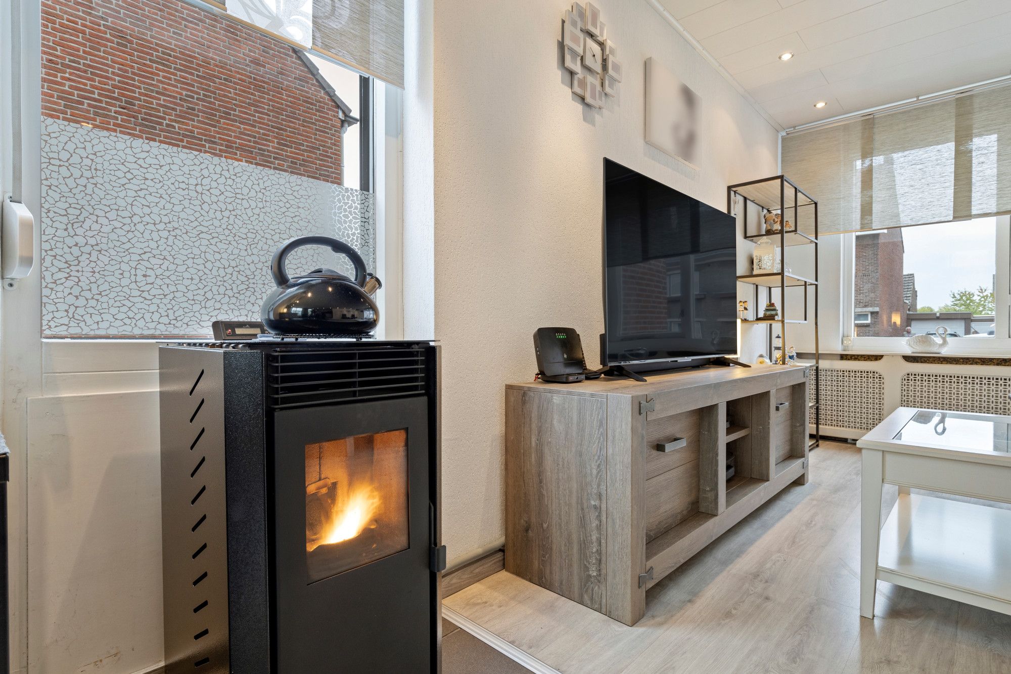 Doorzon woonkamer v.v. laminaatvloer, trapberging, airconditioning en knusse pellet kachel, open keuken met modern keukenblok inclusief apparatuur, te weten, combi-oven, inductie kookplaat, vaatwasser en wasemkap.