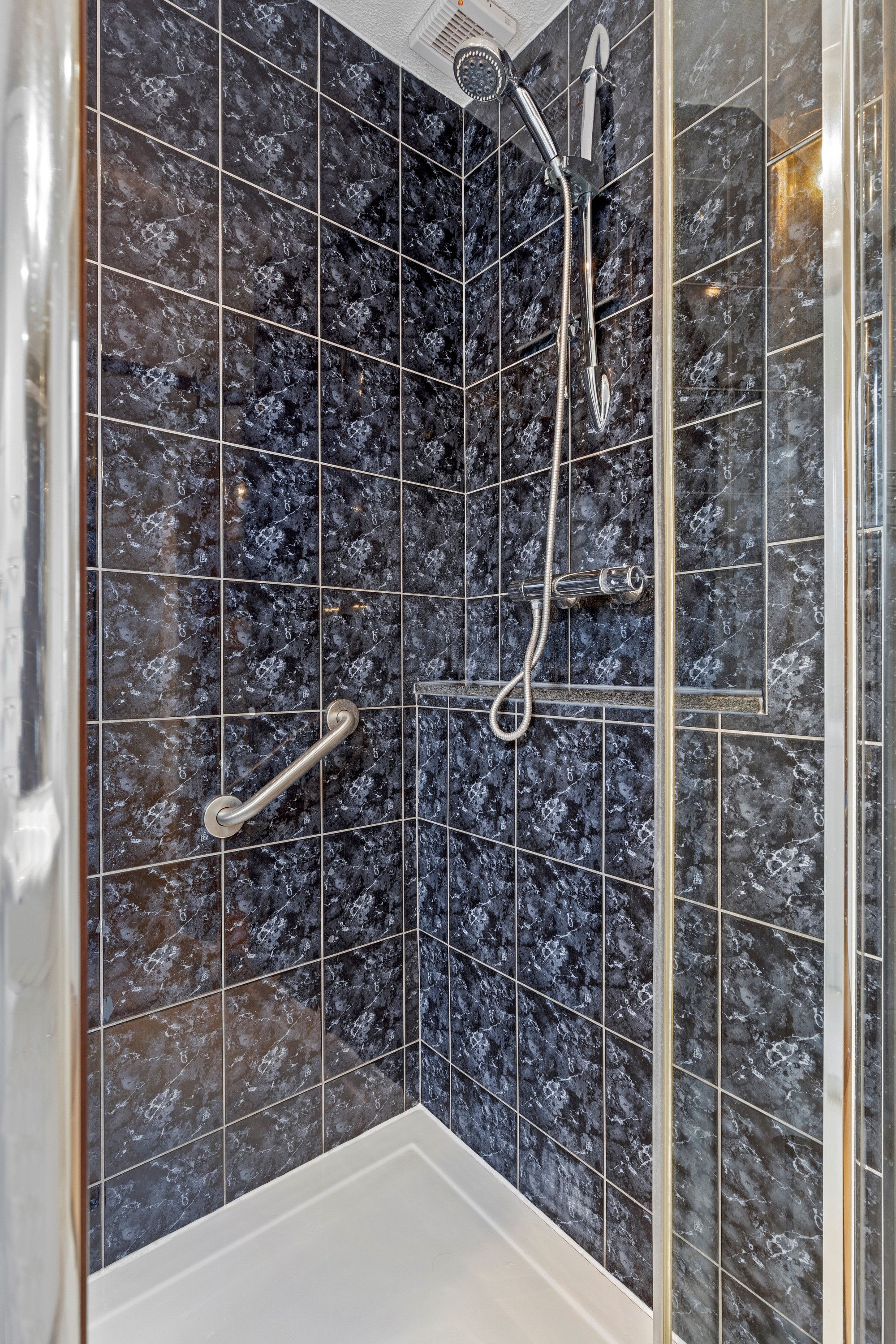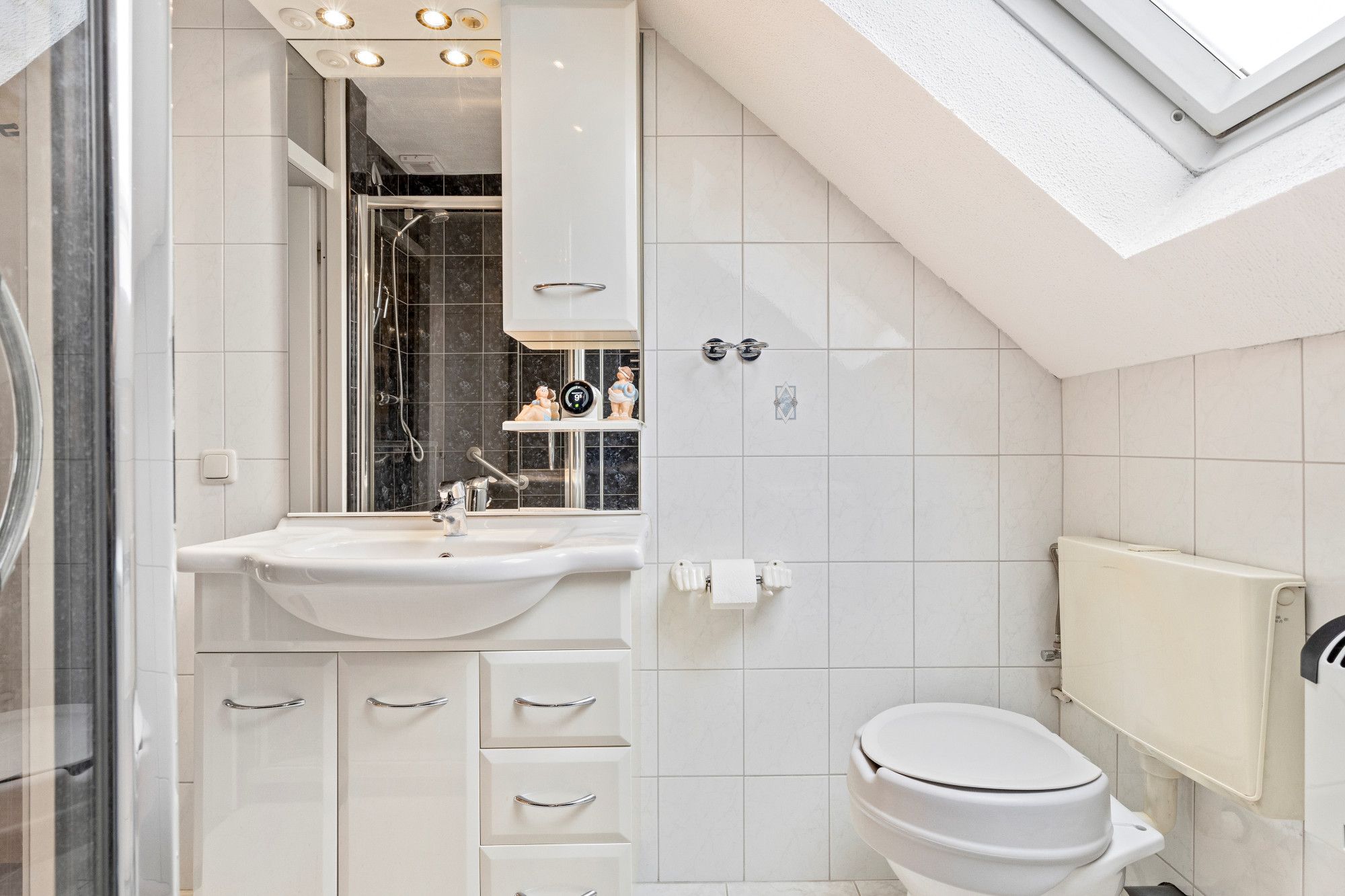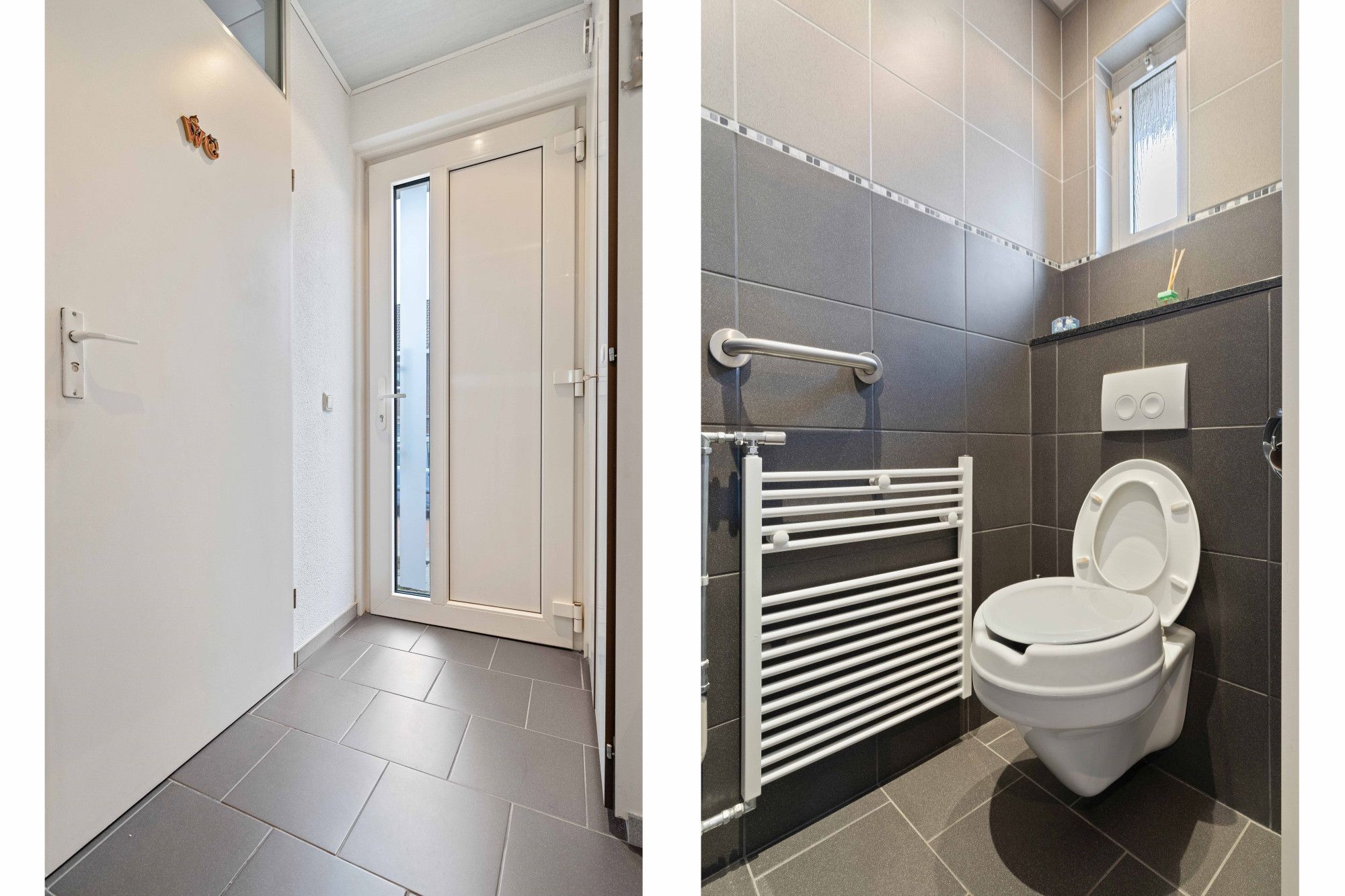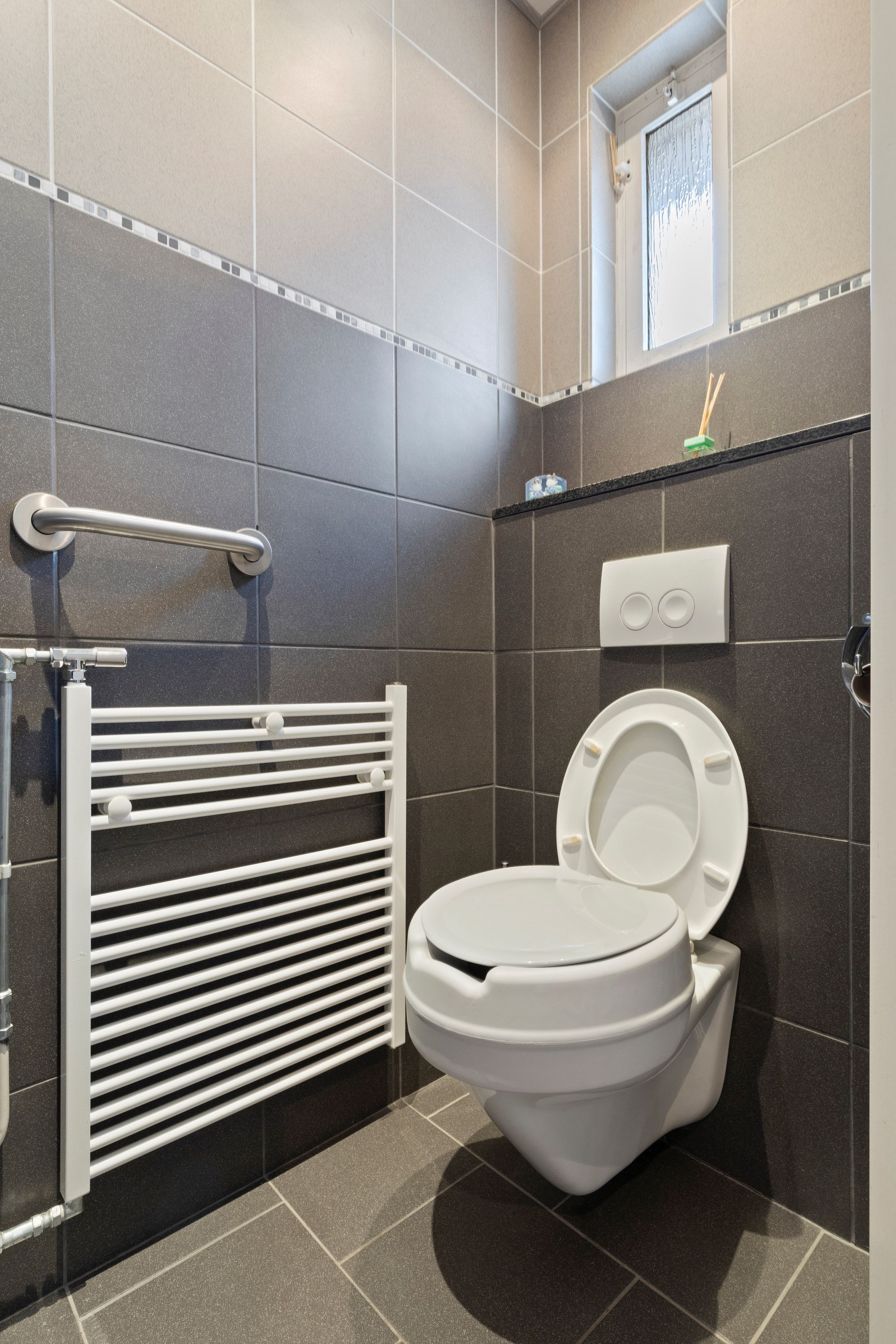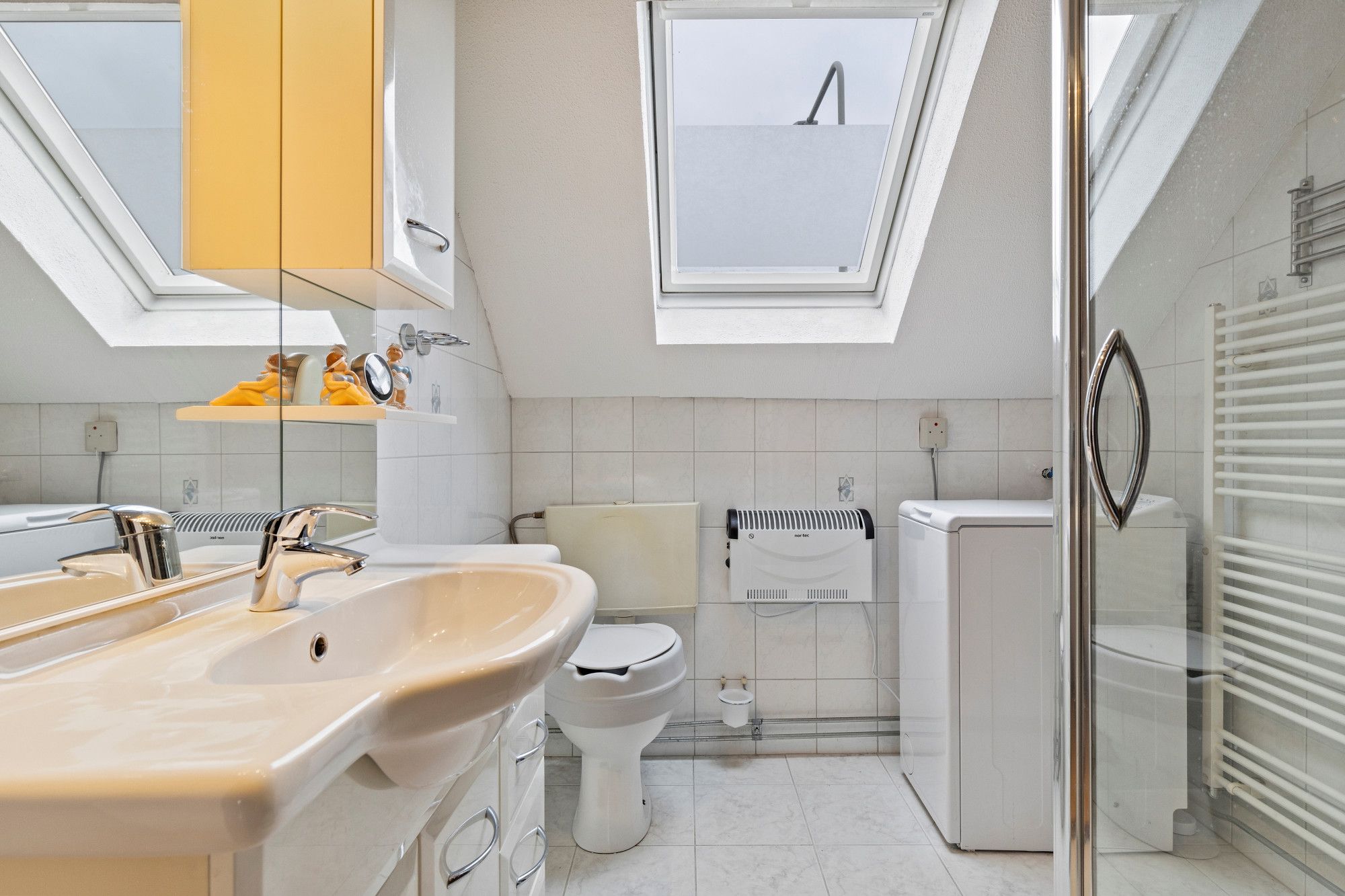 Geheel betegelde badkamer v.v. douchecabine, vaste wastafel, 2e toilet en aansluitpunt voor een wasmachine