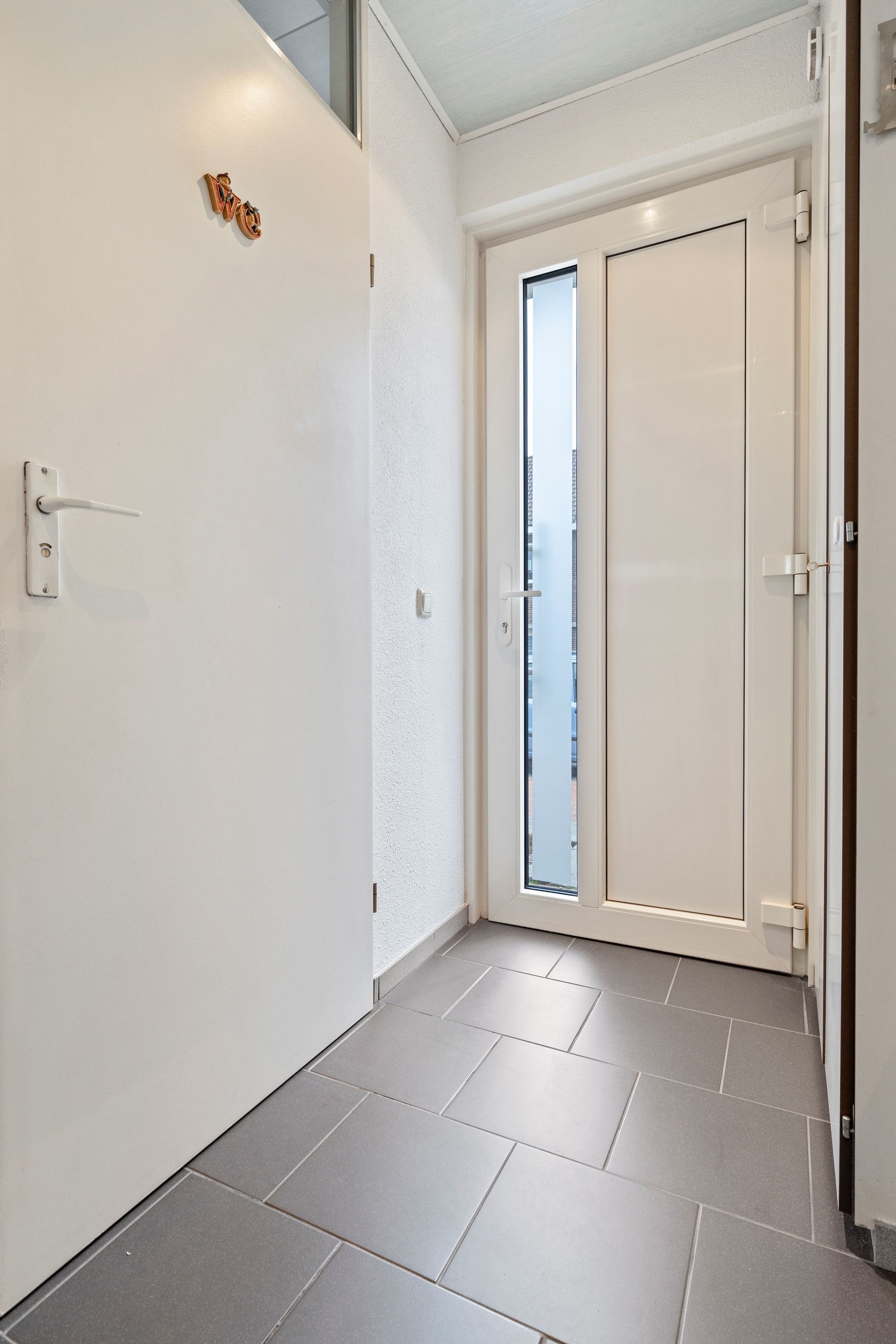 Hal/entree v.v. plavuizenvloer, betegelde toiletruimte met fonteintje en Meterkast.