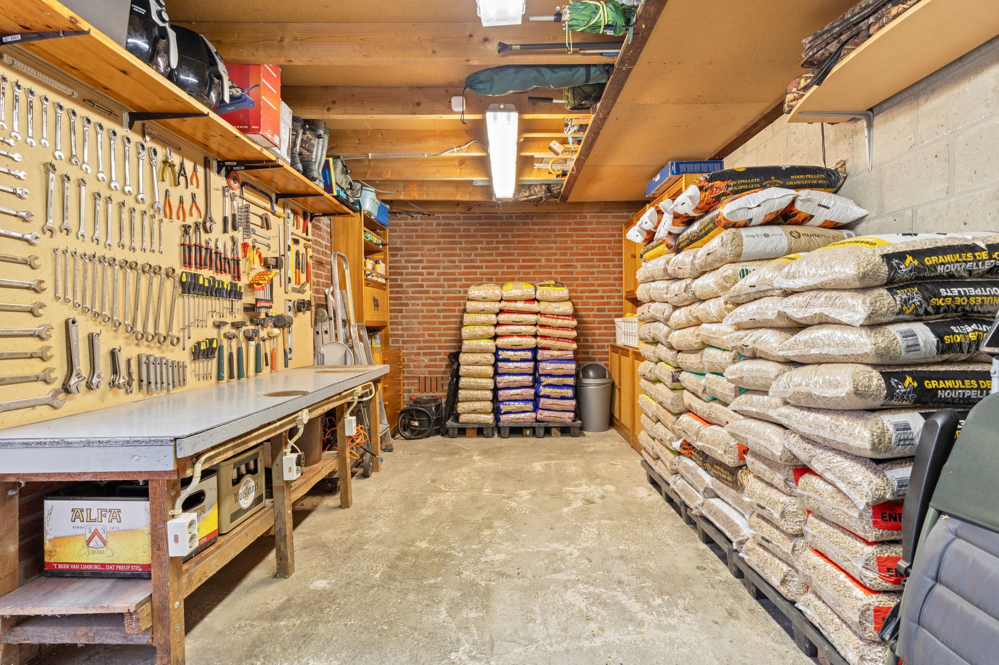 Fijne serre v.v. laminaatvloer, aluminium schuifpui en pellet kachel. Via de serre is de royale garage bereikbaar v.v. elektrisch bedienbare kantelpoort.