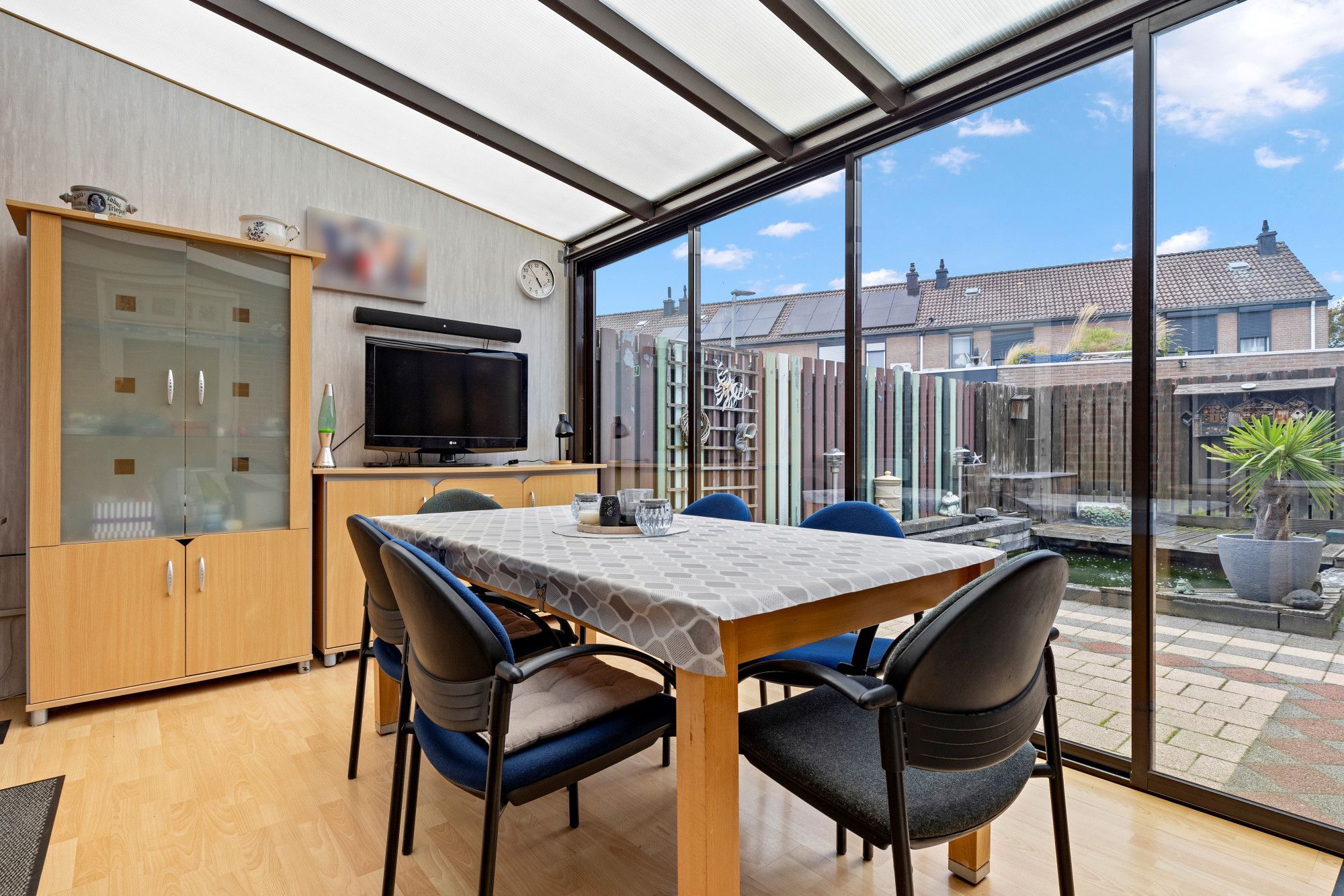 Op goede locatie gelegen keurig half vrijstaand geschakeld woonhuis met serre, ruime garage en tuin met vijverpartij en een achterom.