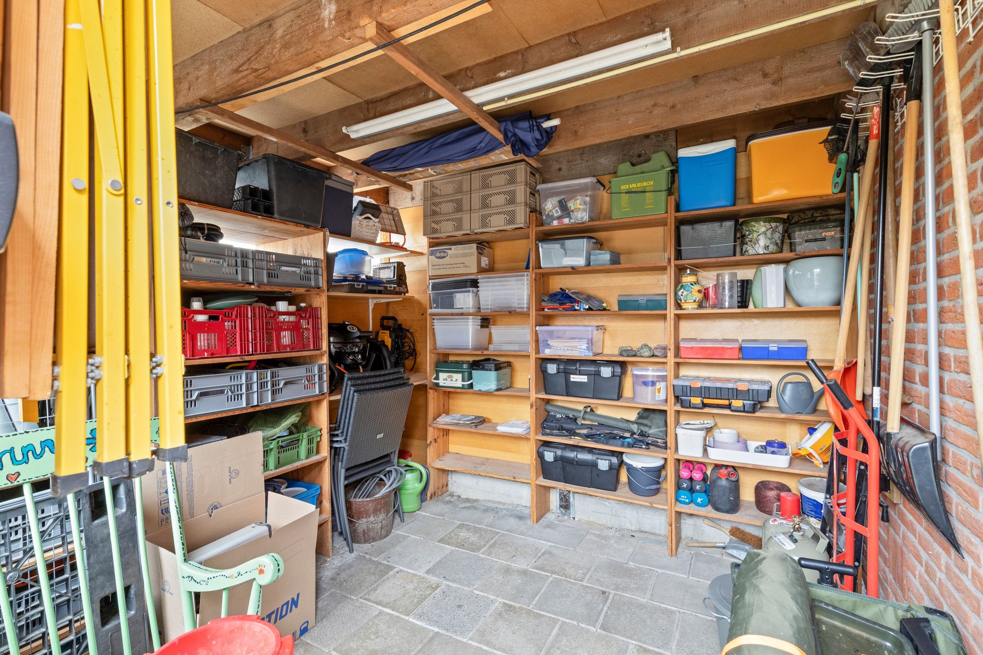 Geheel beklinkerde tuin met (KOI) vijver, houten tuinberging en een achterom.