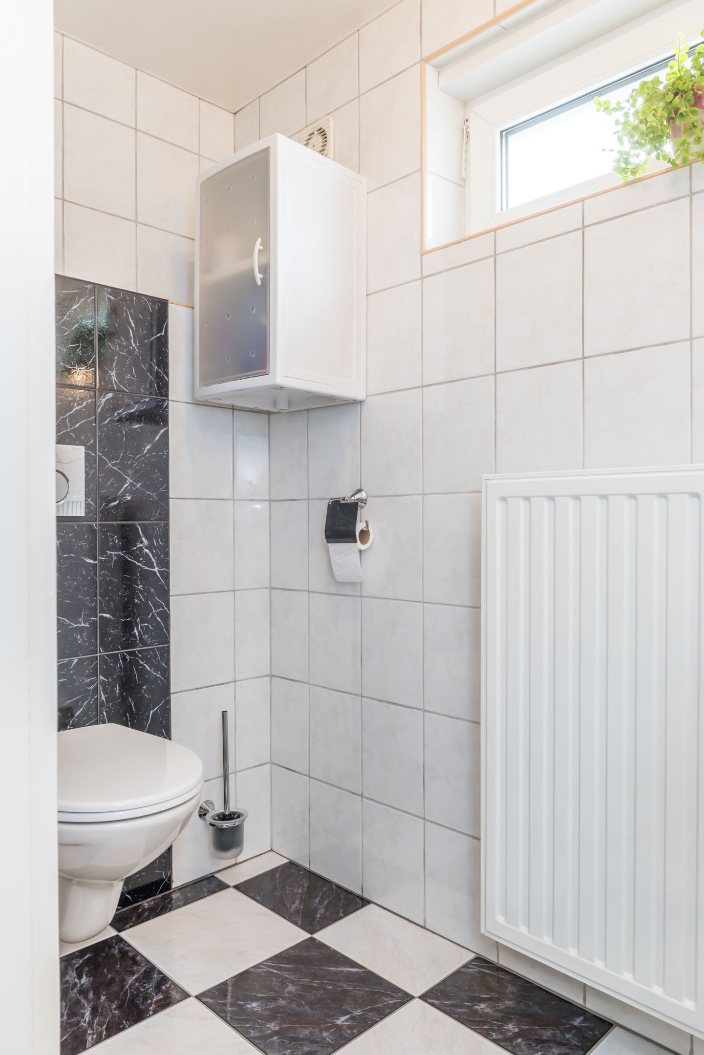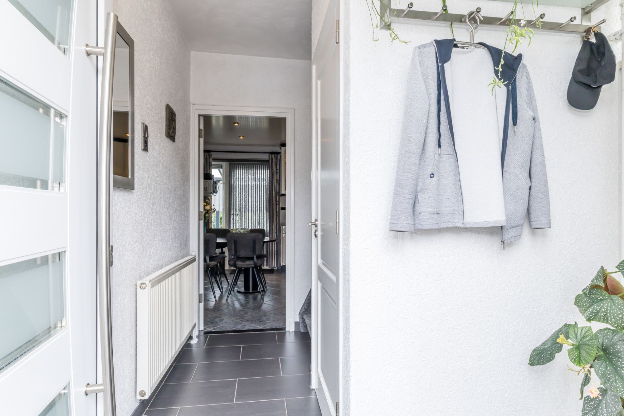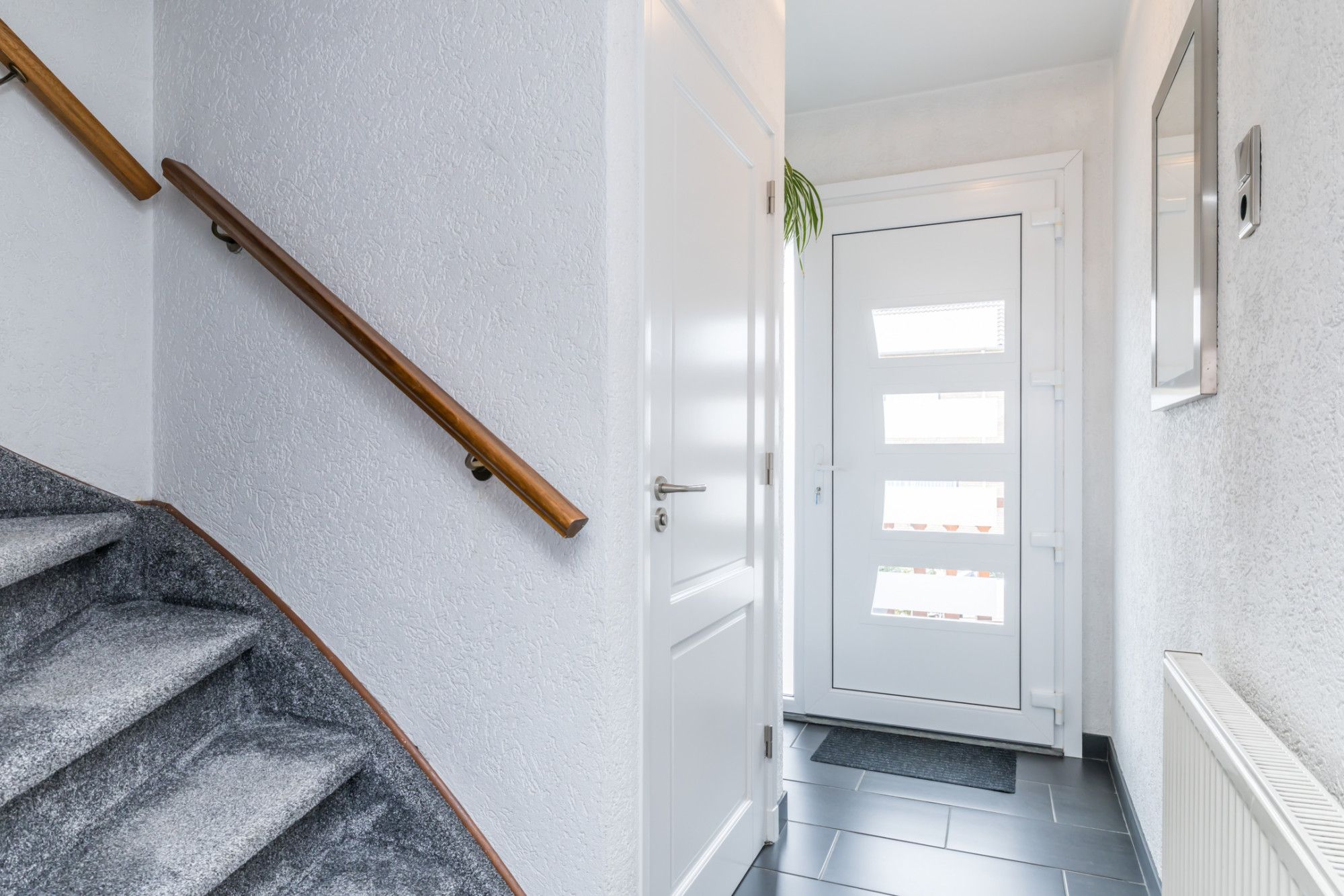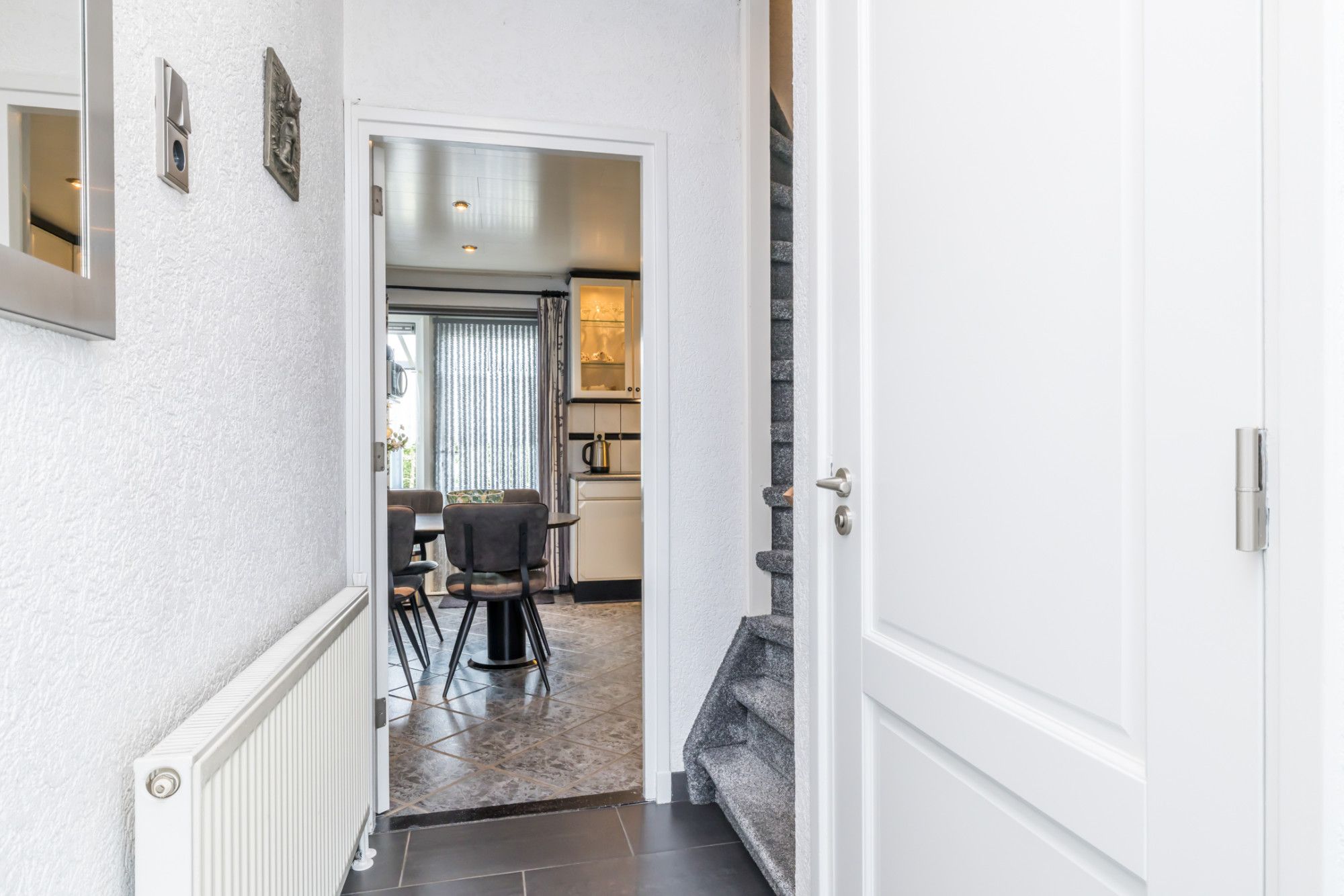 Hal/Entree, trappenhuis naar de verdieping. Geheel betegeld gastentoilet met zwevend wandcloset. Meterkast voorzien van een 4 groepsinstallatie / kookgroep / aardlekschakelaar / separate groep voor de zonnepanelen / dag-/nachtstroom en digitale meters. Toegang tot de woonkamer en keuken.