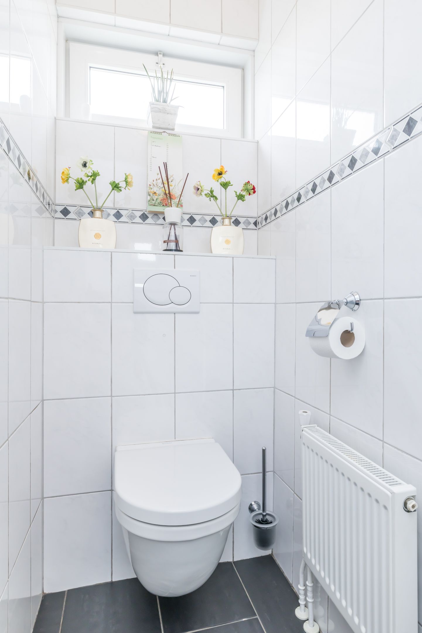 Het moderne gastentoilet met zwevend wandcloset is stijlvol en praktisch uitgevoerd.