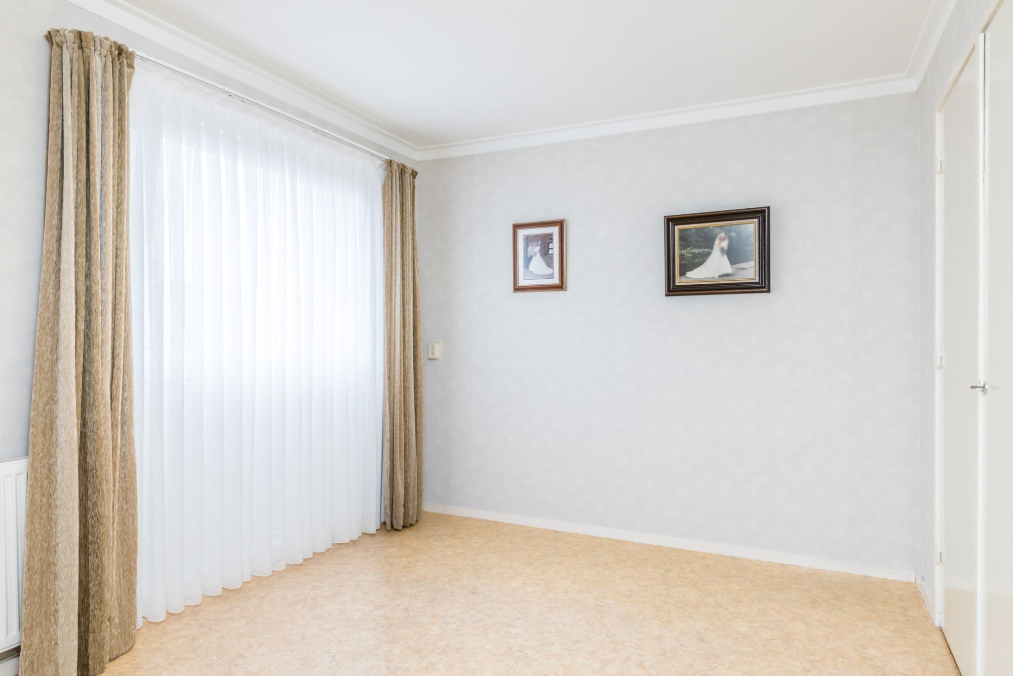 De slaapkamer aan de linker voorzijde heeft een dubbele kastenwand en is in gebruik als kleedkamer