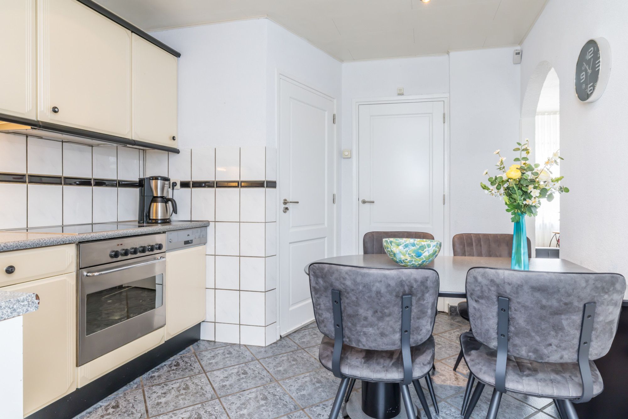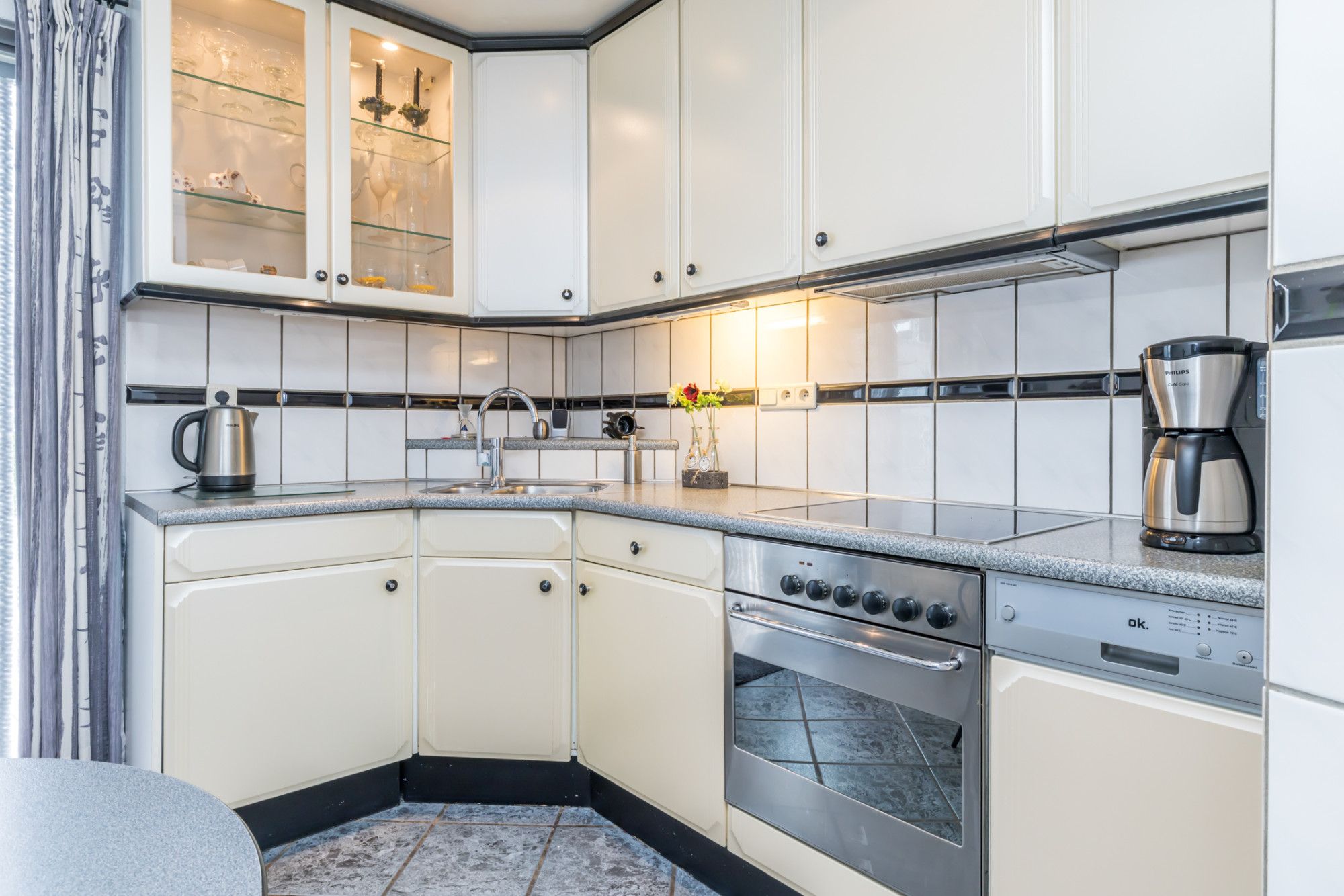 Een gesloten keukenruimte met een keurige inbouwkeuken, voorzien van apparatuur, te weten: 4 zones keramische kookplaat / afzuigkap / elektrische oven / wasbak / vaatwasmachine / koelkast en opbergruimte. Loopdeur naar het achtergelegen ruime terras met overkapping en de achtertuin.