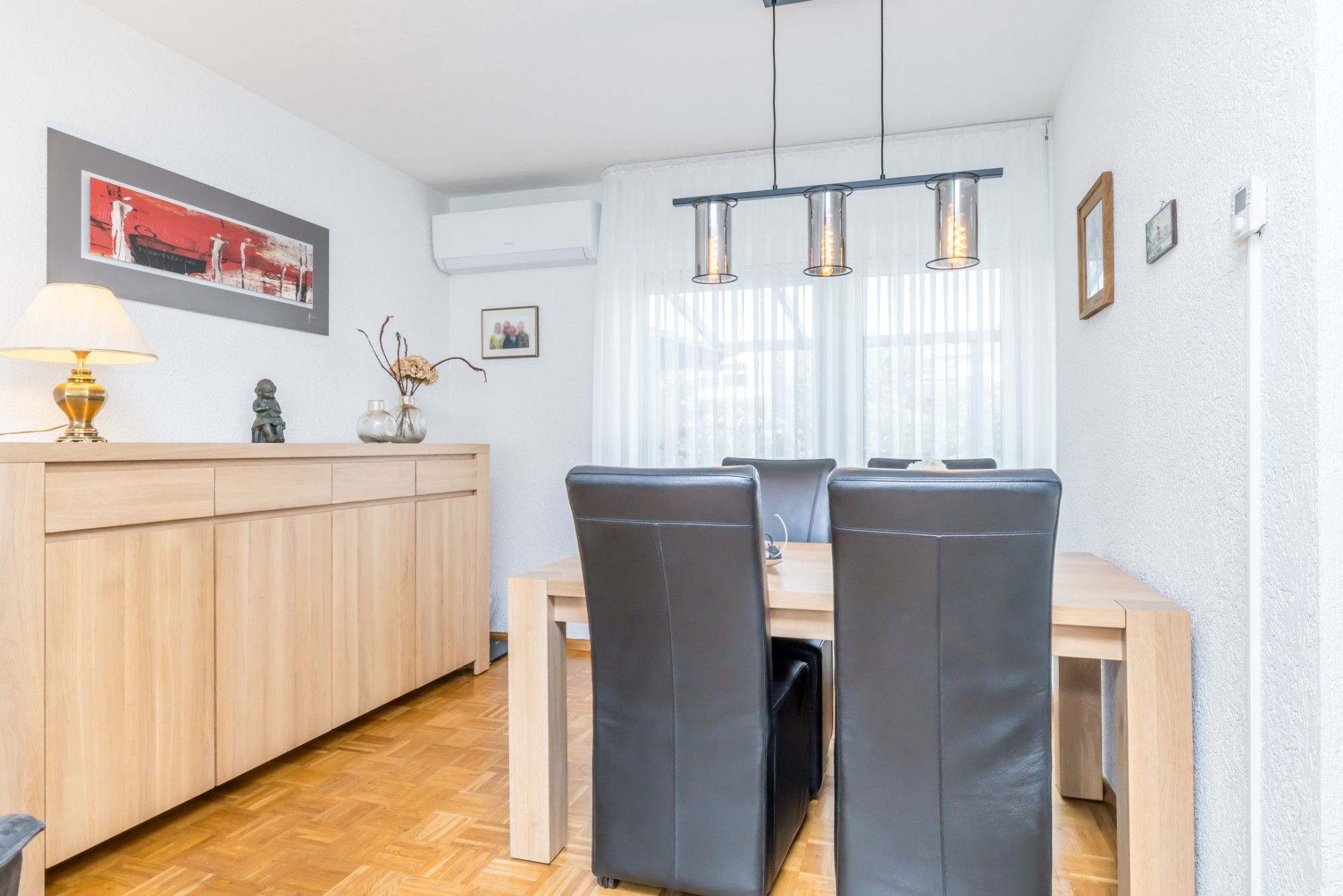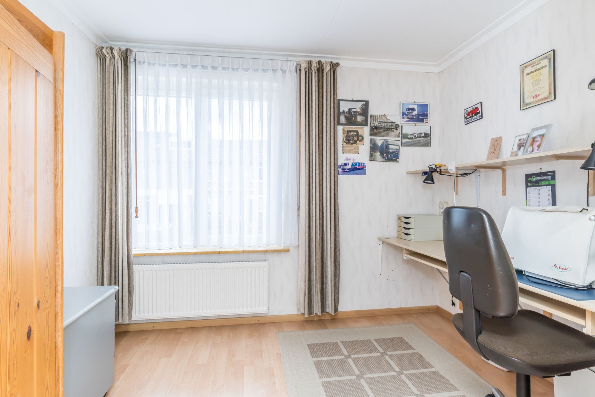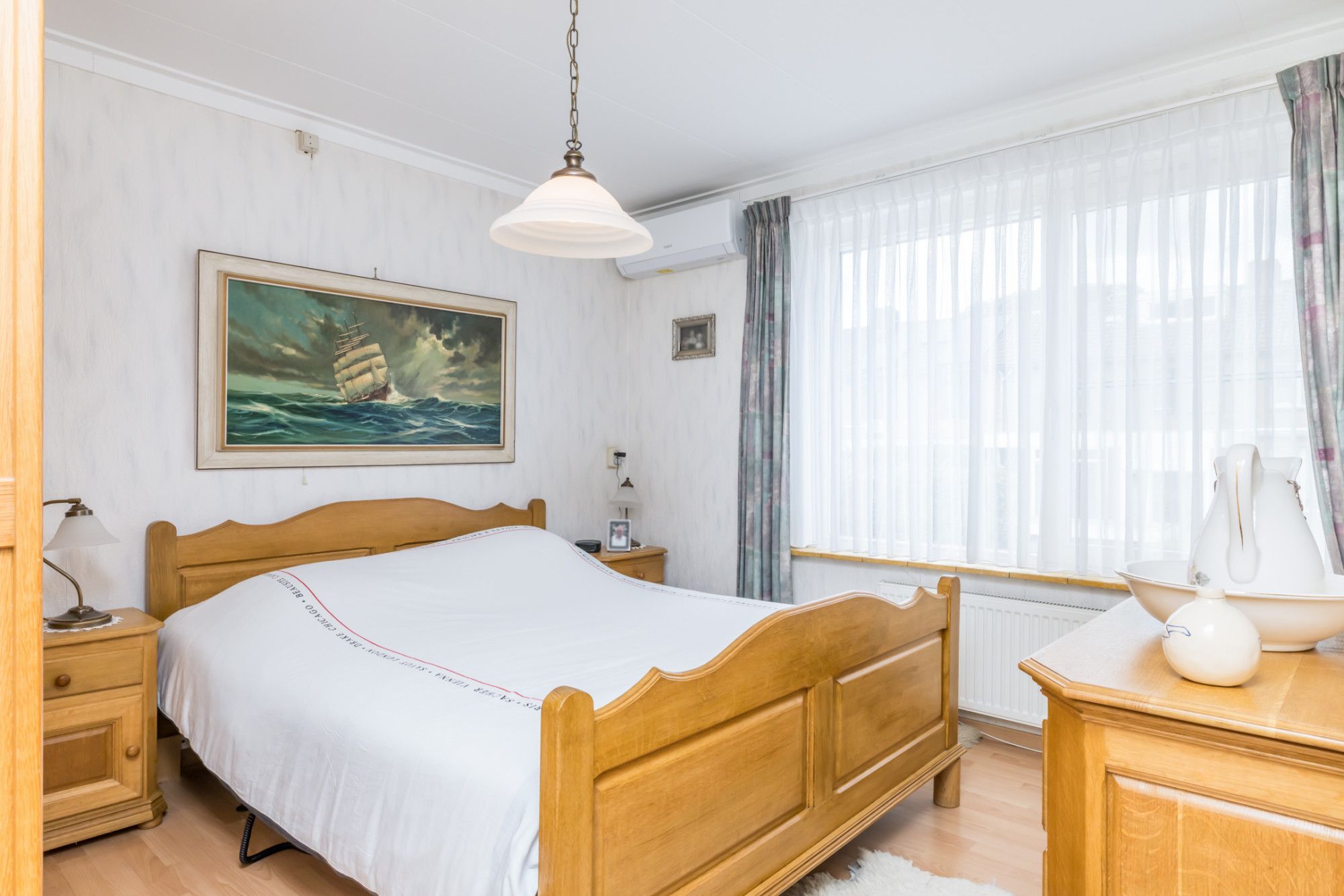 De hoofdslaapkamer, afgewerkt met een laminaatvloer, heeft een dubbele wandkast met veel opbergruimte en een airconditioningsinstallatie. De rechtsachter gelegen slaapkamer is in gebruik als hobbyruimte.