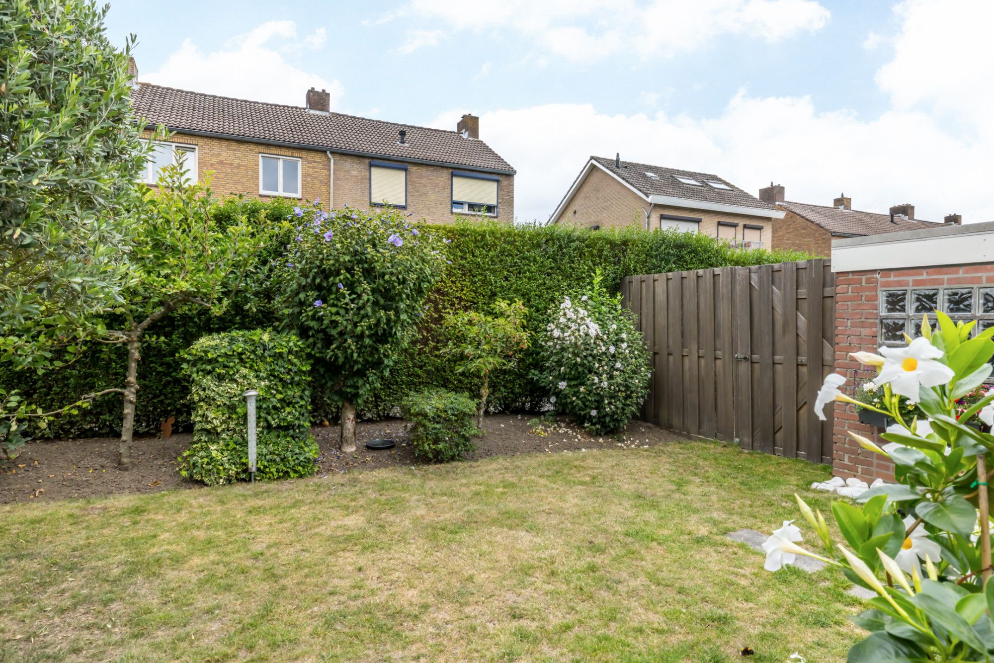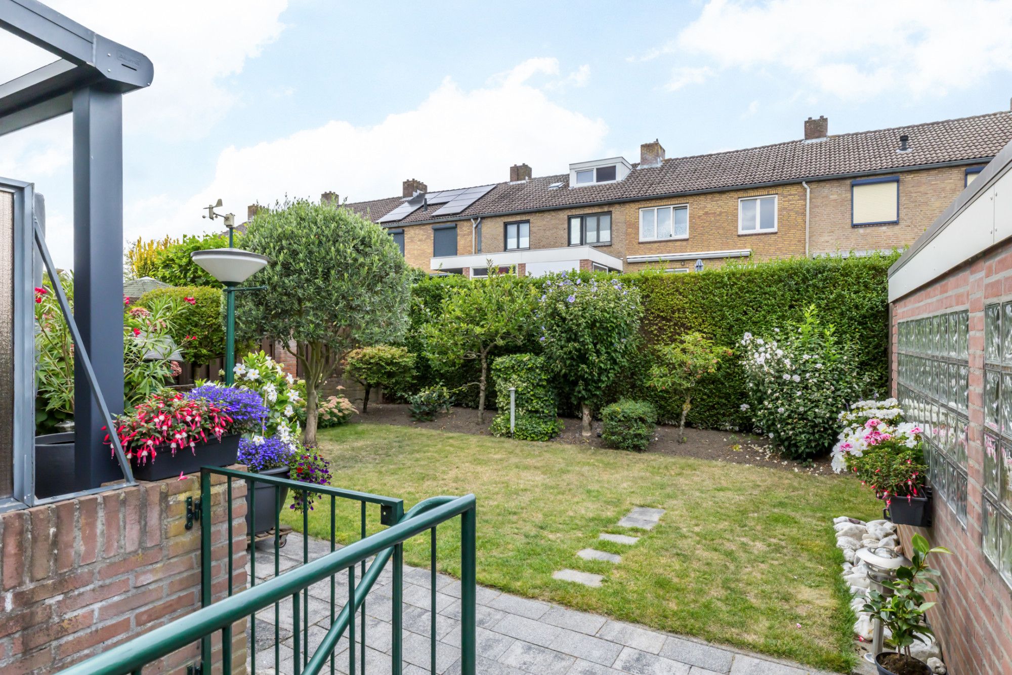 De brede achtertuin op het noordwesten biedt volop privacy en is verzorgd aangelegd met een ruim overdekt terras, een gazon, borders met aanplanting en een tuinberging. De tuin is tevens bereikbaar via een zijingang.