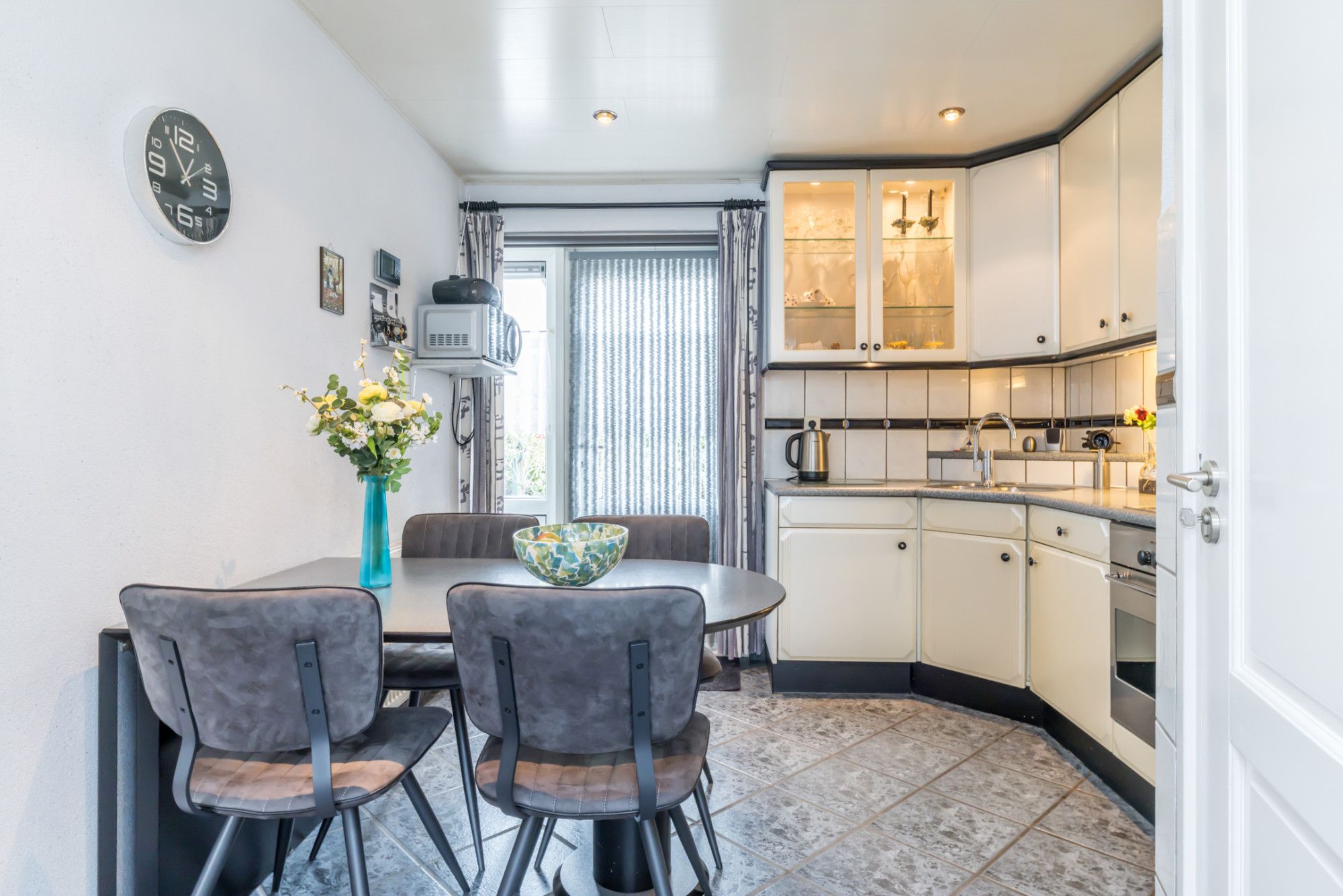 In de gesloten keukenruimte is een keurige inbouwkeuken geplaatst, voorzien van apparatuur. Een loopdeur biedt toegang tot het terras en de achtertuin. Vanuit de keuken is tevens het souterrain bereikbaar.