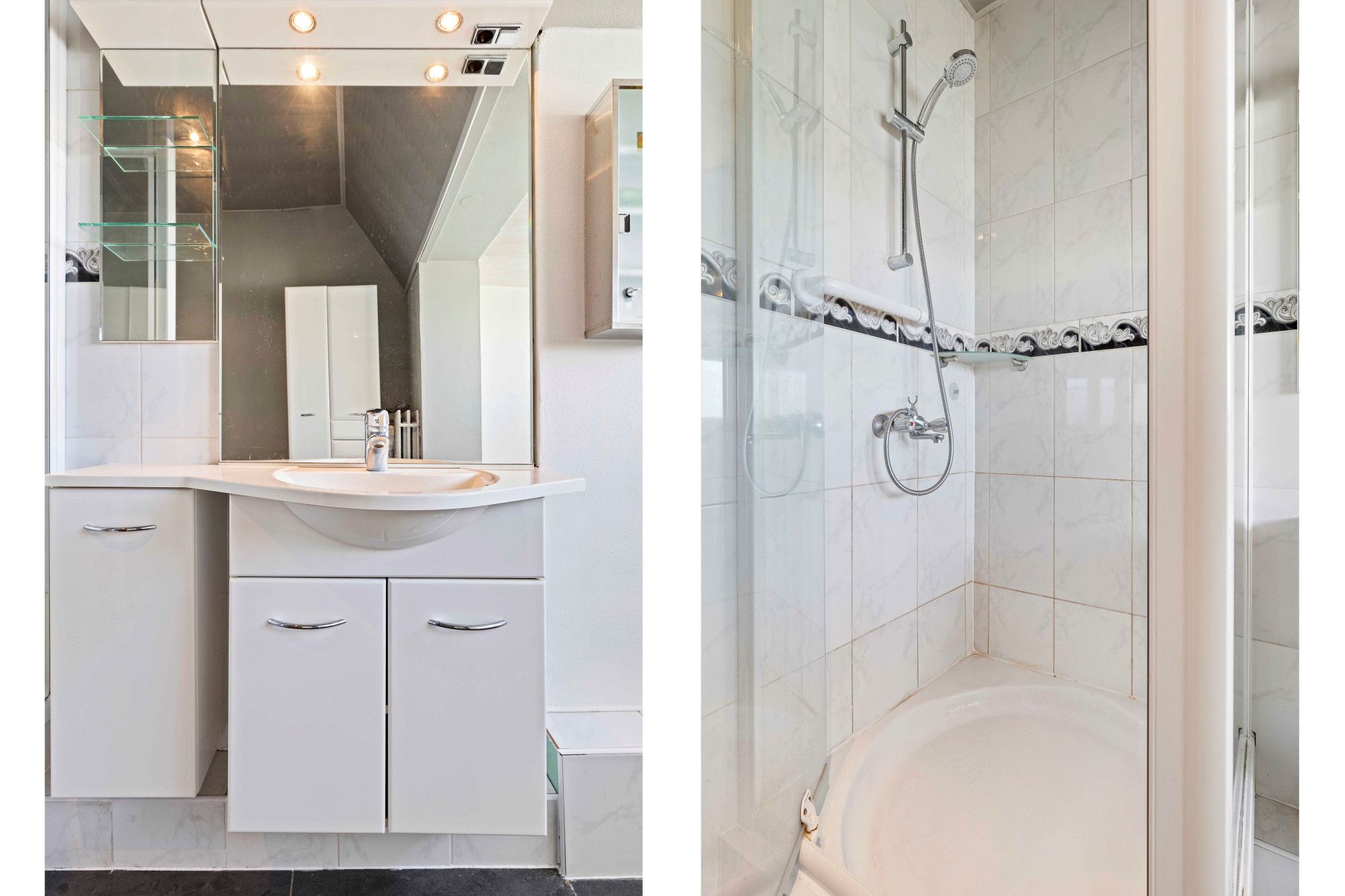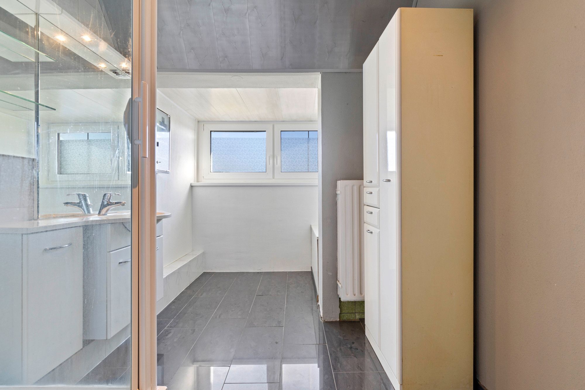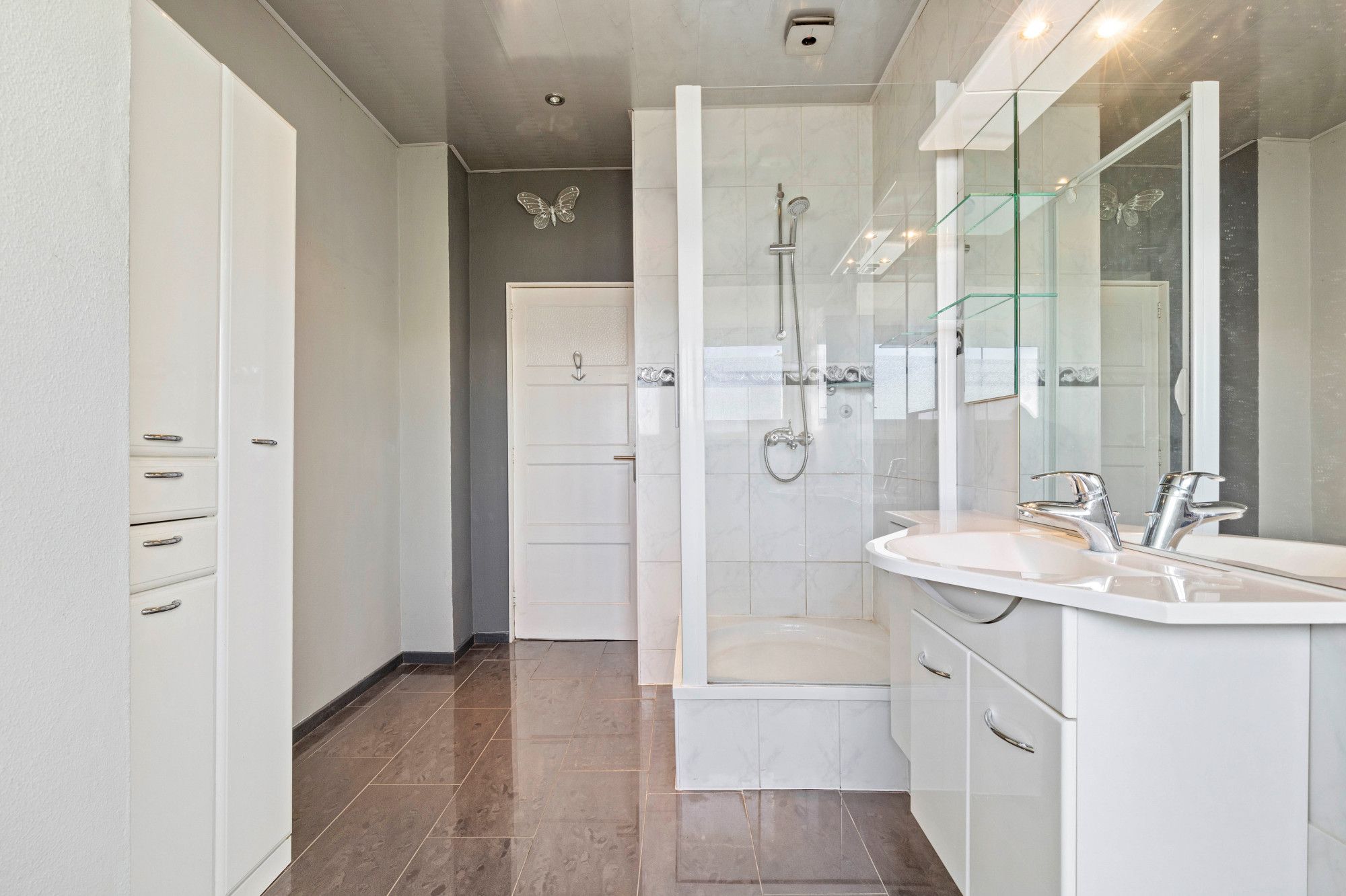 Overloop. Bergkast. Drie slaapkamers afgewerkt met laminaatvloeren. Licht betegelde badkamer douche, badmeubel met wastafel en inbouwverlichting.
