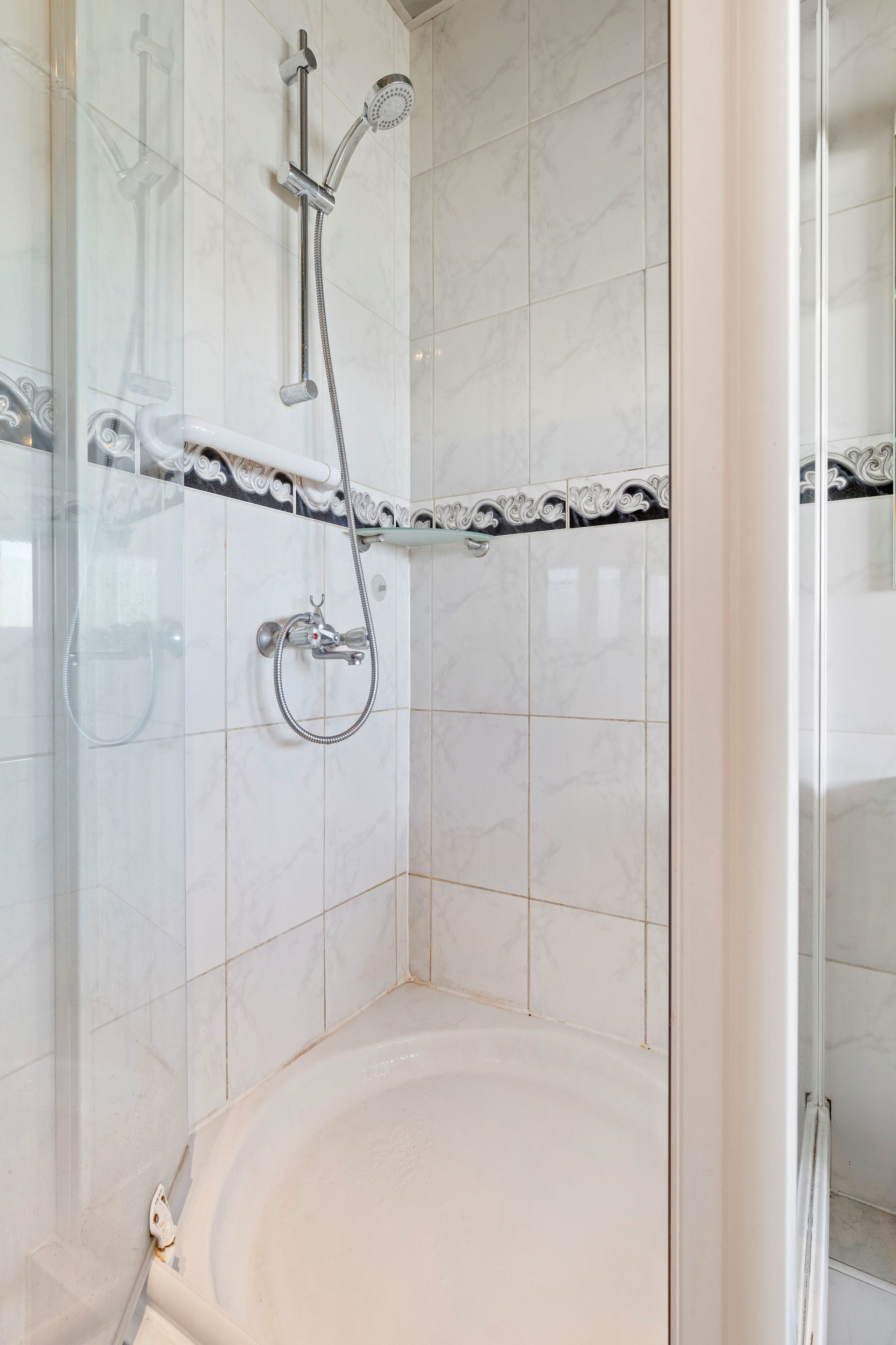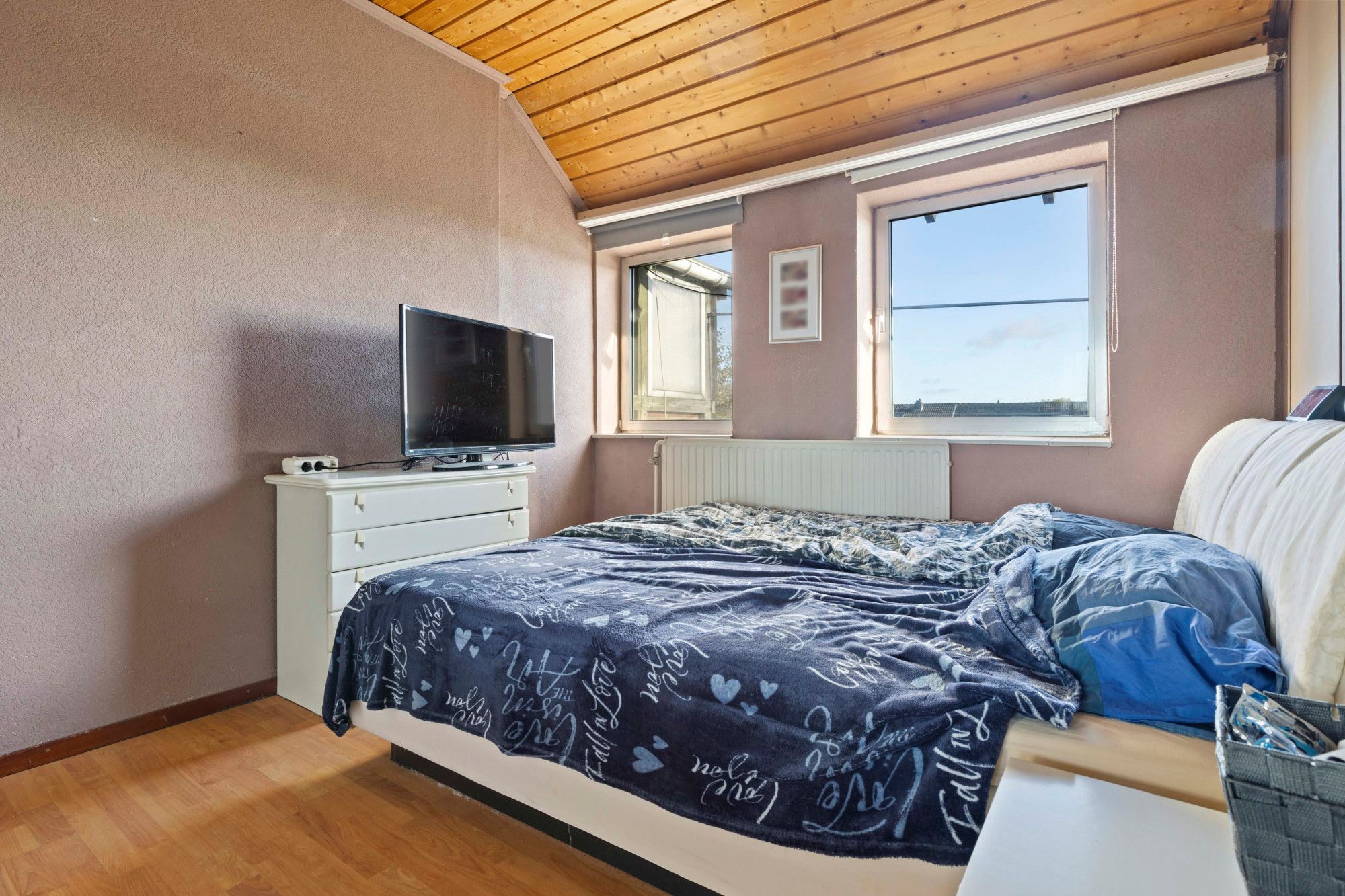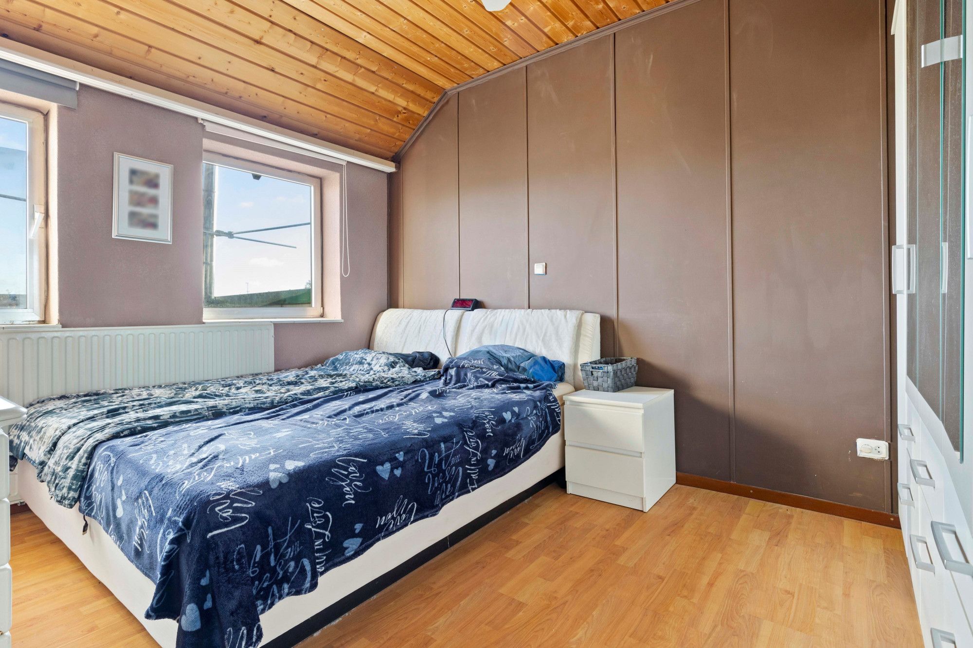 Overloop. Bergkast. Drie slaapkamers afgewerkt met laminaatvloeren. Licht betegelde badkamer douche, badmeubel met wastafel en inbouwverlichting.