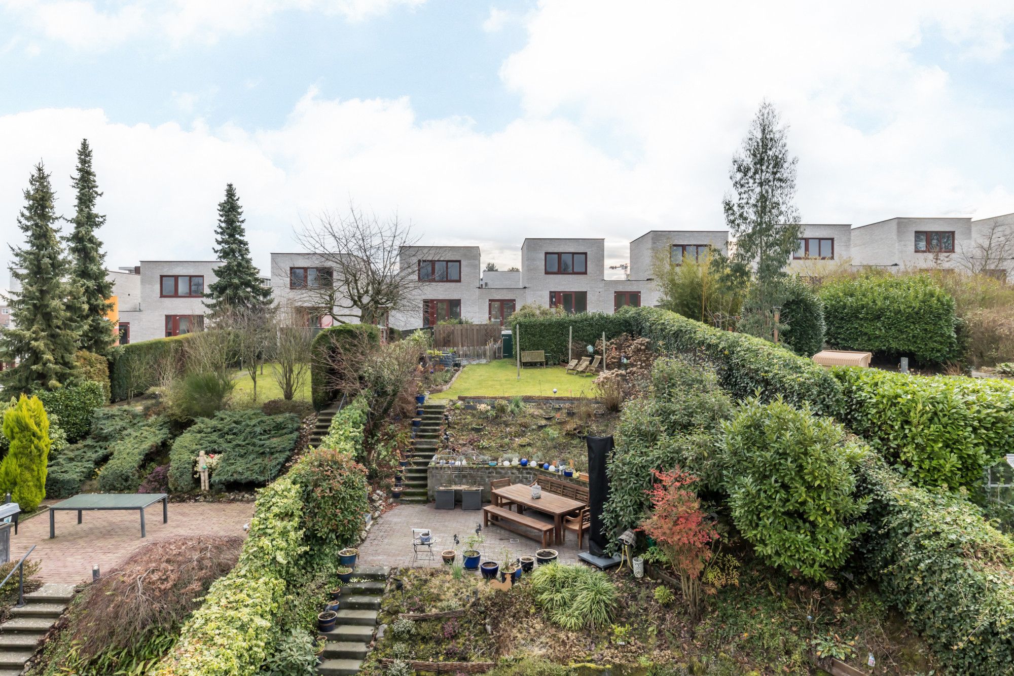 * VERZORGDE ACHTERTUIN MET TERRASSEN, GAZON, BORDERS MET AANPLANTING EN TUINBERGING